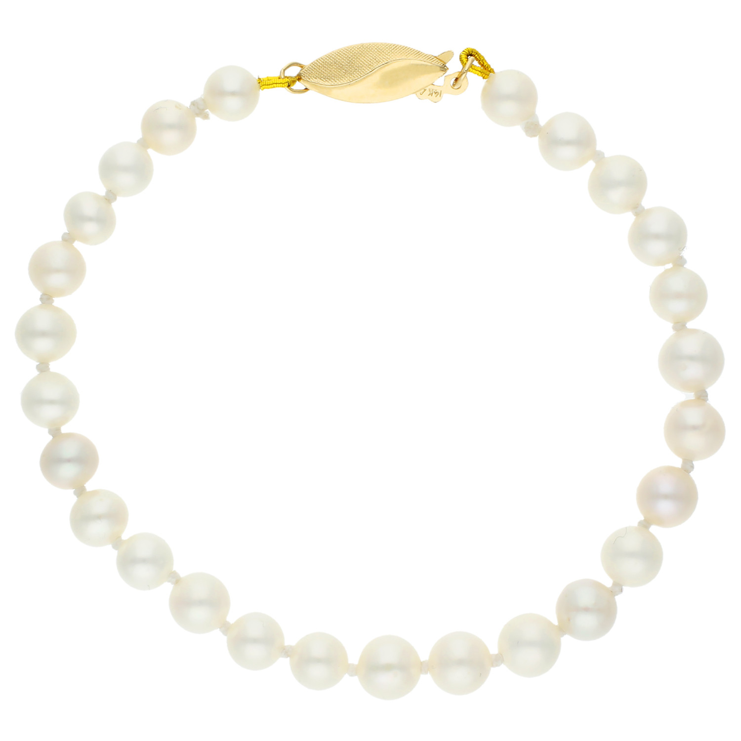 These delightful shimmering freshwater cultured pearls are hand strung and assembled with a 14ct yellow gold clasp creating a fabulous and pretty bracelet. A beautiful adornment to wear with any outfit and perfect to team up with the matching necklace. A lovely gift for a pearl occasion, a wedding ensemble or a graduation.