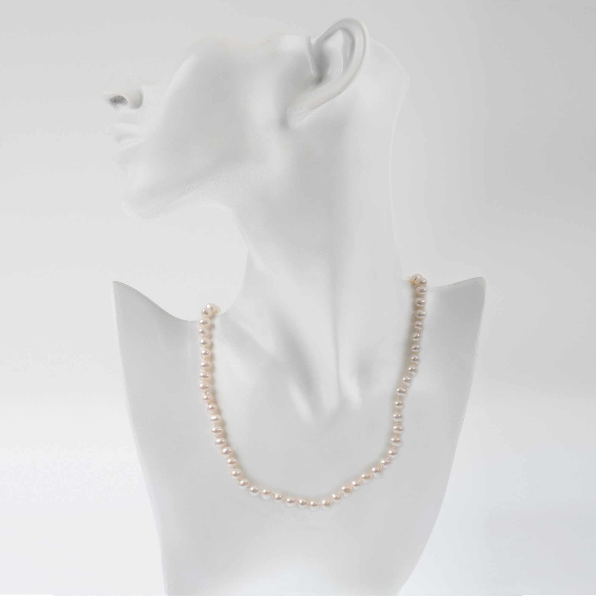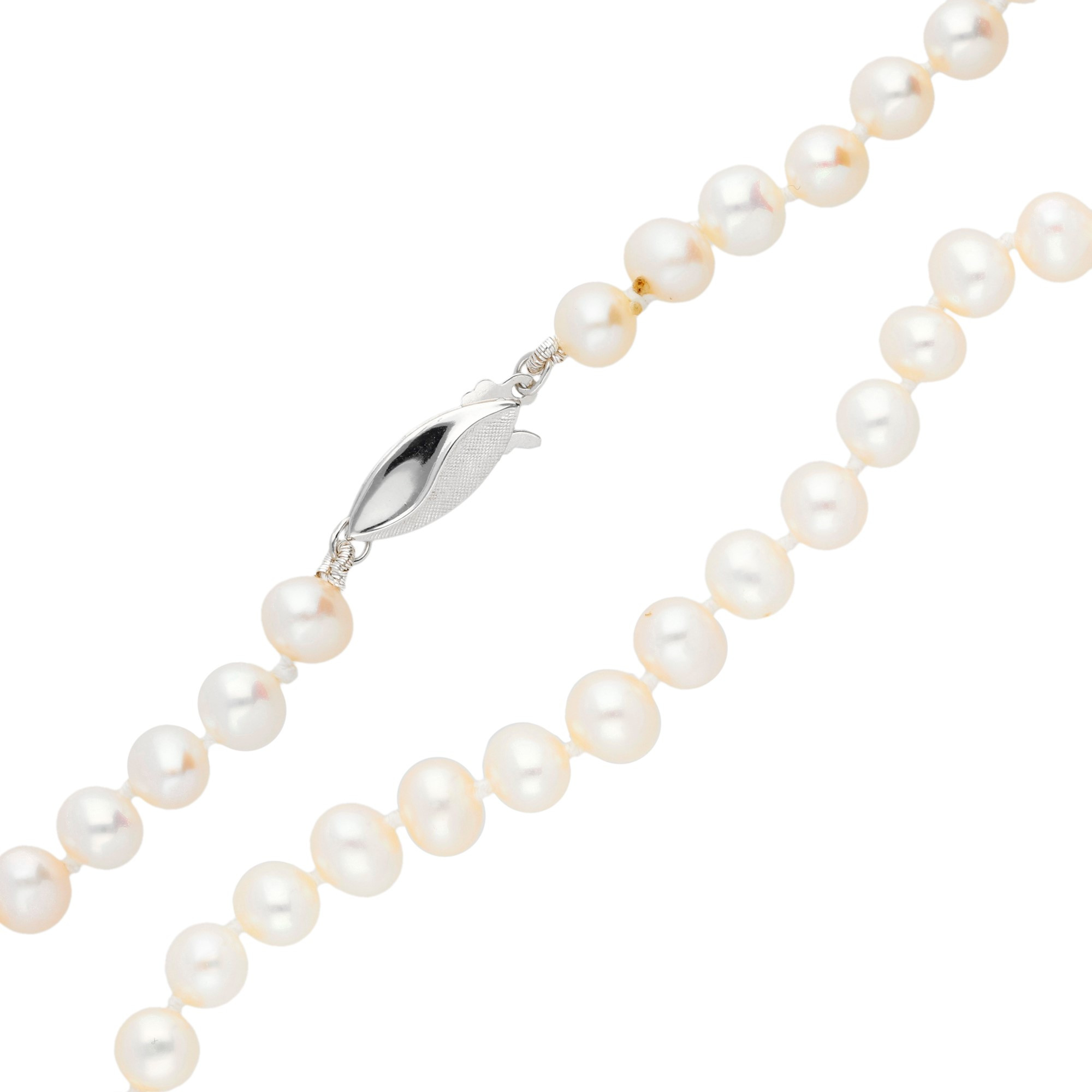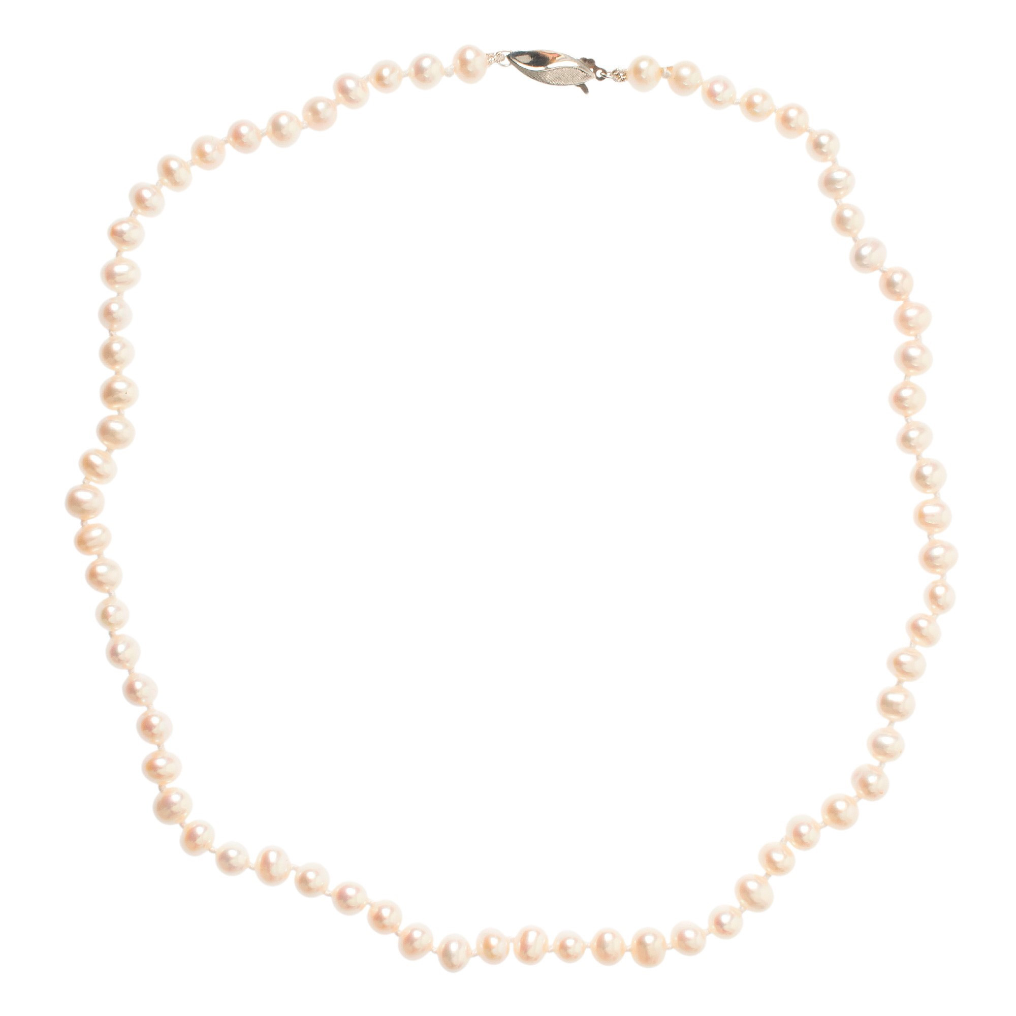 Elevate your jewellery repertoire with our luxurious 14ct White Gold Freshwater Pearl Necklace. This stunning piece features an array of high-lustre freshwater pearls, each one handpicked for its quality and beauty. The necklace is secured with an intricately designed leaf-shaped clasp in white gold, adding an artistic touch to the classic pearl string. This design not only ensures security but also serves as a striking focal point. Ideal for both formal and casual wear, this pearl necklace adds a sophisticated flair to any outfit and is perfect for those who appreciate the finer things in life. Treat yourself or a loved one to this exquisite necklace, a symbol of purity and a staple of refined elegance.
