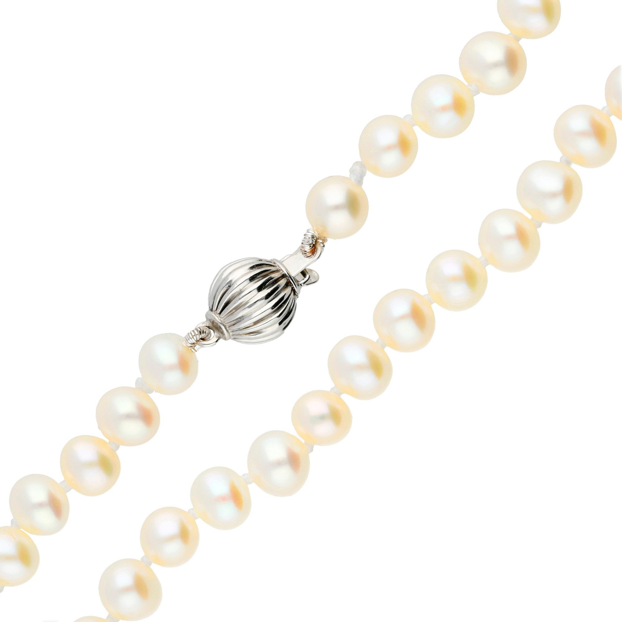 Elevate your style with our stunning 14ct White Gold Freshwater Pearl Necklace, where classic charm meets contemporary design. This necklace boasts a string of high-quality freshwater pearls, known for their exceptional lustre and uniformity. The closure of this exquisite piece features a distinctive corrugated ball-shaped clasp in white gold, providing a secure fit while enhancing the overall aesthetic with its unique texture and shine. Ideal for those who value elegance and quality, this pearl necklace is perfect for weddings, anniversaries, or as a sophisticated accessory for business or casual attire. Make this timeless piece a treasured part of your jewellery collection or a thoughtful gift for someone special.