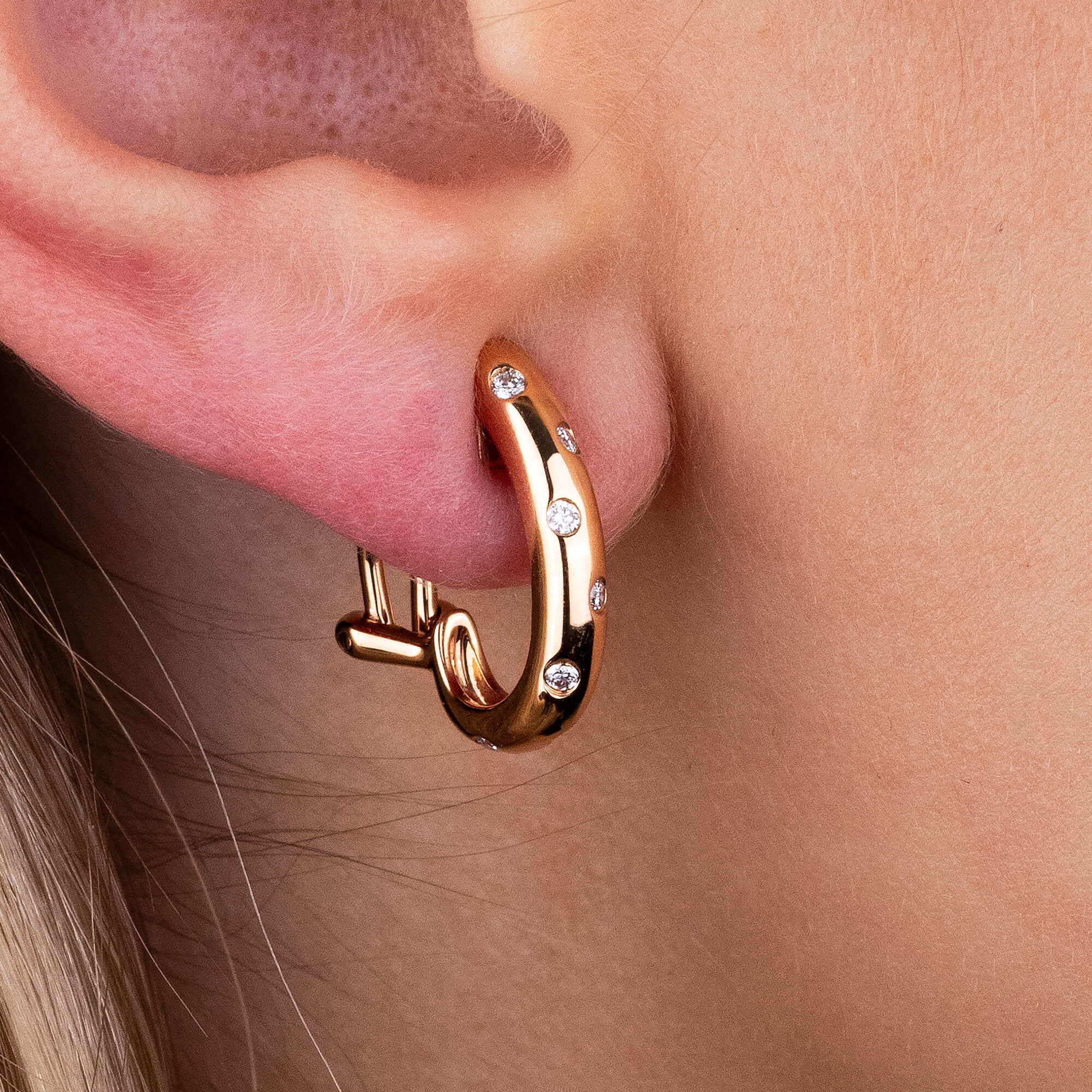 Enhance your style with our 18ct Rose Gold Diamond Hoop Earrings. These exquisite earrings feature a partial hoop design, adorned with scattered diamonds that add a touch of sparkle and elegance. The warm hue of rose gold beautifully complements the brilliance of the diamonds, creating a sophisticated and modern look. Designed for women who appreciate fine jewellery, these hoops come with secure post and lever back fastenings for comfortable and reliable wear. Perfect for any occasion, from everyday elegance to special events, these diamond hoop earrings are a versatile addition to your jewellery collection. Experience the timeless charm and contemporary allure of these 18ct rose gold diamond hoop earrings.