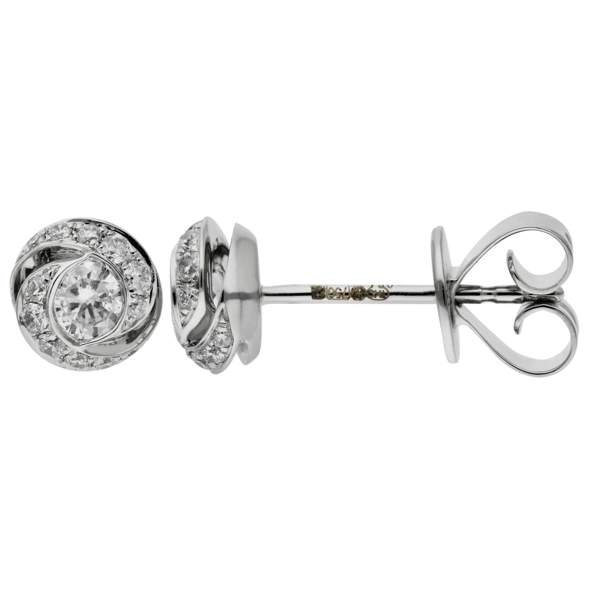 Experience the enduring charm of our 18ct white gold stud earrings, designed with a stunning swirl cluster motif. Each earring presents an elegant composition of two diamond-encrusted swirls that encircle a central brilliant-cut diamond, collectively weighing 0.38ct. This intricate design not only captivates but also scintillates with every movement, reflecting light beautifully.