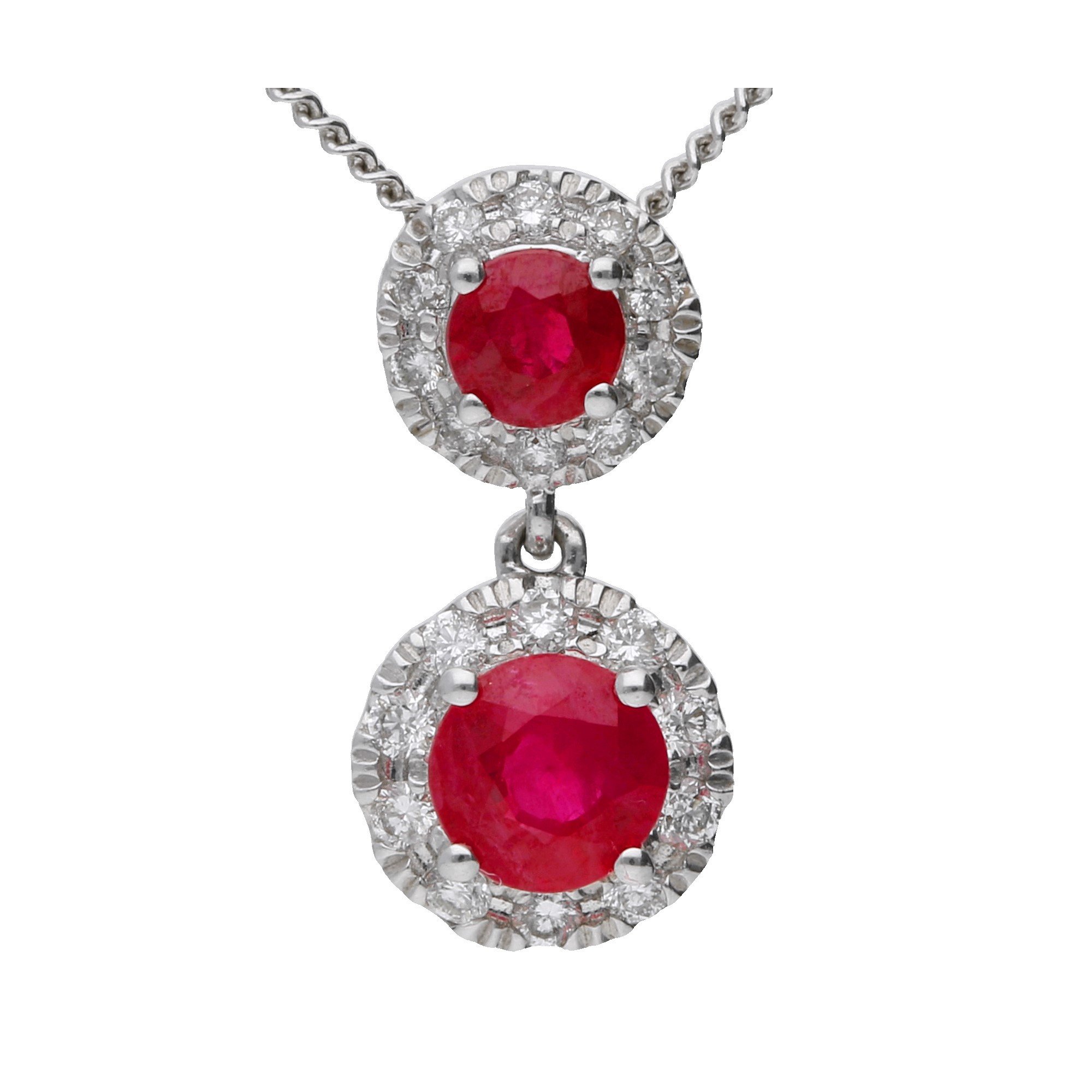Elevate your jewellery wardrobe with this exquisite ruby and diamond pendant. Available now, indulge in the seamless fusion of allure and elegance that this opulent 18ct white gold double cluster pendant offers.