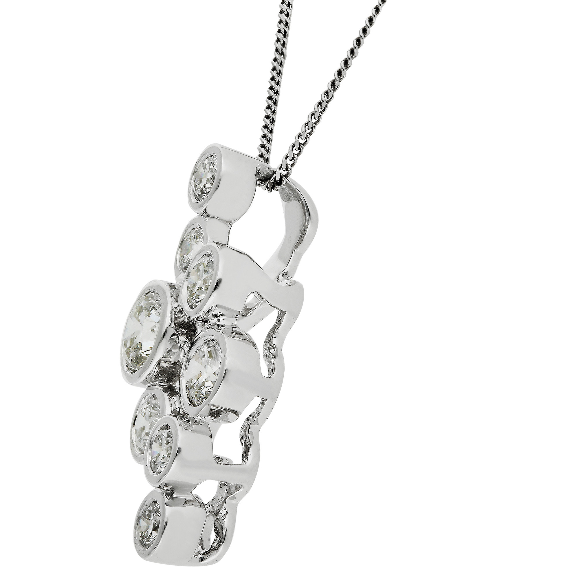 Add a touch of brilliance to your jewellery collection with this exquisite 18ct white gold diamond pendant. Designed in the elegant bubble style, the pendant features a cluster of round brilliant cut diamonds, each securely bezel set to enhance its sparkle and beauty. This contemporary design offers a modern yet refined look that is perfect for all occasions.