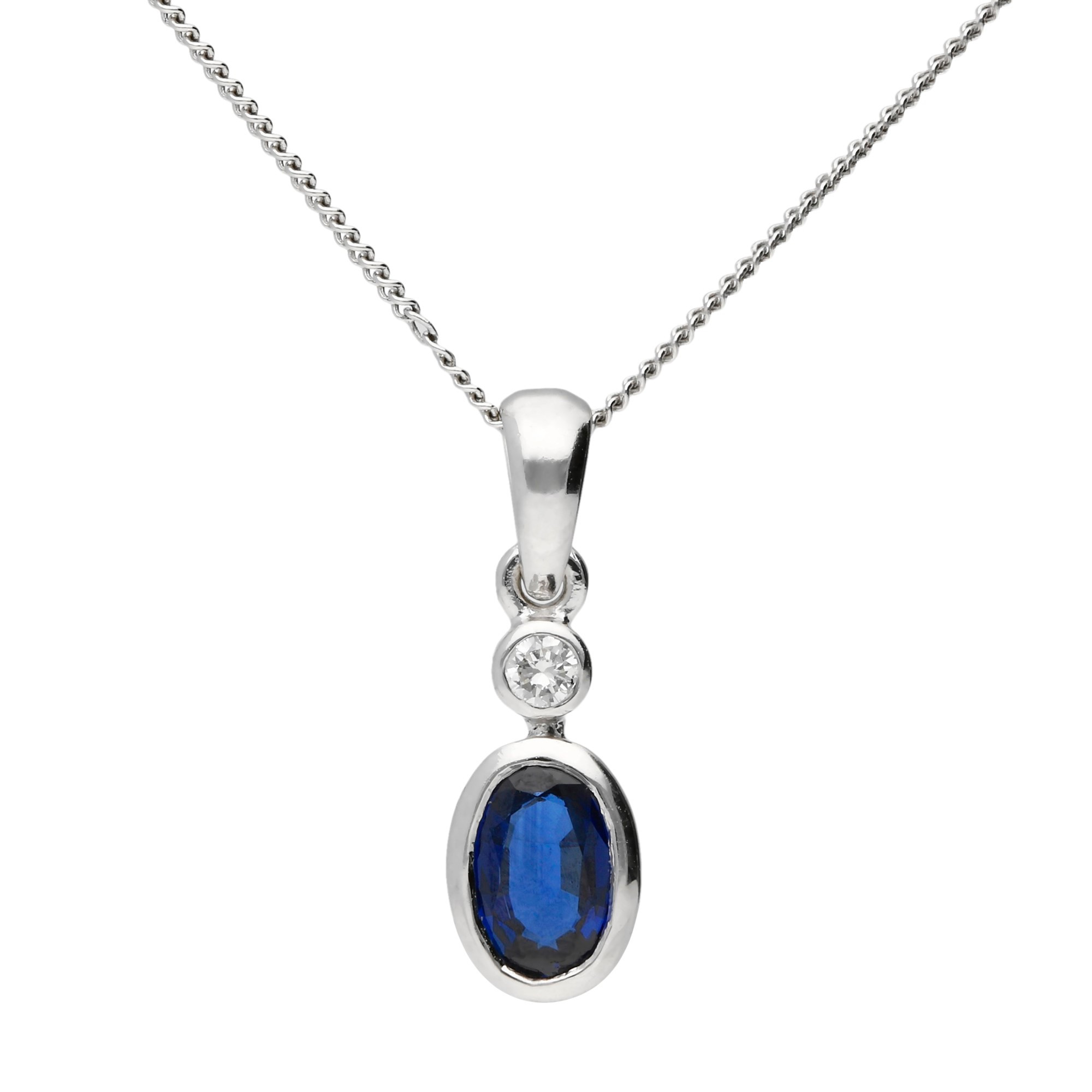 This stunning 18ct white gold pendant showcases a 0.45ct oval faceted sapphire, securely bezel set beneath a dazzling round brilliant cut diamond. Both gemstones are framed in sleek white gold, creating a seamless and elegant look. The polished bail allows the pendant to hang gracefully from its matching chain, with options for different lengths to suit your preference. Whether worn for a formal event or as a chic accessory for everyday outfits, this sapphire and diamond pendant exudes sophistication and timeless beauty. Ideal as a gift or a personal treat, it is sure to become a cherished piece in any jewellery collection.
