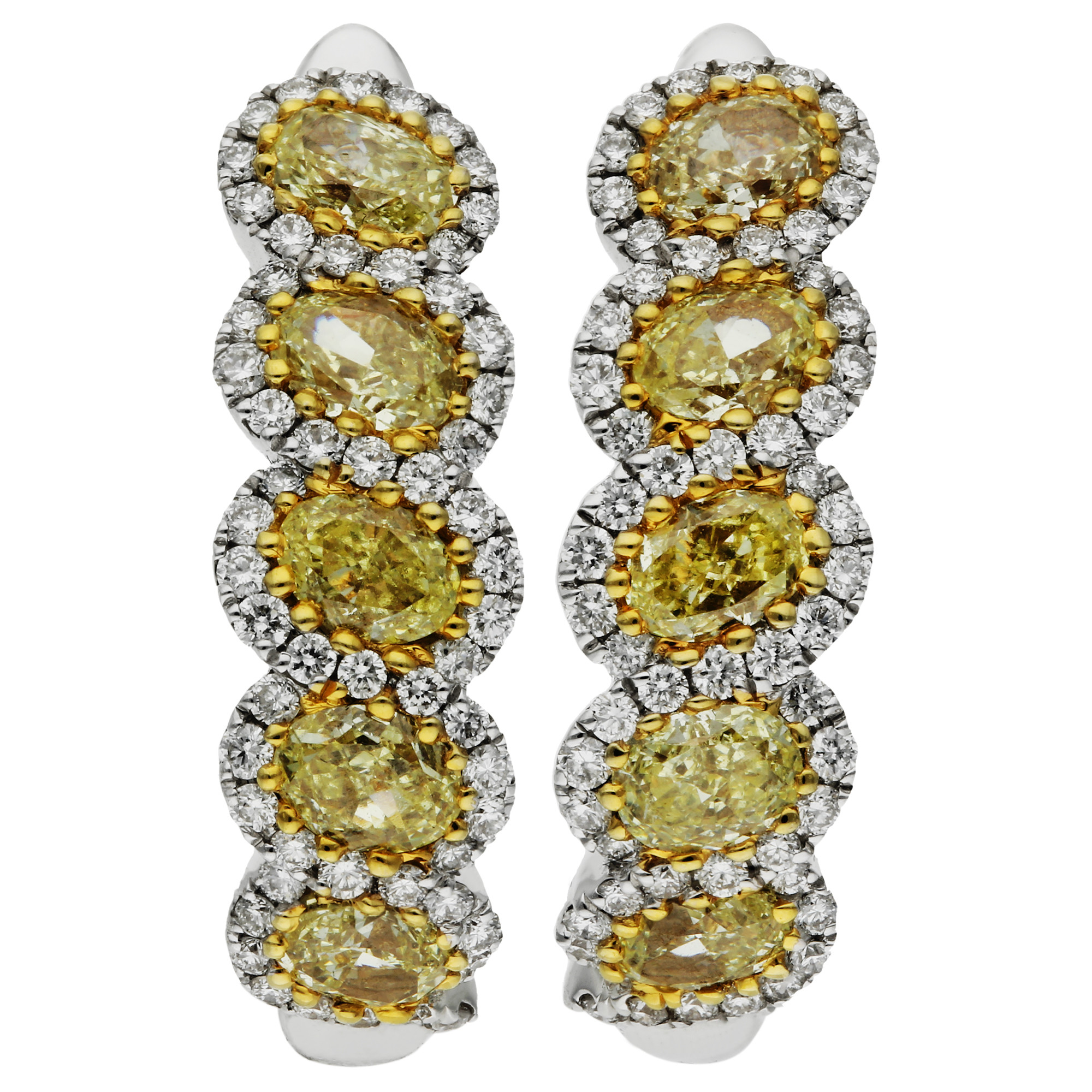 Elevate your jewellery collection with our exquisite 18ct white gold hoop earrings, each adorned with a 1.32ct oval faceted yellow diamond. These earrings showcase a unique spiral wave pattern, with each wave intricately set with tiny diamonds that encircle the yellow diamonds claw set in yellow gold. The design exudes luxury and refinement, with the polished white gold at the back of the hoops providing a sleek, modern finish. These hinged hoop earrings offer both beauty and functionality, perfect for those who appreciate elegant design and exceptional craftsmanship. Ideal for formal events or as a standout accessory for everyday wear, these earrings are sure to impress and enchant.