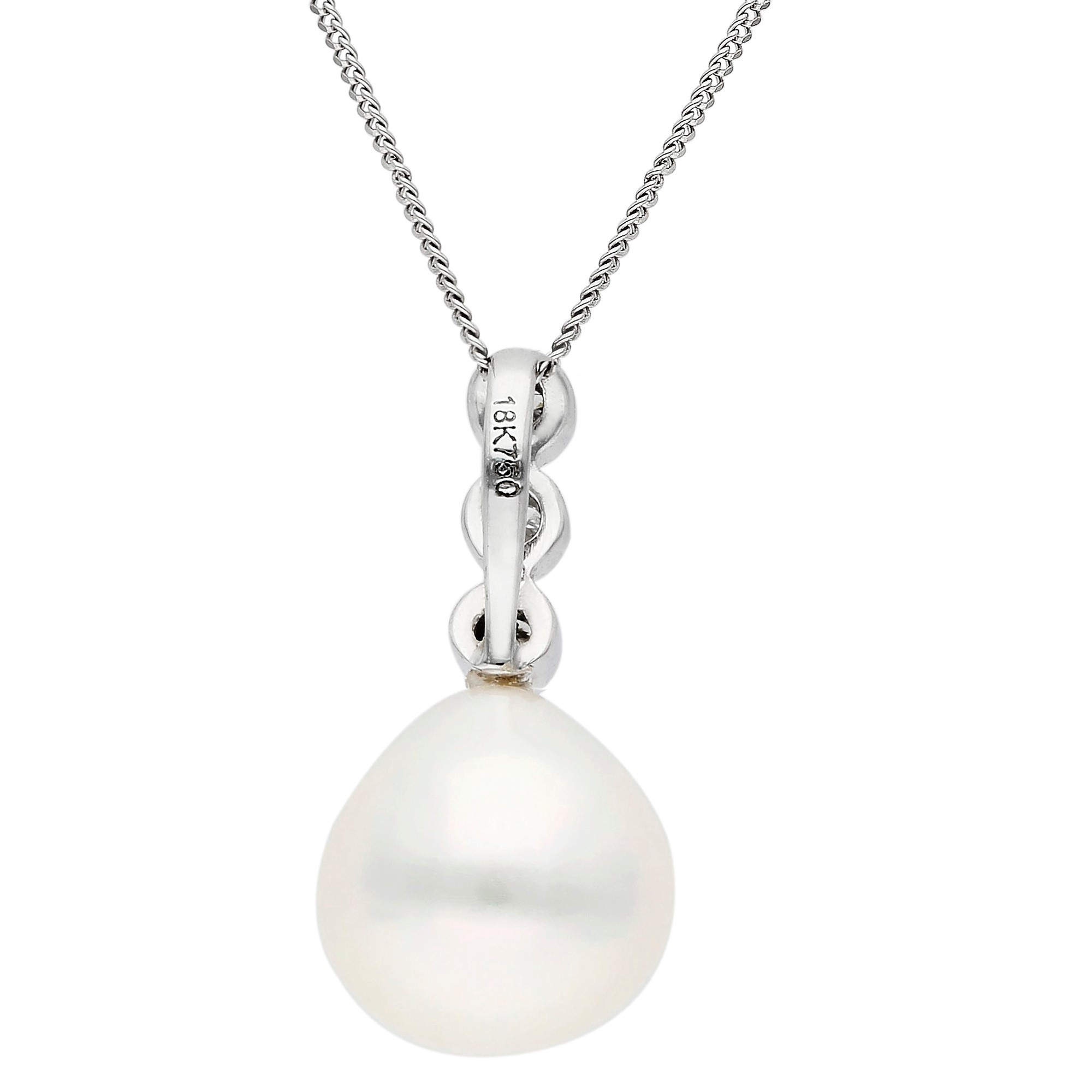 Elevate your style with our stunning 18ct white gold pearl and diamond pendant. At the heart of this elegant design lies a rich, cultured river pearl, cradled beneath a line of three dazzling, bezel set diamonds. Each diamond is expertly chosen for its brilliance, enhancing the natural sheen of the pearl with a radiant glow. The pendant dangles from a sleek white gold chain, making it a versatile piece for both formal and casual settings. It's a sophisticated choice for those who appreciate the finer things in life, offering a blend of luxury and timeless appeal. Perfect for special occasions or as an exquisite gift, this diamond and pearl pendant is sure to delight anyone with a penchant for refined jewellery.