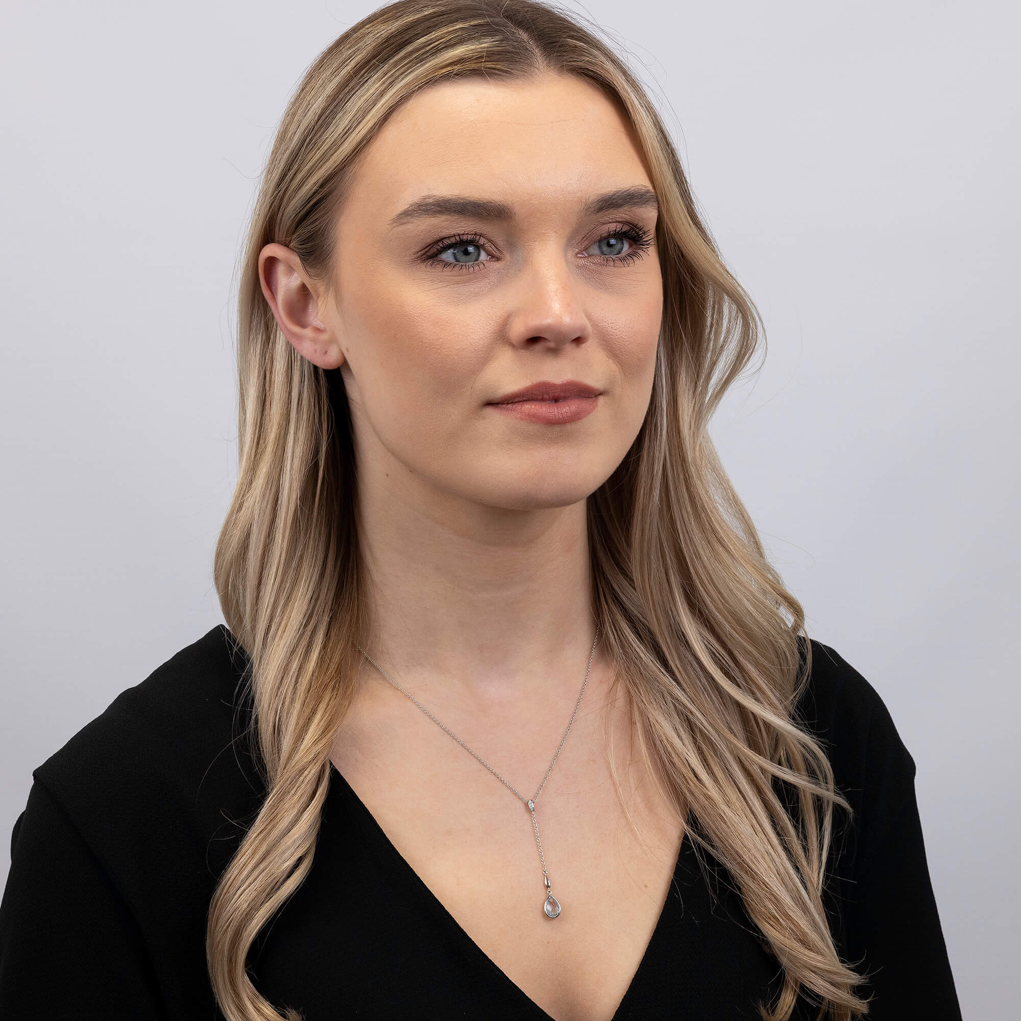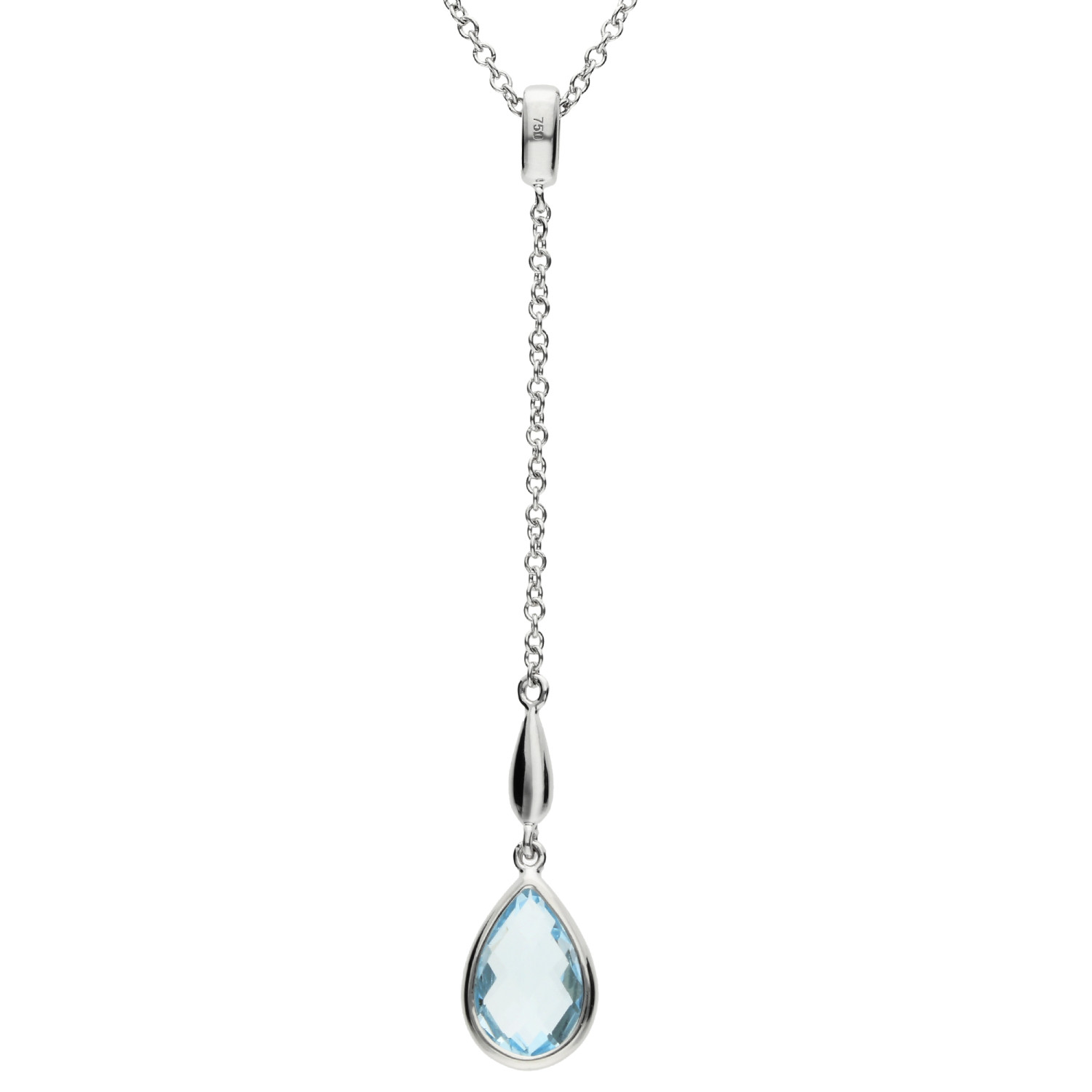 Elevate your jewellery collection with this luxurious 18ct white gold diamond and blue topaz necklace. The pendant features a beautifully bezel-set 1.48ct teardrop blue topaz, renowned for its vibrant clarity and mesmerizing colour. It hangs elegantly from a lariat-style chain, accented with a diamond-encrusted bail that complements the brilliance of the topaz. This necklace is a masterpiece of fine craftsmanship, blending classic elegance with modern sophistication. Perfect for enhancing any outfit, it serves as a stunning focal point or a thoughtful gift for someone special. Embrace the serene beauty of blue topaz and the refined sparkle of diamonds with this exquisite necklace.