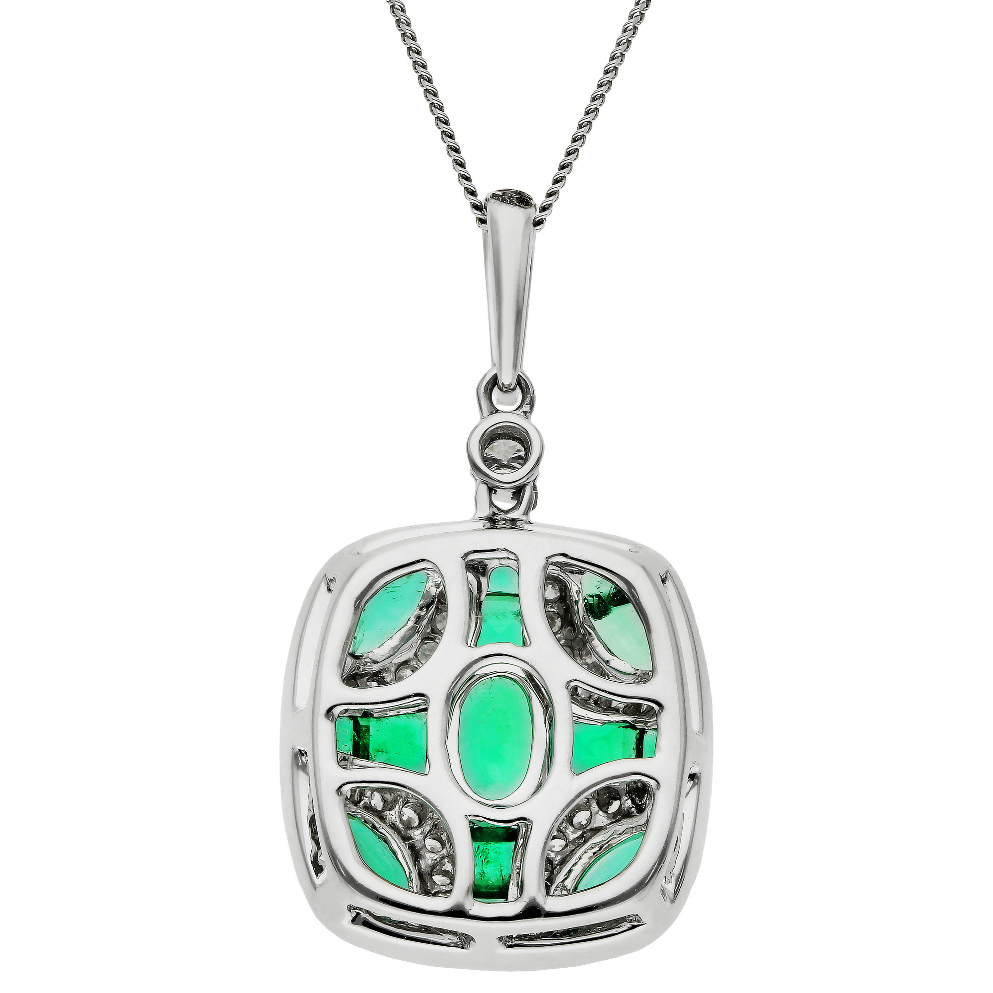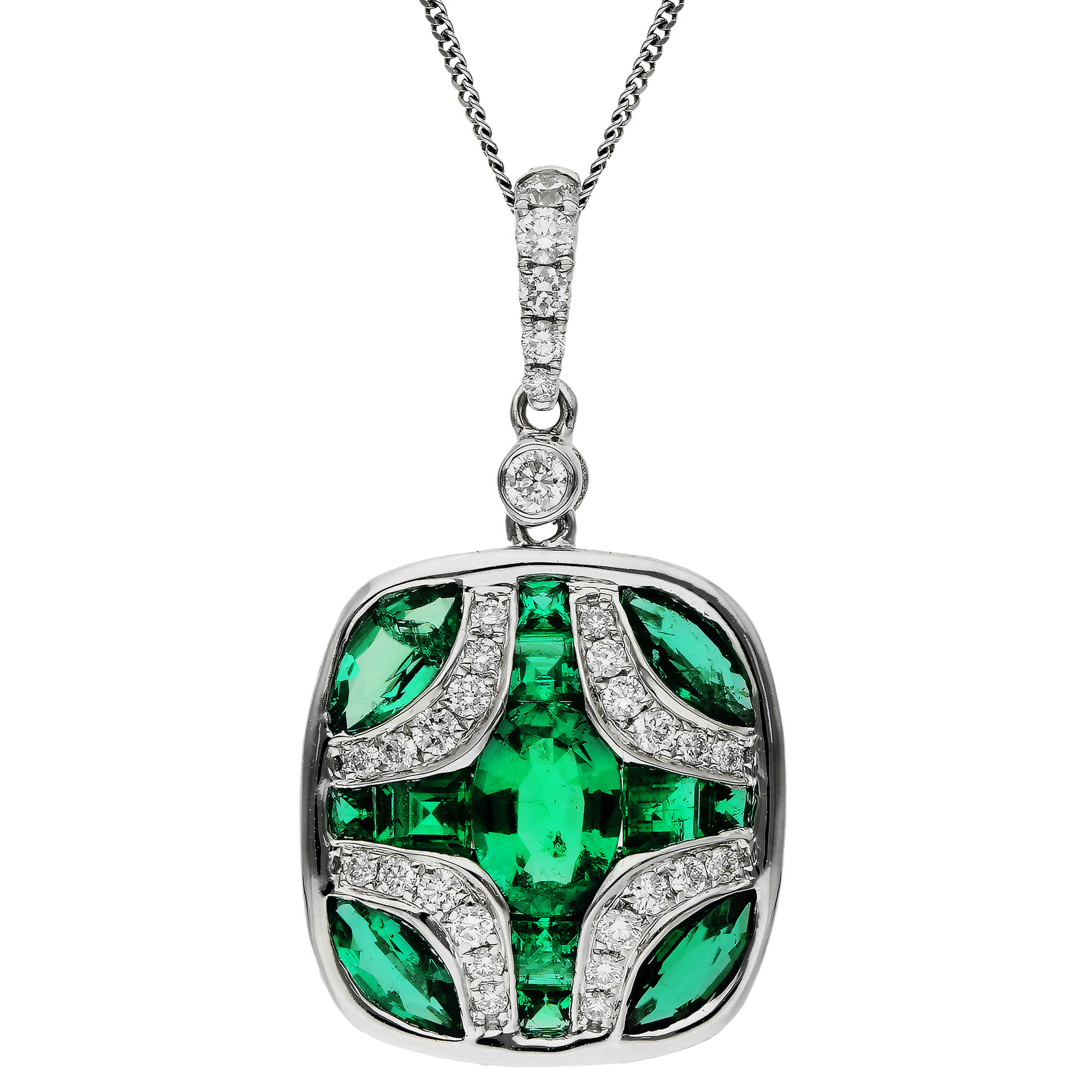 Elevate your jewellery collection with our sophisticated 18ct white gold diamond and emerald pendant. This pendant showcases a graduated diamond-set bail leading to an elegant shield design, which is intricately set with marquise, oval, and square cut emeralds. Each emerald is carefully bezel set in white gold, surrounded by a delicate curve of Pavé set diamonds that provide a dazzling frame. The pendant comes complete with a chain, allowing you to choose the ideal length to match your personal style, available through the drop-down menu. Ideal for gifting or as a stunning addition to your own ensemble, this pendant is a true testament to classic luxury and exquisite craftsmanship.
