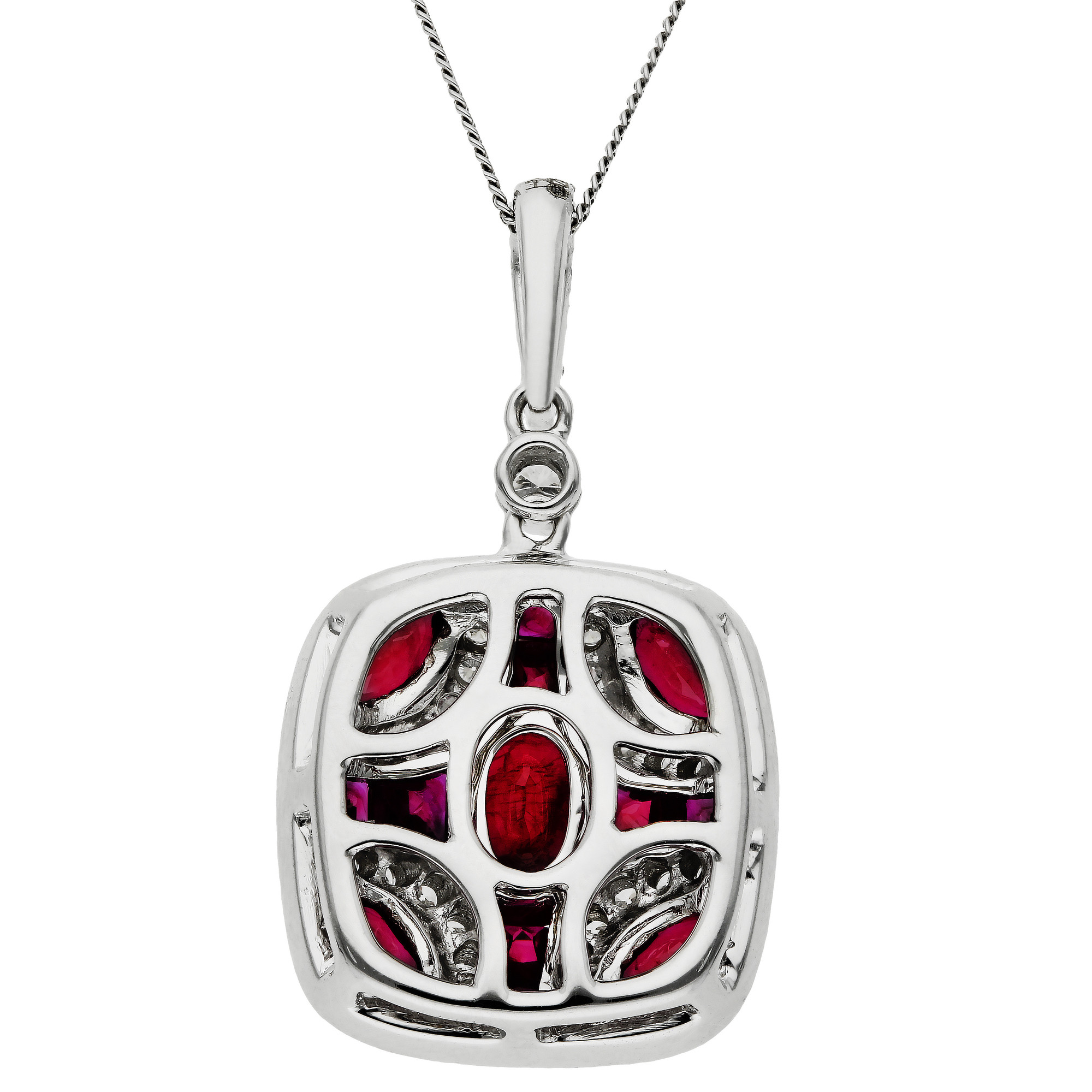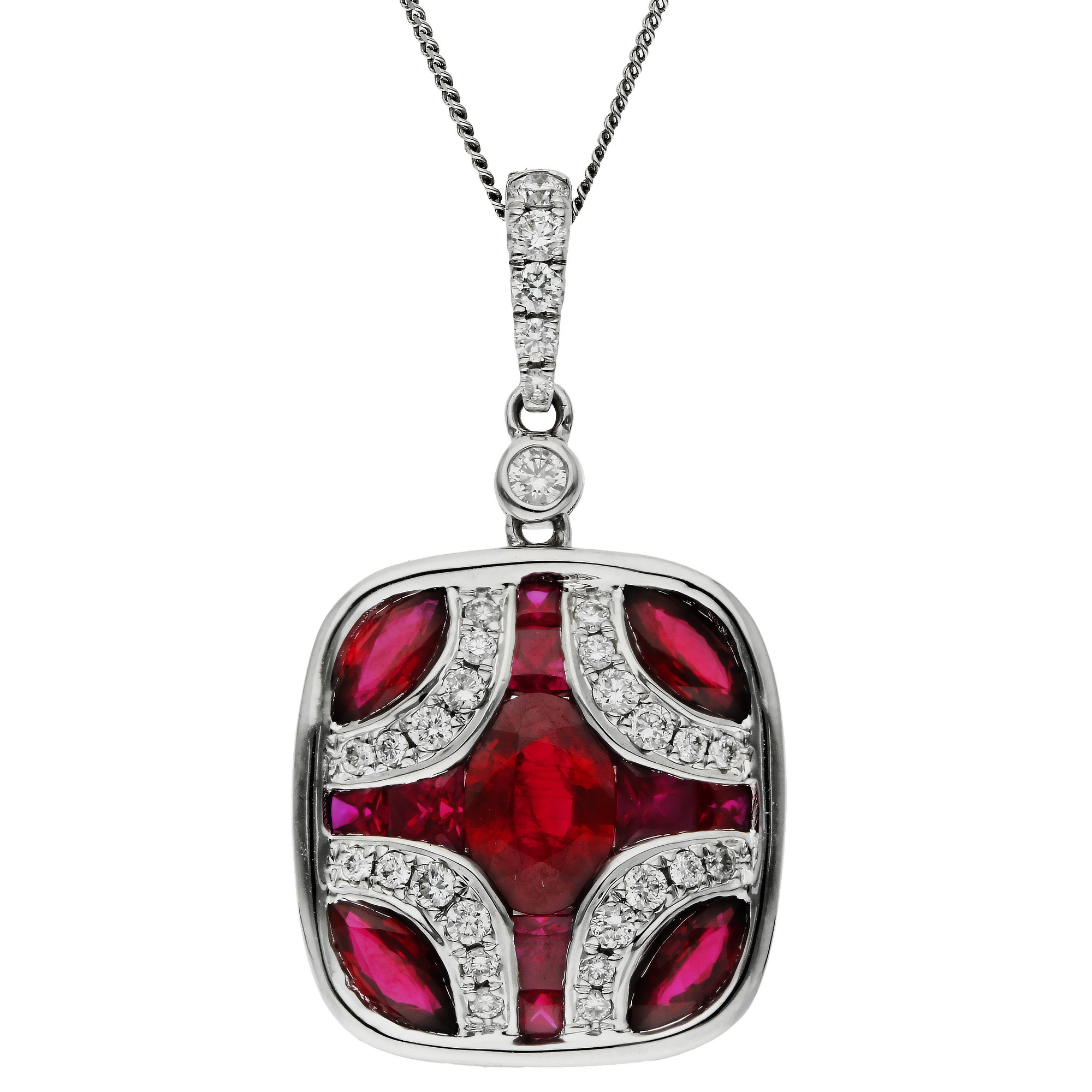 Elevate your evening wear with our exquisite 18ct white gold diamond and ruby pendant. Artfully crafted, this pendant boasts a sophisticated diamond-set bail that descends into a beautifully designed shield, adorned with a mix of marquise, oval, and square cut rubies. Each ruby is precisely bezel set in white gold, surrounded by a captivating curve of Pavé set diamonds that illuminate the edges. The pendant is paired with a chain, selectable in your preferred length from the drop-down menu, ensuring a perfect fit for any neckline. This striking piece combines bold colour and brilliant sparkle to create an unforgettable jewellery experience, making it an ideal choice for special occasions or as a cherished gift.