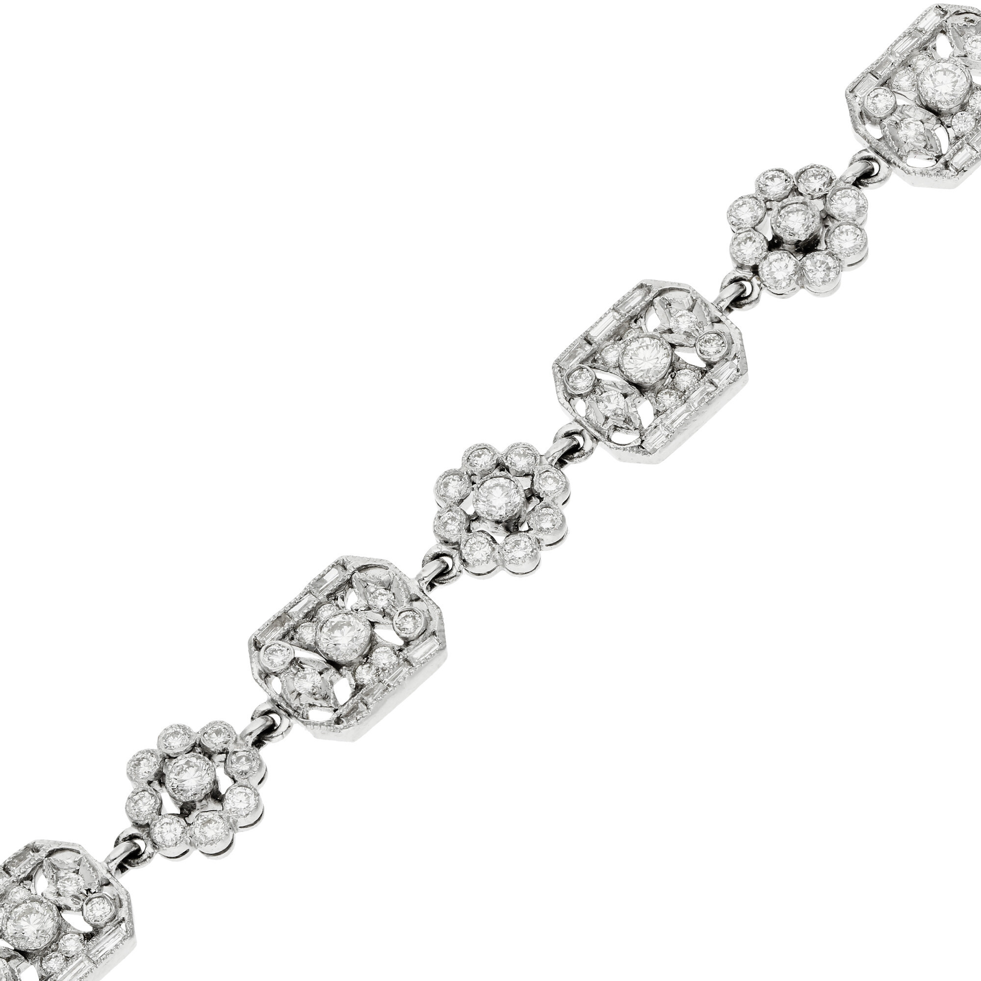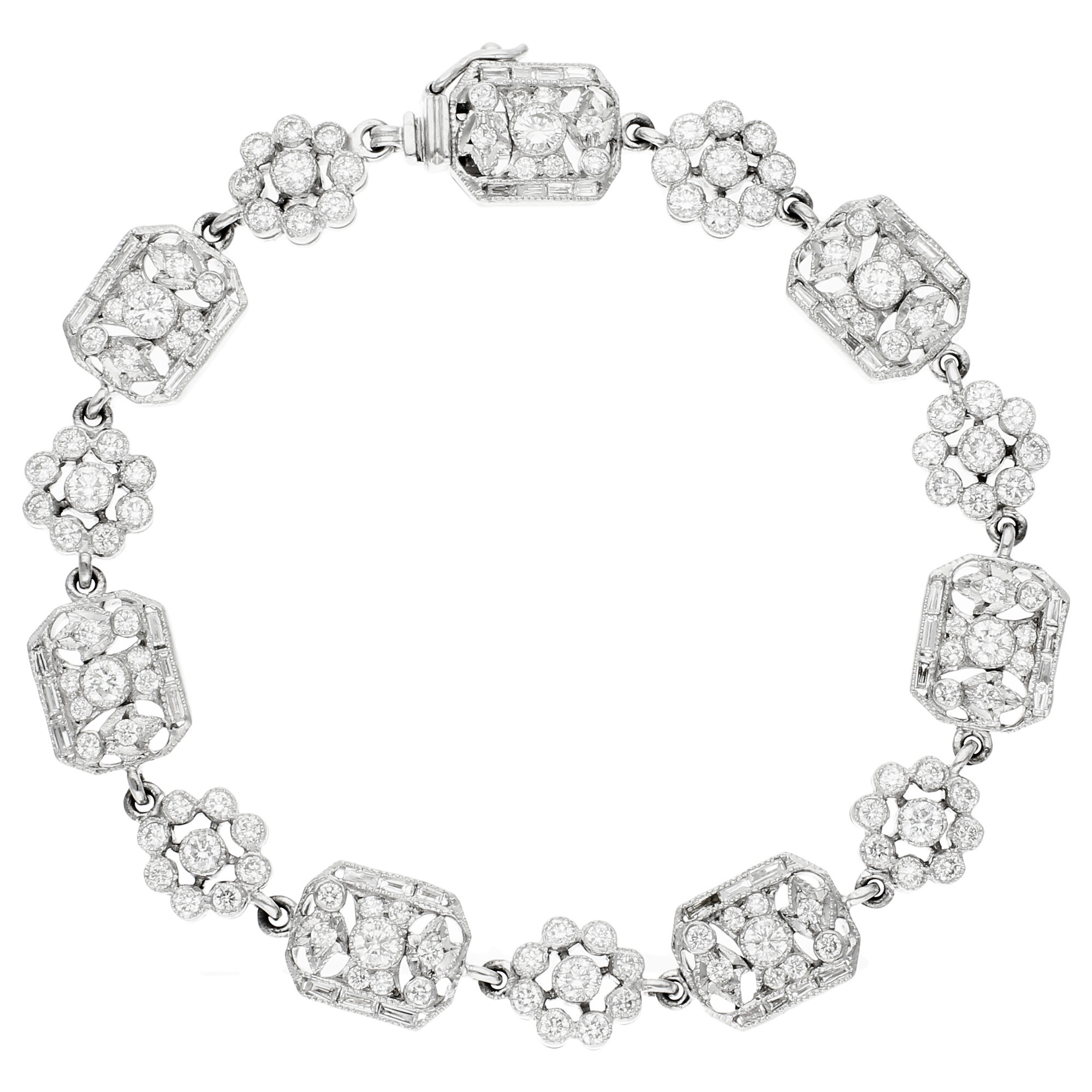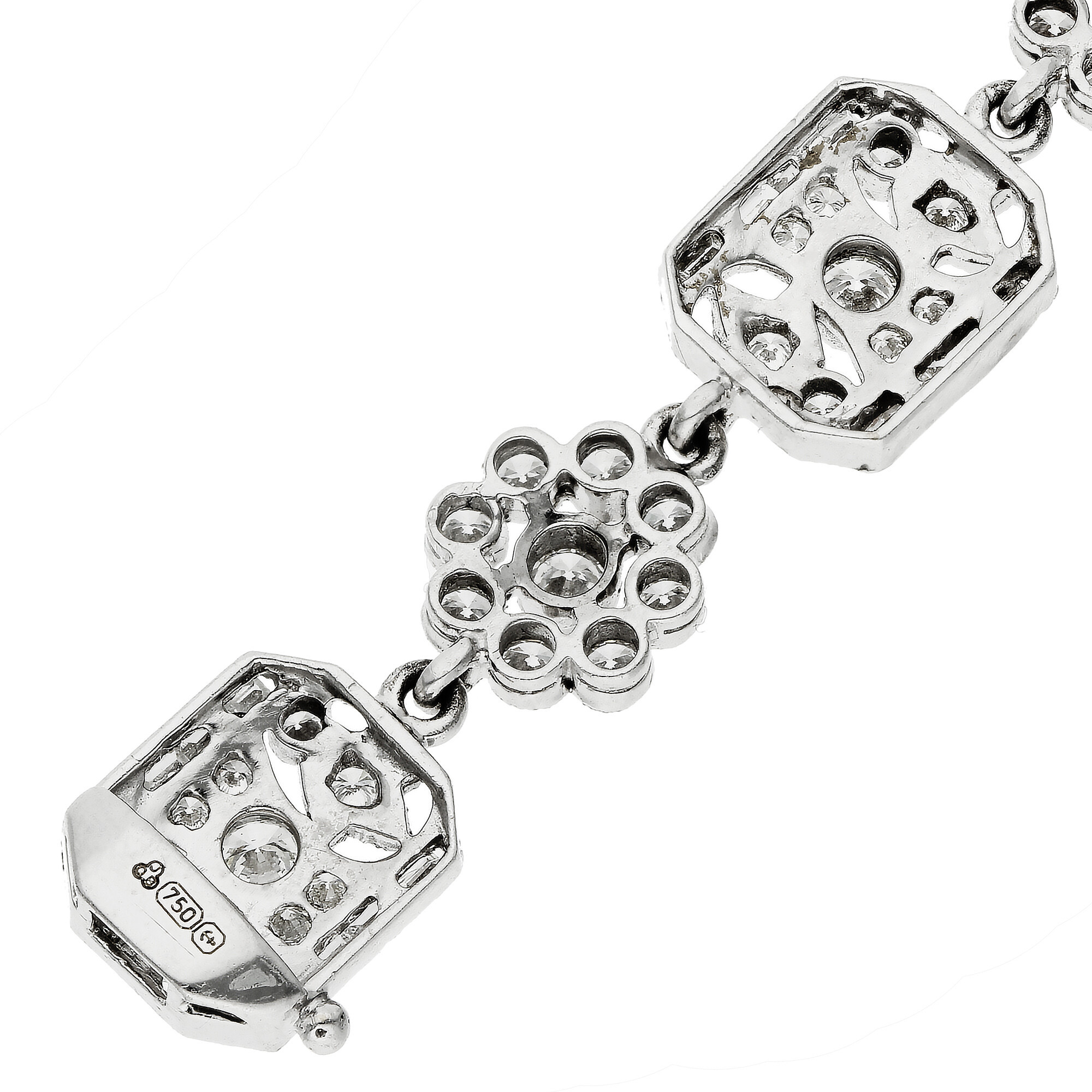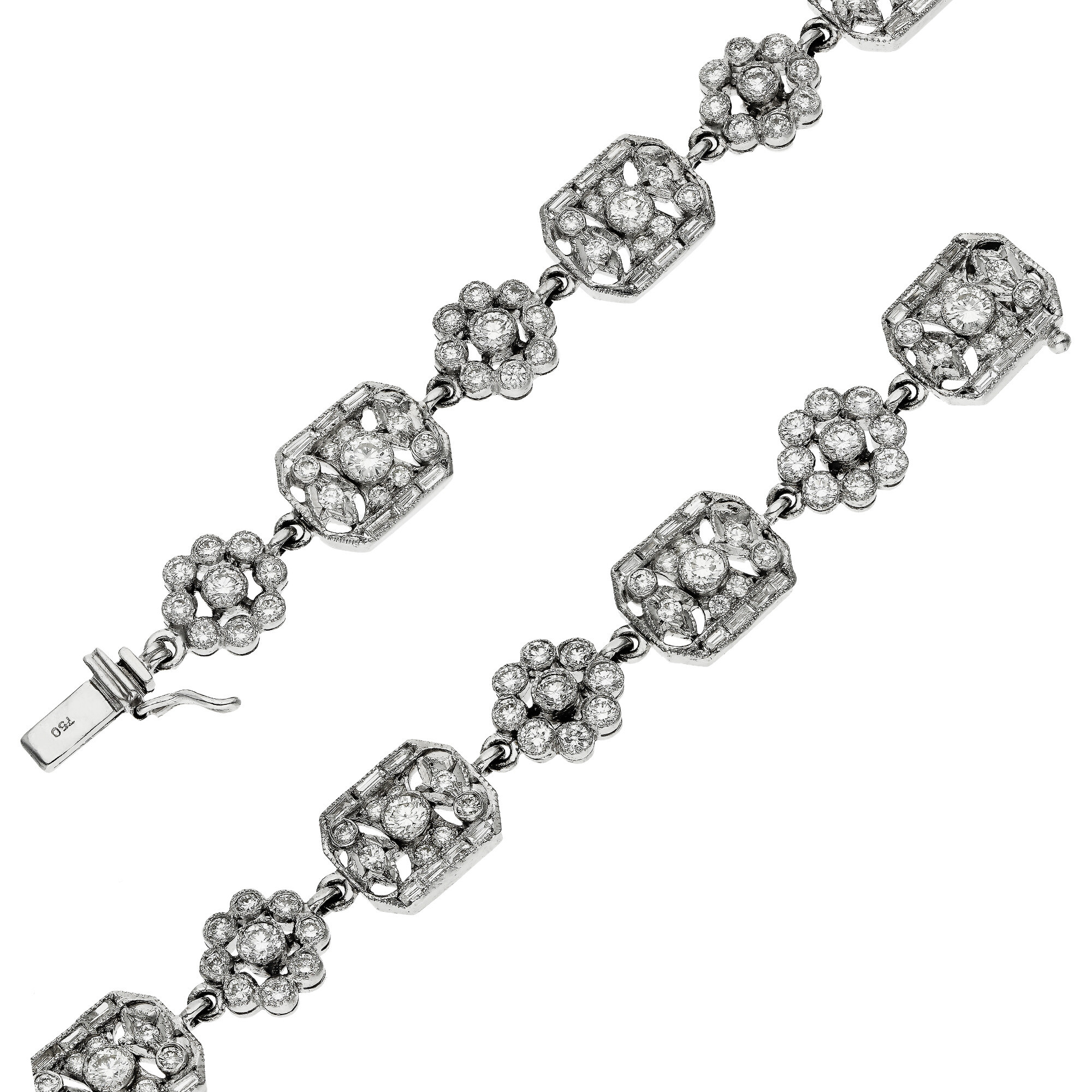 Add a dash of sophistication to your jewellery collection with this exquisite 18ct White Gold Diamond Bracelet. Designed with an eye catching arrangement of brilliant cut diamond flowerheads alternated with geometric links set with baguette and similarly cut diamonds, this pre-owned bracelet exudes a chic Deco feel. The meticulous craftsmanship ensures each diamond is perfectly placed to catch the light and sparkle with every movement. This bracelet is ideal for anyone seeking a piece that combines the allure of vintage design with the brilliance of modern diamond cuts, offering an exceptional accessory that complements both evening and day wear.