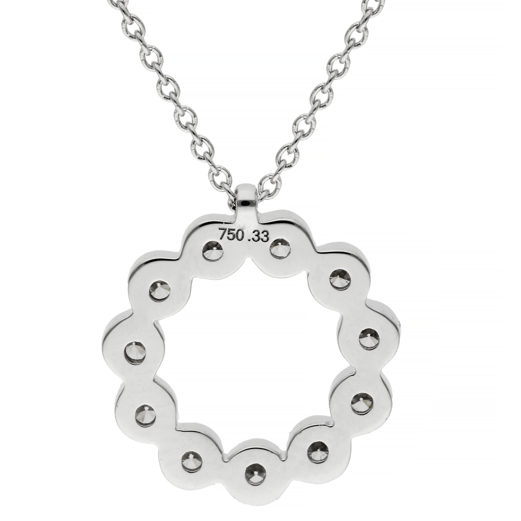 This exquisite 18ct white gold pendant features a circle of bezel set round brilliant cut diamonds, totalling 0.33ct. Each diamond is expertly positioned to create a stunning display of light and sparkle, offering a contemporary yet timeless design. The circle symbolises eternity, making this piece a meaningful addition to any jewellery collection. Complete with a matching white gold chain, this pendant sits elegantly on the neckline, perfect for both daily wear and special occasions. Whether as a thoughtful gift or a personal treat, this diamond pendant adds a touch of sophistication and brilliance to any ensemble.