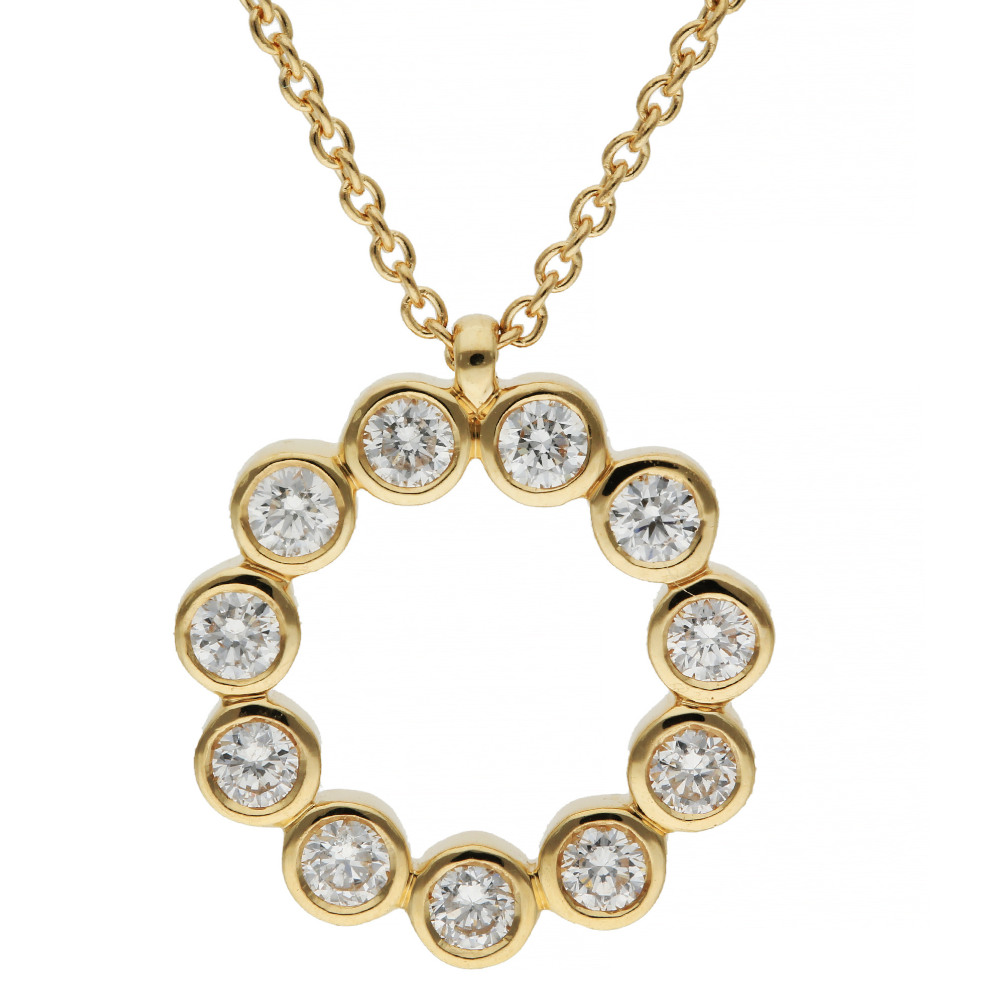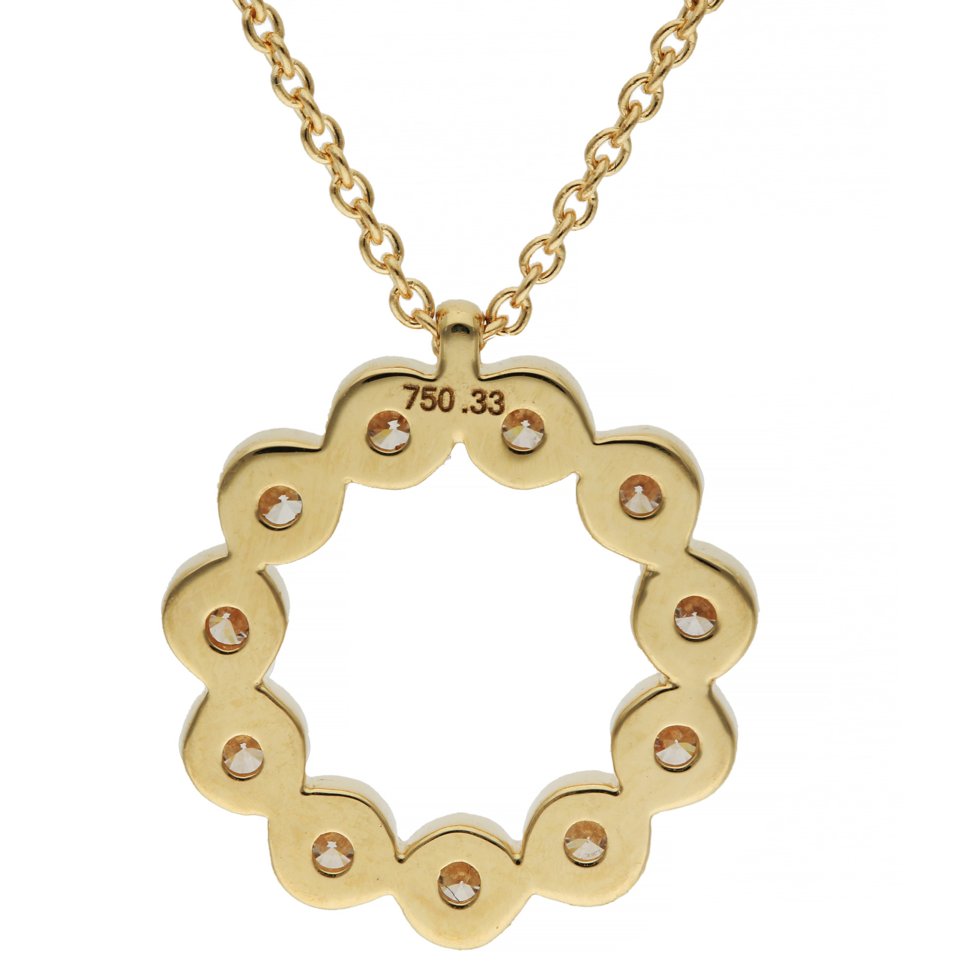 This beautiful 18ct yellow gold pendant features a circle of shimmering bezel set round brilliant cut diamonds, totalling 0.33ct. The contemporary bezel setting ensures each diamond shines brightly, while the circular design adds a touch of sophistication and symbolism. Suspended from a sleek yellow gold chain, this pendant is versatile enough to complement any look, from casual chic to evening glamour. Whether as a meaningful gift or a personal indulgence, this diamond circle pendant is a stylish and timeless piece that will add sparkle and elegance to any jewellery collection.