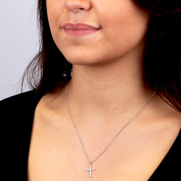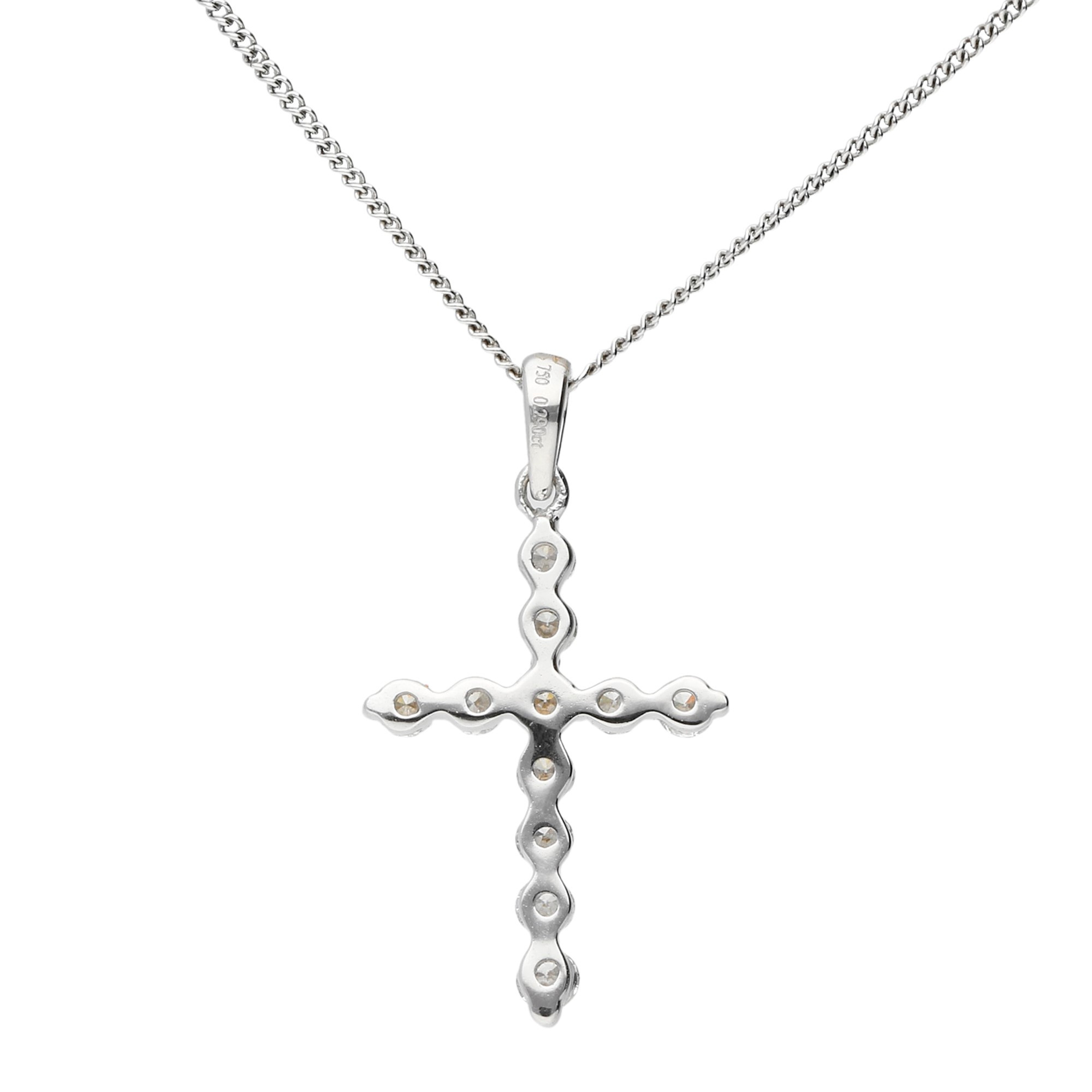 Elevate your collection with our divine 18ct White Gold Diamond Cross Pendant, a symbol of faith and elegance. This sophisticated piece features a classic cross design, meticulously set with eleven round brilliant cut diamonds that capture and reflect light from every angle. Each diamond is chosen for its exceptional sparkle, creating a radiant display of luxury and devotion. Suspended from a simple yet elegant bail, this pendant hangs gracefully, making it a perfect complement to any outfit, whether for special occasions or everyday wear. Crafted from lustrous 18ct white gold, the pendant offers a modern twist on a timeless symbol, blending spiritual significance with contemporary style. Ideal as a meaningful gift or a personal keepsake, this Diamond Cross Pendant is a testament to exquisite craftsmanship and eternal beauty.
