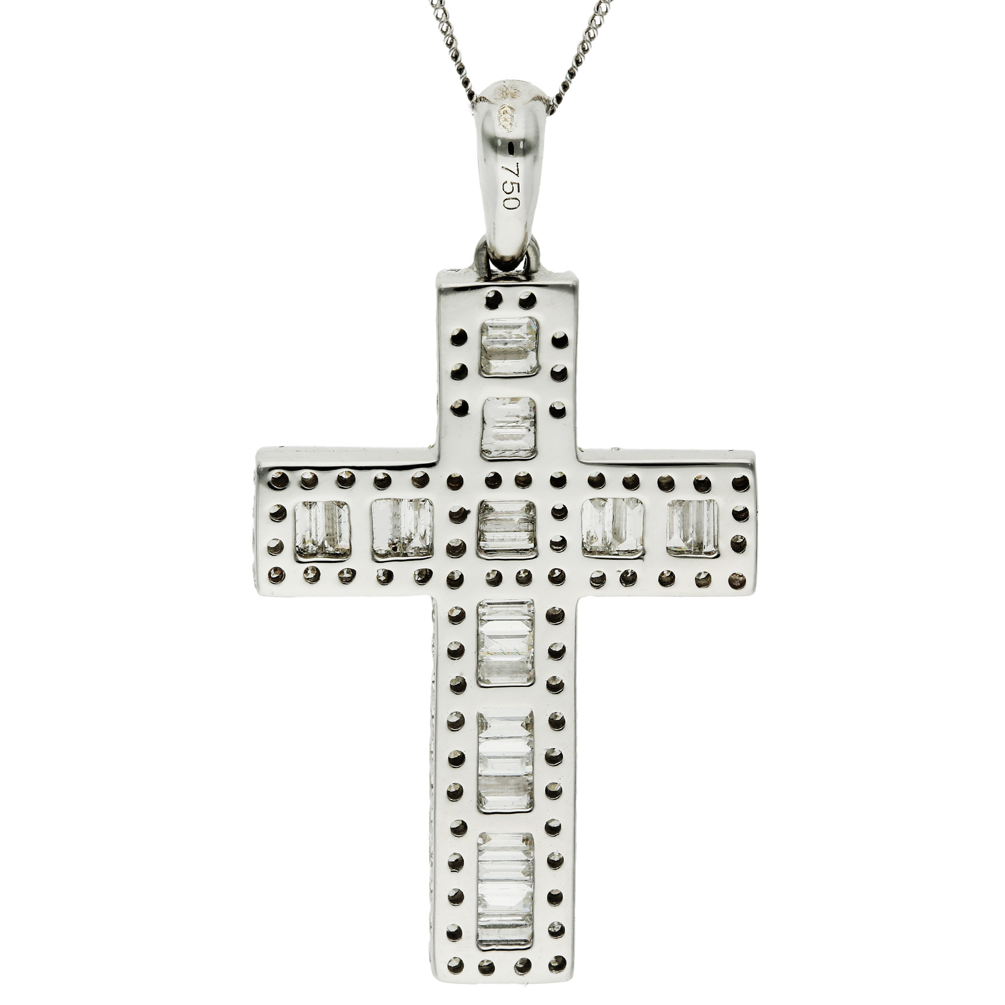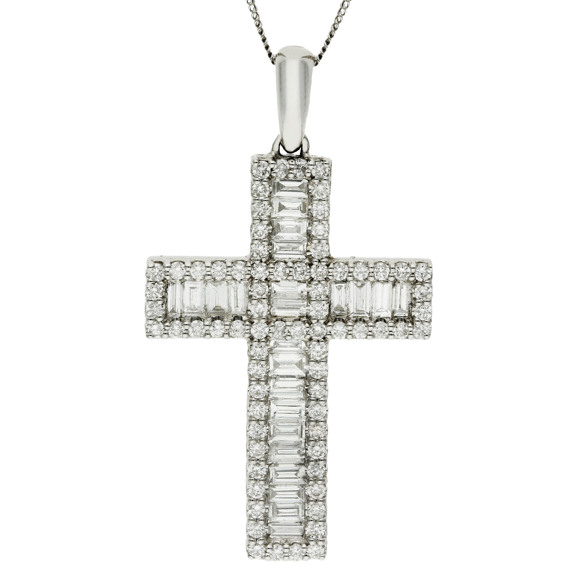 Discover the divine beauty of our 18ct white gold diamond cross pendant, featuring a total diamond weight of approximately 1.00 carat. This elegant pendant combines the modern brilliance of baguette cut diamonds with the timeless allure of round brilliant cut diamonds, all set in a classic cross silhouette. The contrasting shapes and settings of the diamonds create a dazzling display of light, making this piece a true work of art. The pendant hangs gracefully from an 18 inch chain, making it a perfect choice for those seeking a statement piece that conveys both style and significance. Whether worn as a symbol of faith or as a fashion statement, this diamond cross pendant is sure to captivate and inspire.