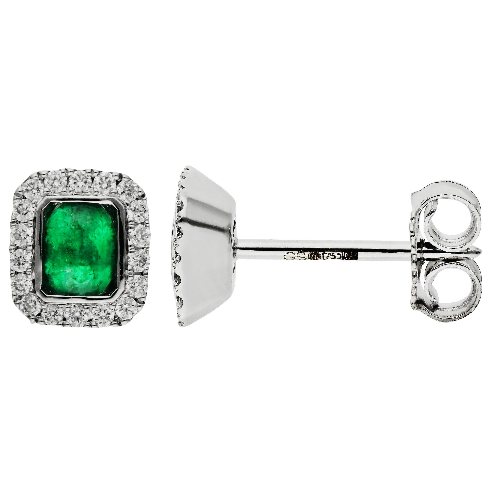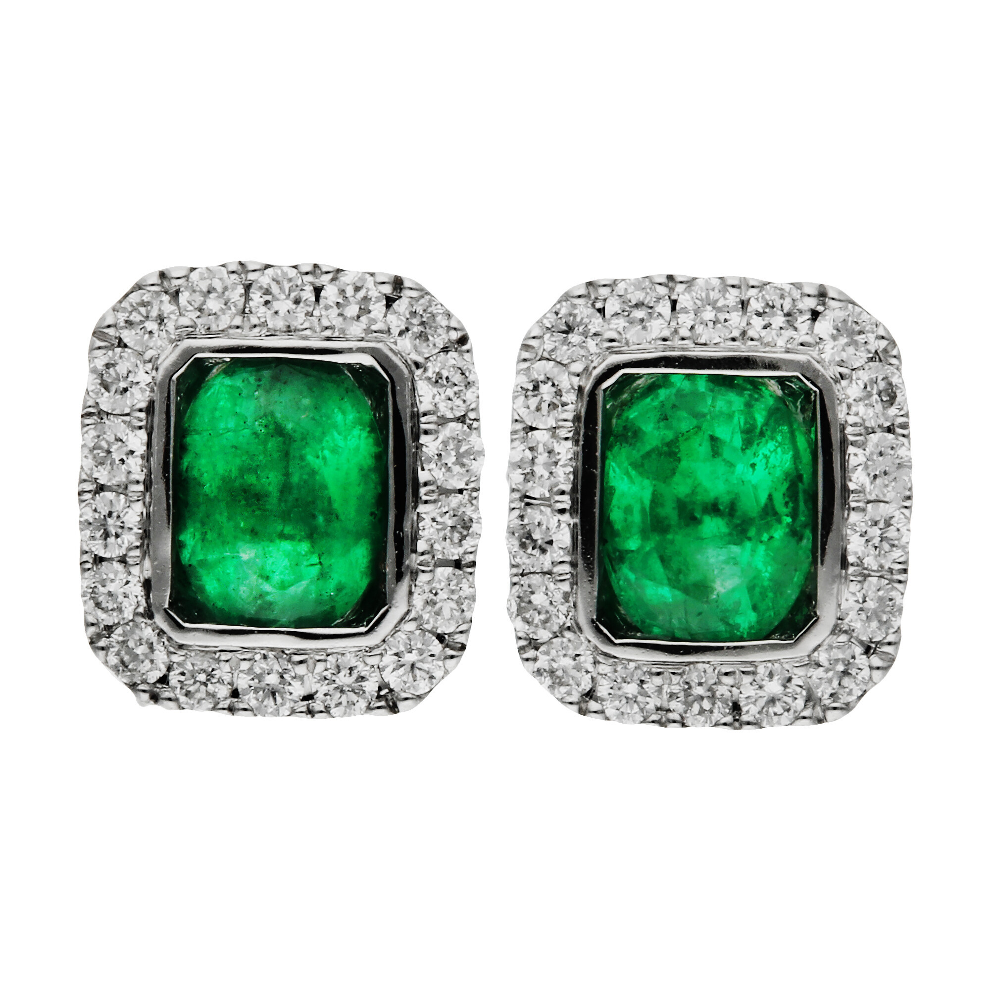 Elevate your style with our luxurious 18ct White Gold Diamond and Emerald Earrings, a stunning addition to any ensemble. Each earring showcases an elegant oval faceted emerald, framed beautifully by a rectangle of white gold and encircled by brilliant diamonds. The halo design not only enhances the vibrant green of the emeralds but also provides an exquisite contrast to the white gold setting. These stud earrings feature posts and scroll backs for a secure and comfortable fit, ideal for long wear. Whether it's a special occasion or a casual day out, these earrings promise to bring a touch of sophistication and sparkle to your look.