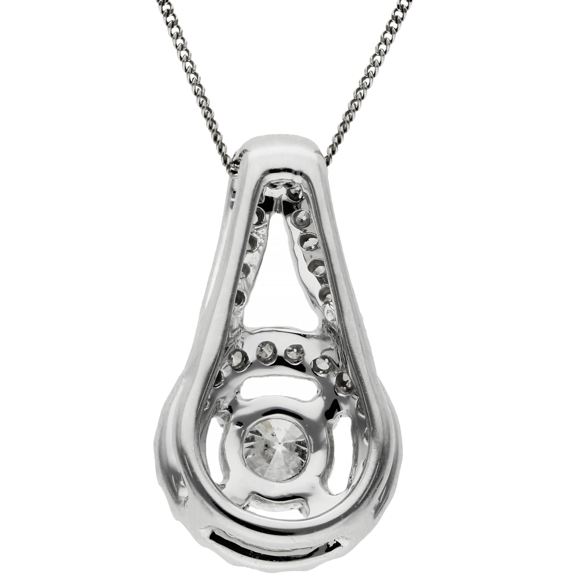 This exquisite 18ct white gold pendant showcases a radiant 0.35ct diamond, set in a classic claw setting and framed by a halo of shimmering diamonds. The diamond split bail adds extra brilliance, ensuring the pendant sparkles beautifully from all angles. Suspended from a delicate white gold chain, this pendant offers a refined and elegant look that complements any style. Whether worn to mark a special occasion or as a daily touch of luxury, this diamond pendant is sure to be cherished for years to come. A perfect gift or a personal indulgence for those who appreciate timeless elegance.
