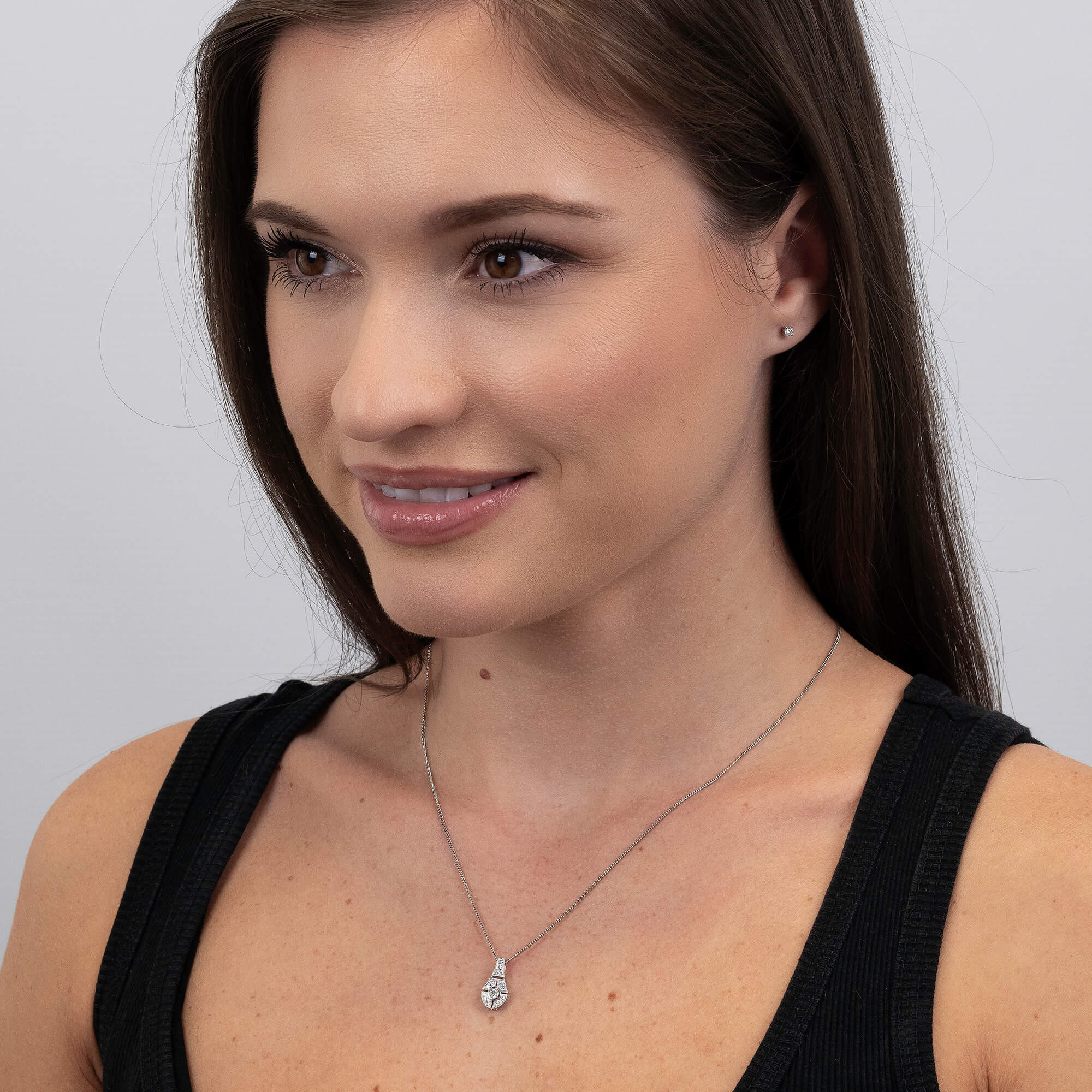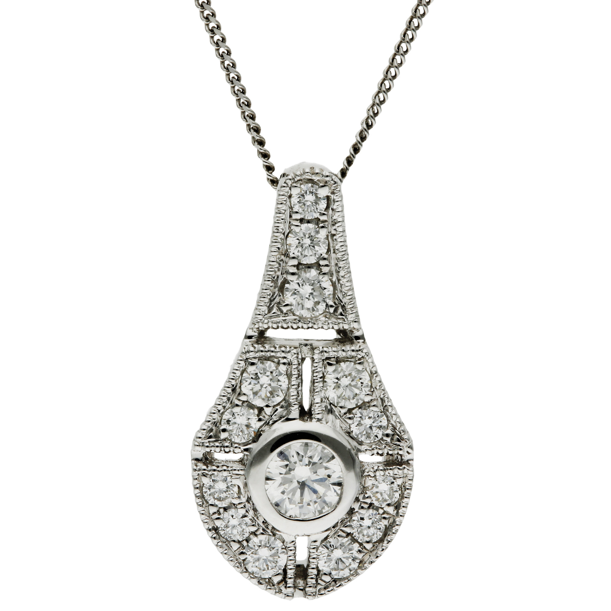 This exquisite 18ct white gold pendant features a stunning pear shaped diamond cluster, carefully arranged into sections that highlight a central bezel set round brilliant cut diamond. The milgrain detailing along the edges adds a touch of intricate craftsmanship, giving the pendant a delicate and refined aesthetic. Paired with an 18ct white gold curb chain, this pendant offers timeless elegance and versatility, perfect for adding sparkle to any outfit. Whether as a gift or a personal indulgence, this 0.27ct diamond pendant is a statement of style and sophistication that will be cherished for years to come.