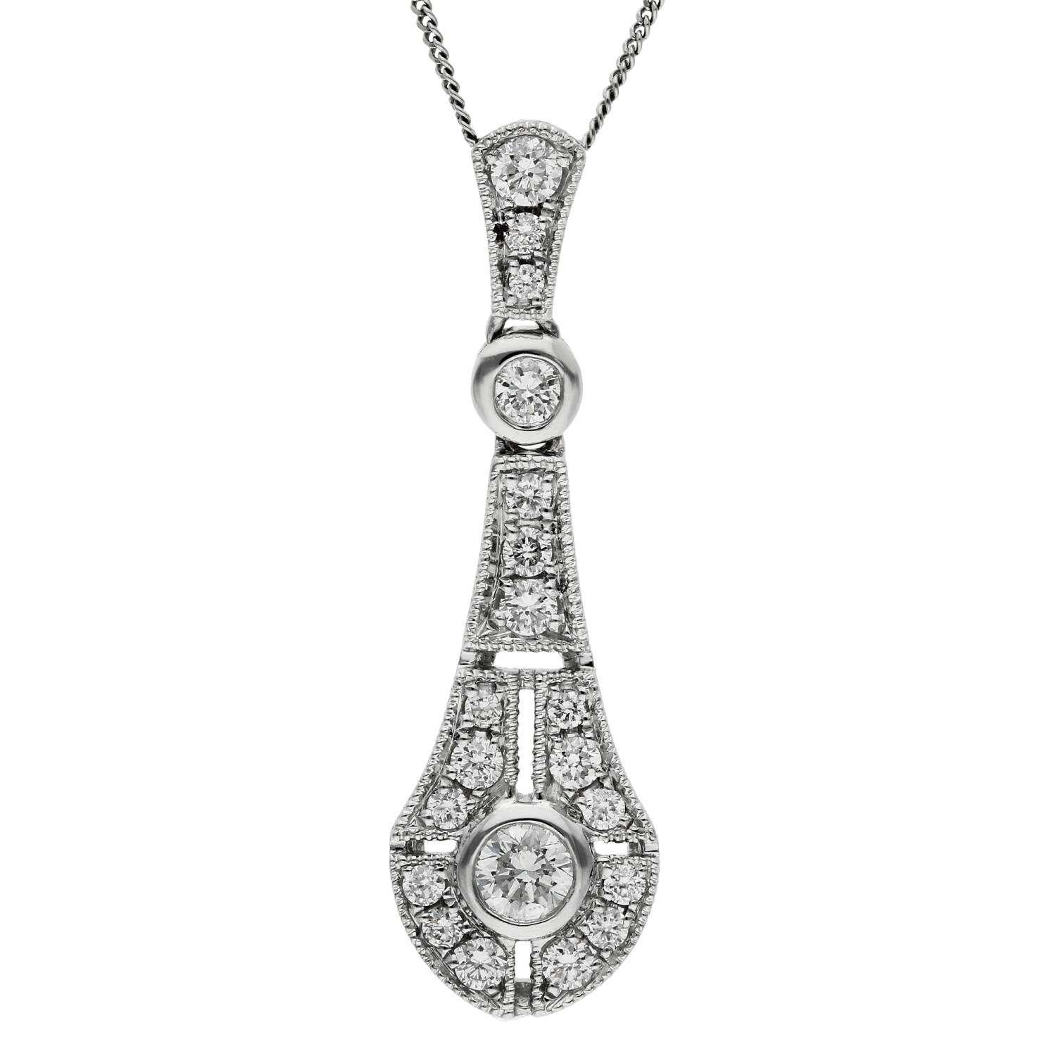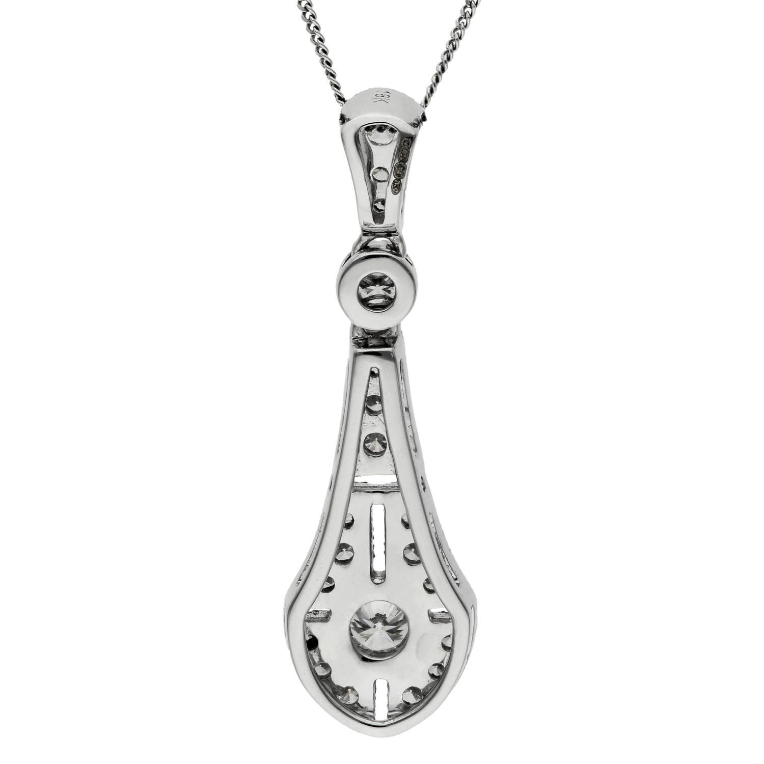 Discover the elegance of this stunning 18ct white gold diamond pendant, designed with Deco inspired sophistication. The pendant features a pear drop diamond cluster split into sections, gracefully framing a bezel set round brilliant cut diamond at its centre. A diamond set surmount enhances the sparkle, while the milgrain edging adds vintage charm to this luxurious design.