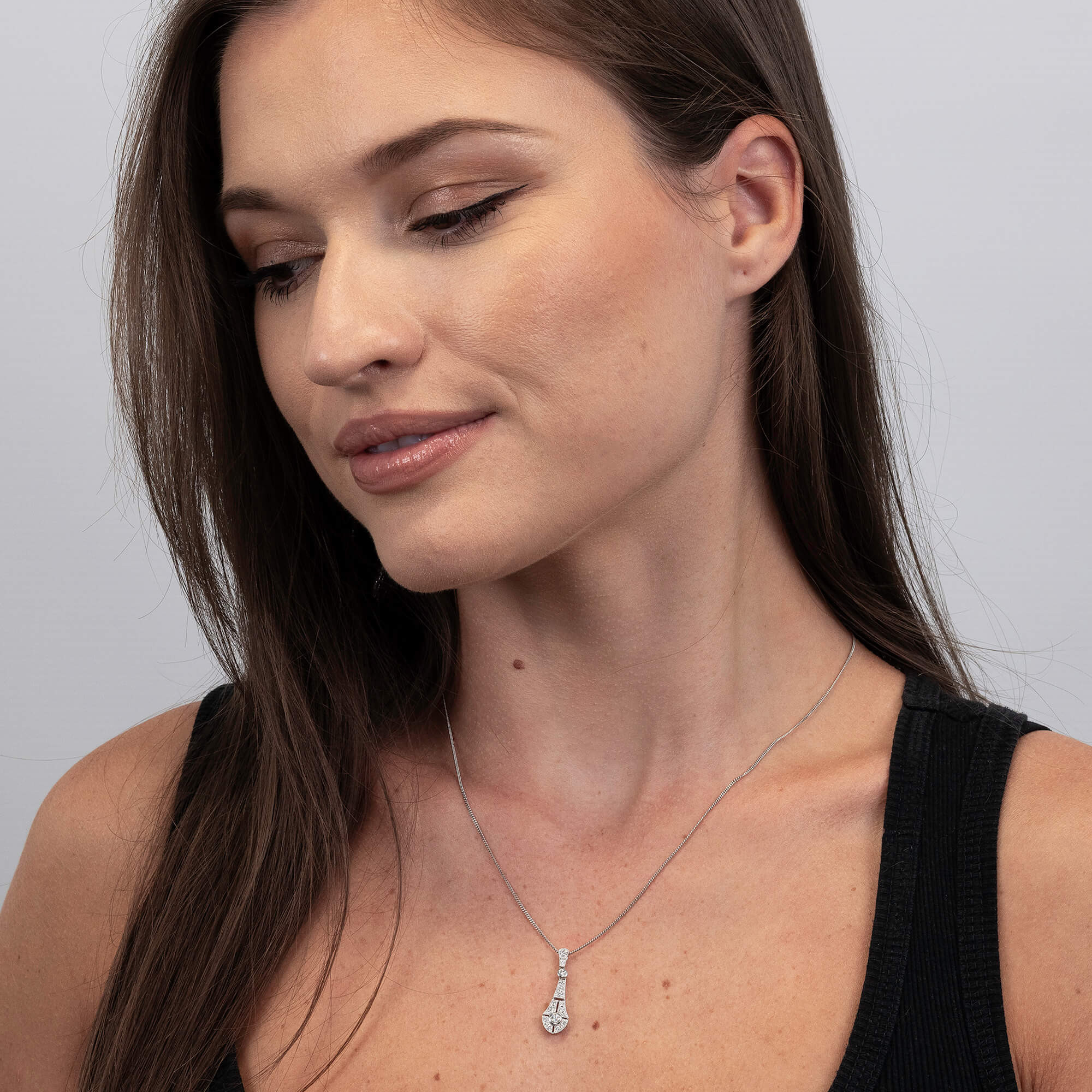 Ideal as a thoughtful gift or a timeless addition to your own collection, this diamond pendant is a testament to beauty and quality. Its Deco-inspired design and exceptional sparkle ensure it will be a cherished keepsake, combining elegance and sophistication in every detail.