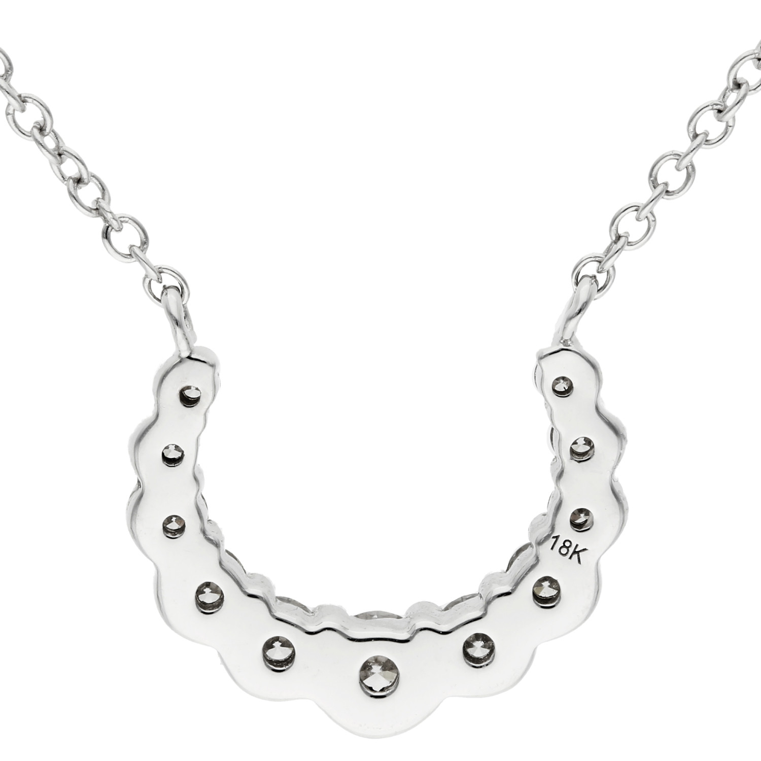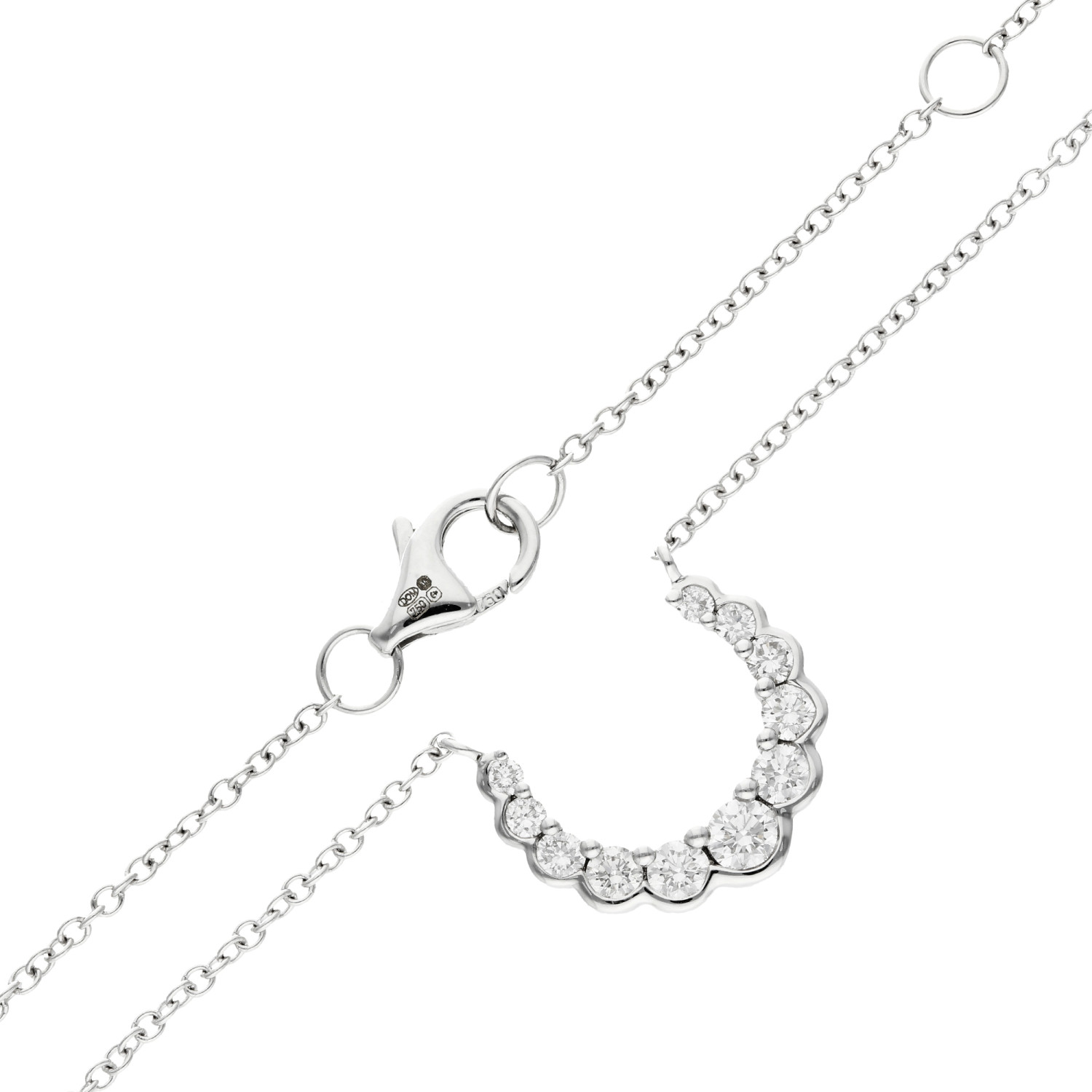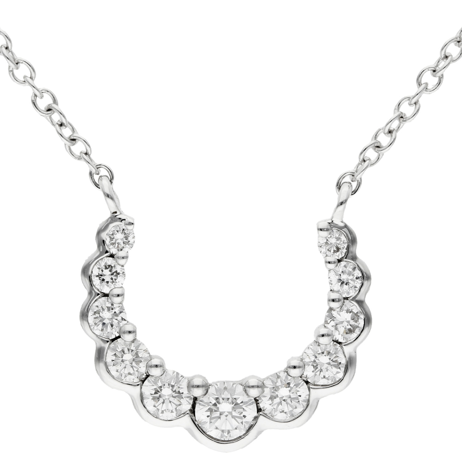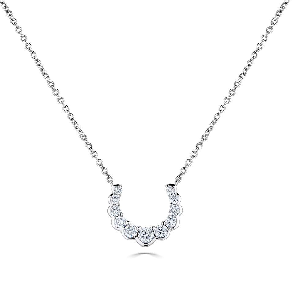 Discover the epitome of elegance and good fortune with our 18ct White Gold Diamond Necklace. This exquisite piece features a delicately crafted crescent shaped pendant, symbolizing luck, adorned with sparkling graduated round brilliant cut diamonds. The pendant boasts a unique design with a polished scalloped bezel setting on the bottom edge and sophisticated claw settings along the top, ensuring each diamond is perfectly showcased for maximum brilliance and shine.