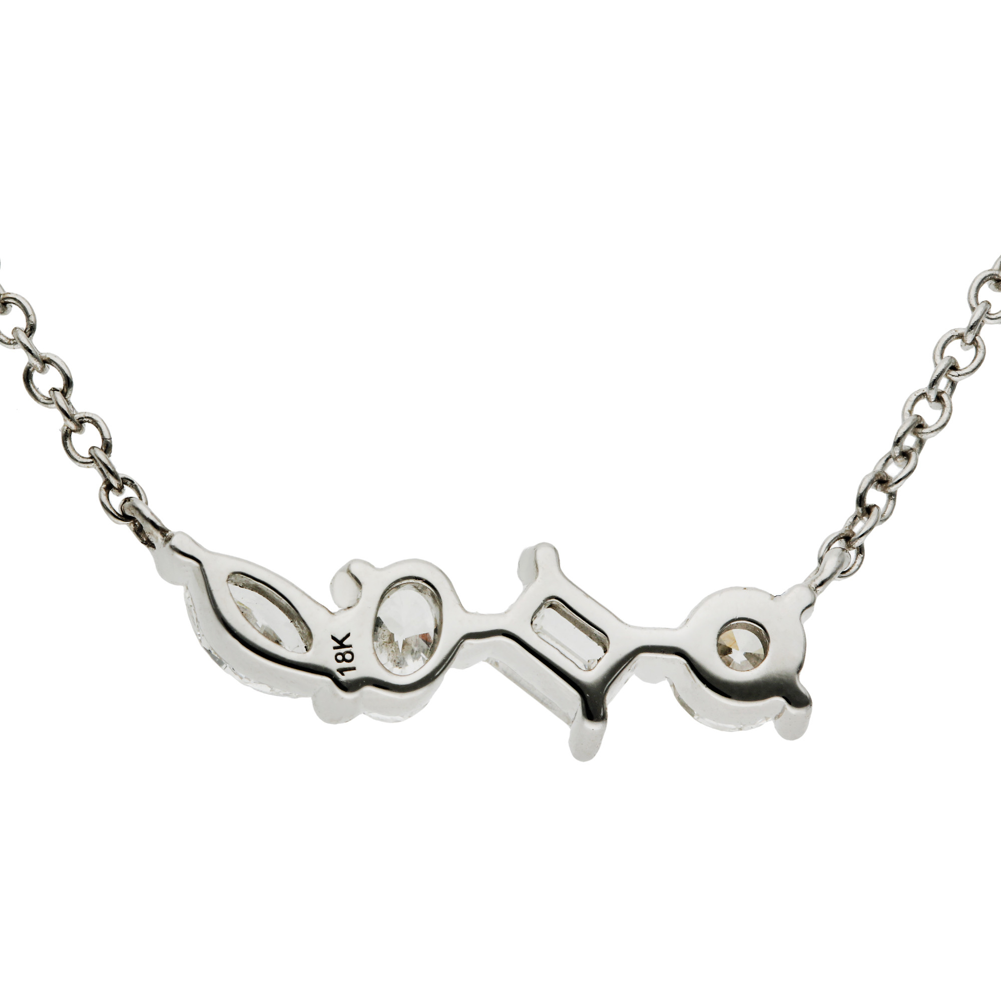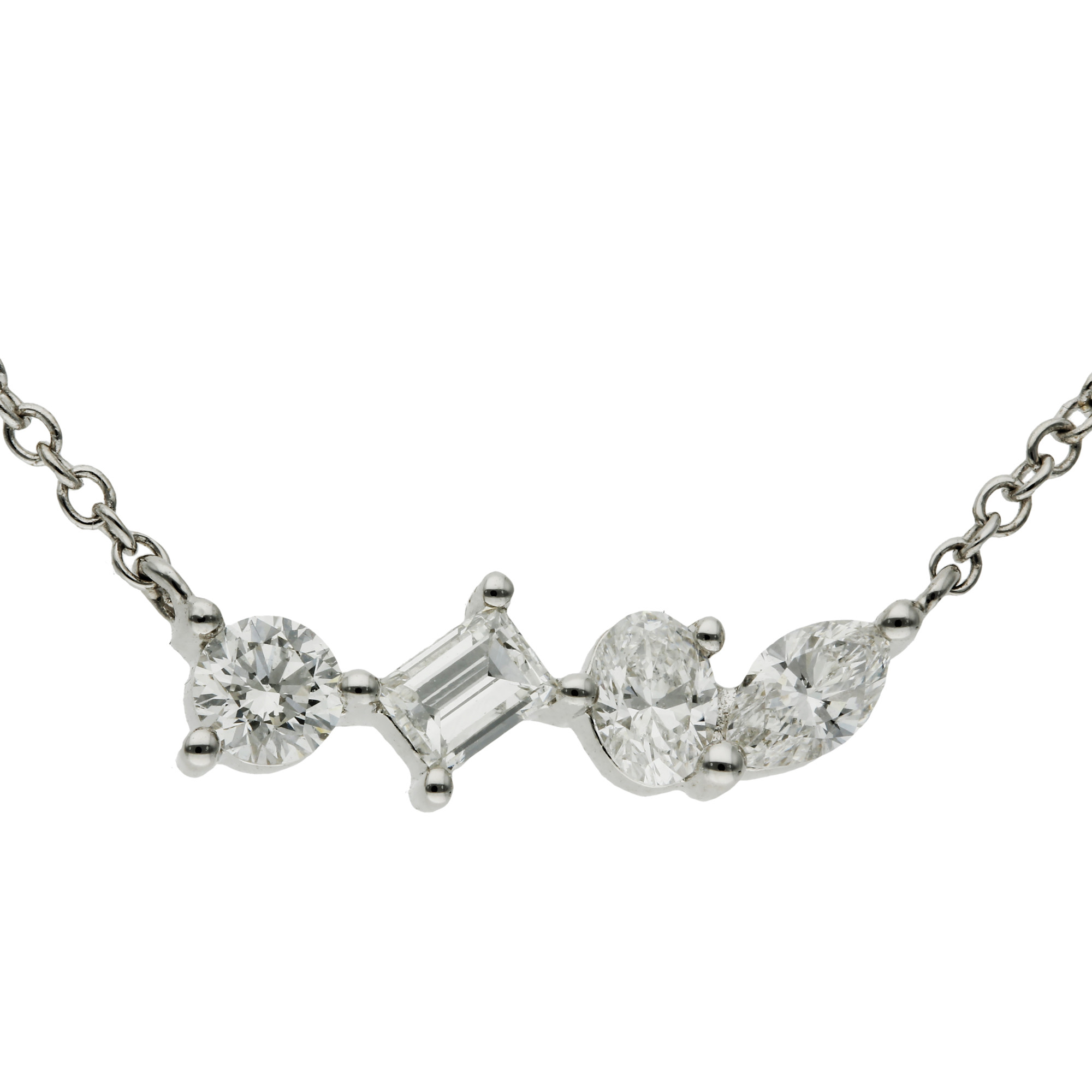 Elevate your style with the exquisite allure of our 18ct White Gold Diamond Necklace, a stunning masterpiece that seamlessly blends sophistication with modern elegance. This luxurious necklace features a captivating horizontal parade of multi-shaped diamonds, including the refined marquise cut, the elegant oval cut, the classic rectangular step cut, and the timeless round brilliant cut, each contributing to a display of dazzling brilliance and unmatched sparkle.