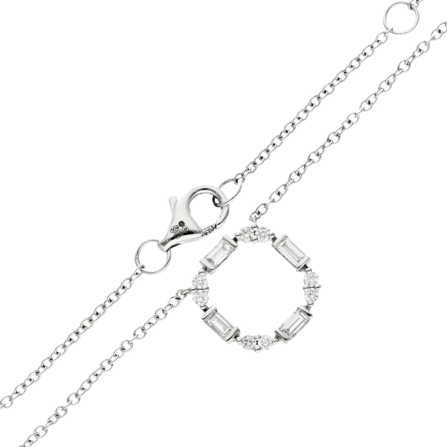 Elevate your elegance with our 18ct White Gold Diamond Halo Necklace, a masterpiece blending classic Deco style with contemporary glamour. This luxurious necklace showcases a stunning circle pendant, adorned with meticulously arranged round brilliant and baguette cut diamonds, each chosen for their exceptional sparkle and clarity. The unique combination of diamond cuts creates a dazzling Deco-inspired halo effect, capturing the essence of sophistication and timeless beauty.