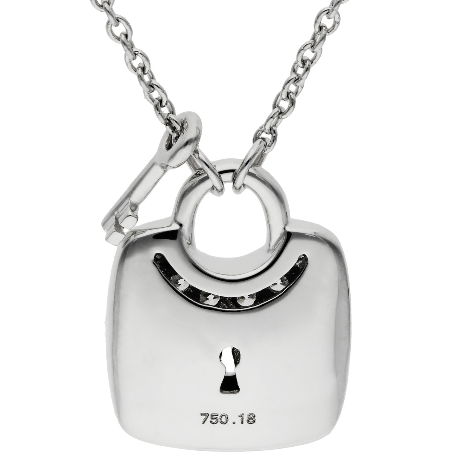 This stunning 18ct white gold padlock pendant is adorned with tiny diamonds, adding a touch of shimmer and elegance. Accompanied by a dainty white gold key, the design combines beauty and symbolism, representing the bond of love and trust. The pendant hangs from a sleek white gold chain, creating a harmonious and sophisticated look. Ideal for adding a hint of sparkle to your everyday wardrobe or for marking a special occasion, this diamond padlock pendant is a unique and versatile piece that will be cherished for years to come.