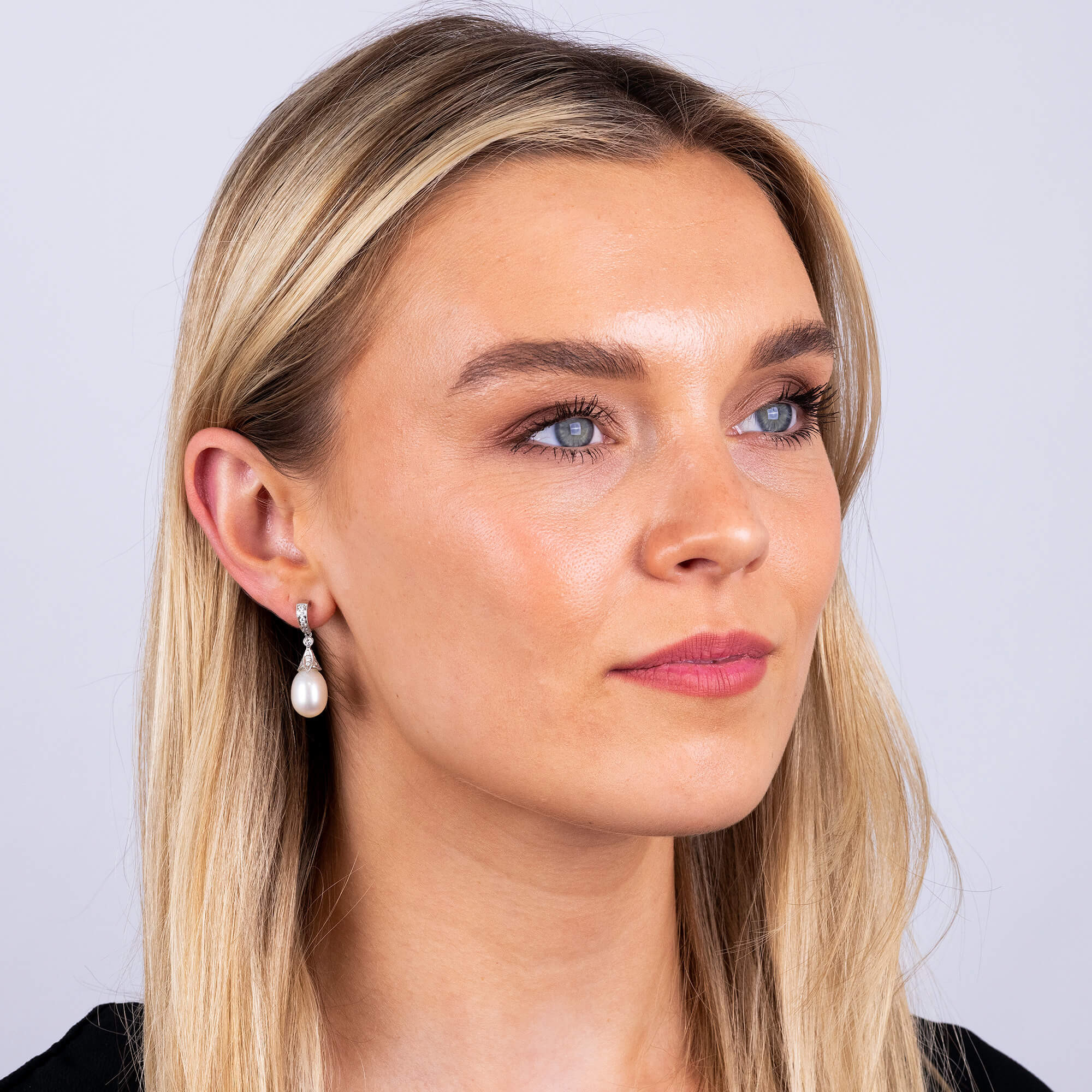 "Introducing our exquisite 18ct White Gold Diamond & Pearl Drop Earrings, a breath taking combination of classic elegance and modern design. Each earring features a lustrous, plump pearl, symbolizing purity and sophistication. The pearl is gracefully held in place by a floral diamond surmount, adding a touch of sparkling luxury and intricate detail. Suspended from this is a beautifully crafted diamond-set curl that elegantly cups the ear, creating a unique and contemporary look. The diamonds, carefully chosen for their brilliance and clarity, are set in premium 18-carat white gold, which enhances their radiance and offers a sleek, polished finish. These earrings are a perfect balance of understated glamour and refined style, ideal for special occasions or adding an elegant touch to your everyday ensemble. The combination of the radiant pearls and shimmering diamonds makes these Diamond & Pearl Drop Earrings a timeless addition to any fine jewellery collection."