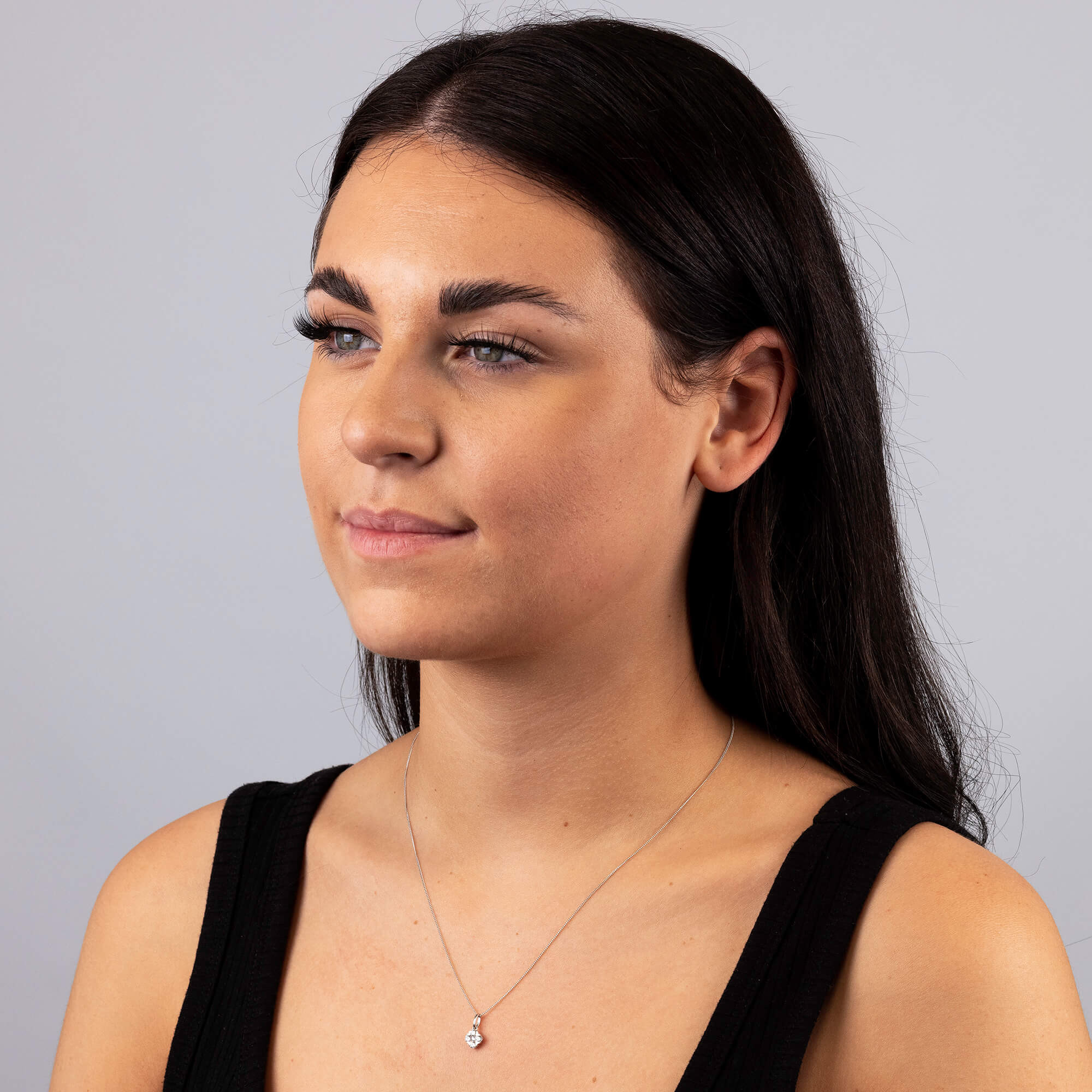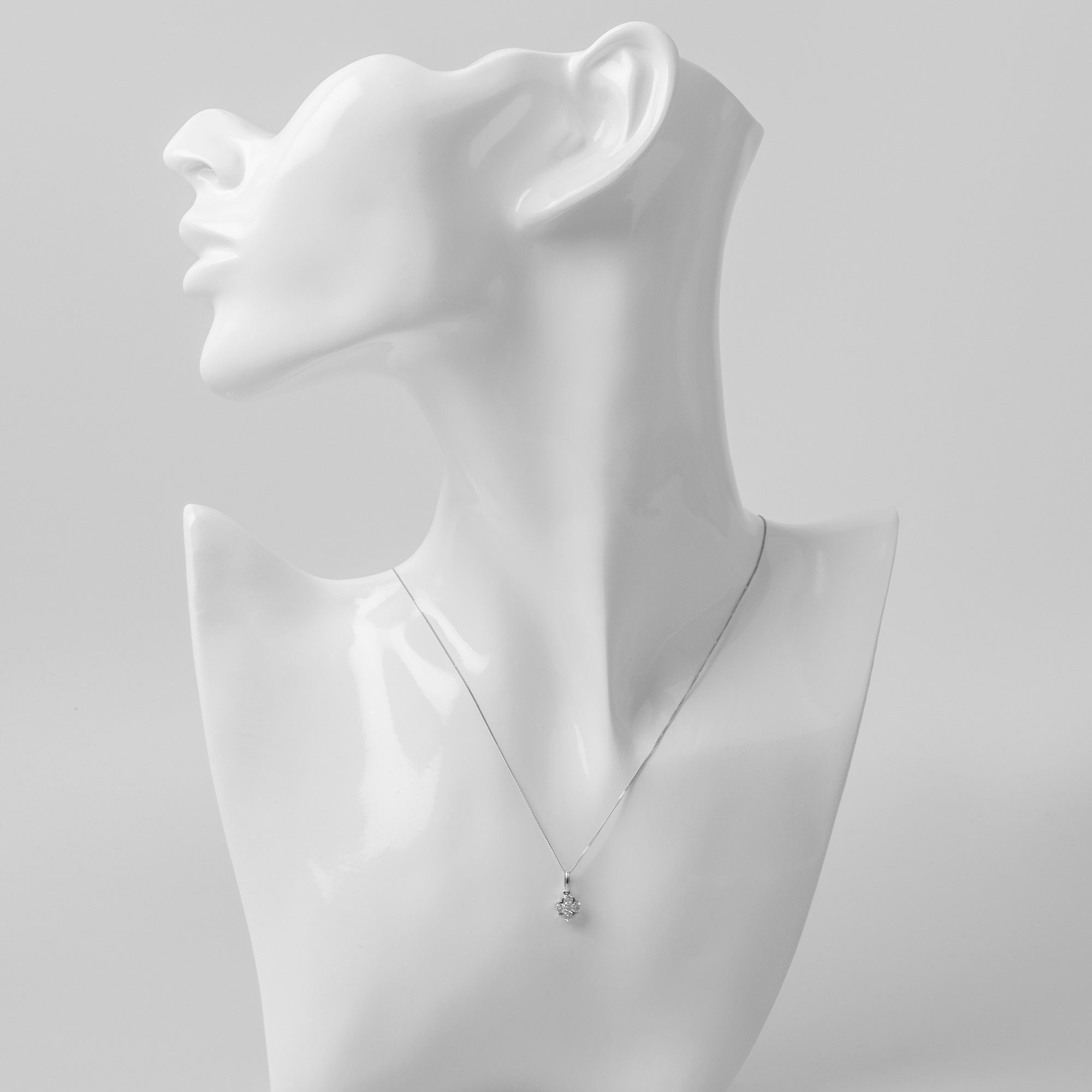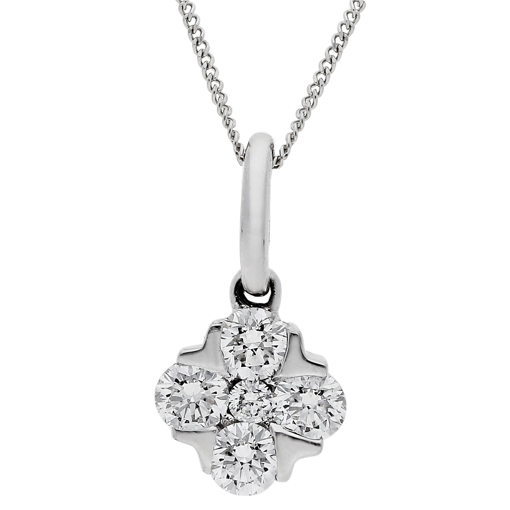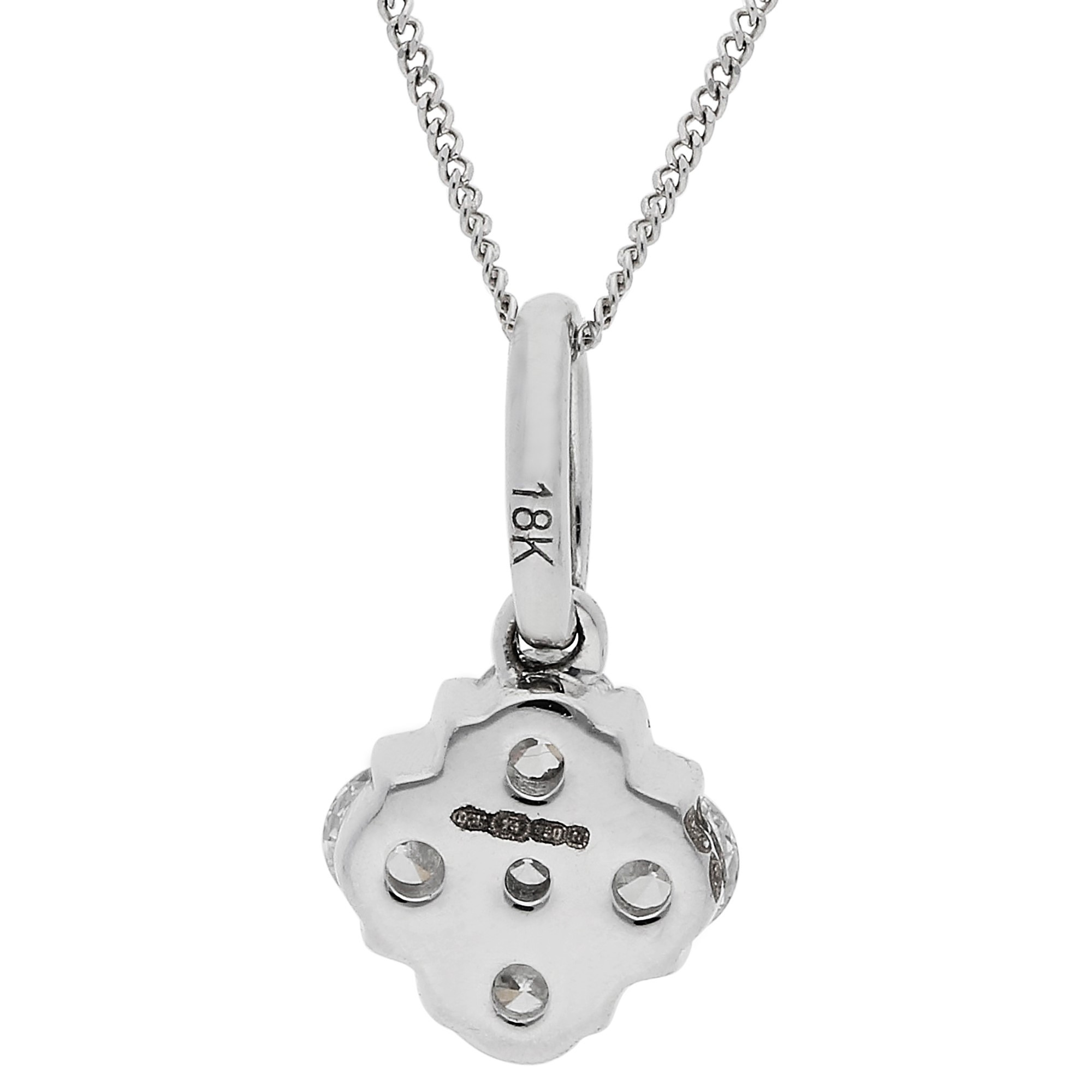 This stunning 18ct white gold pendant features a unique quatrefoil design, with four diamonds and a smaller central diamond, totalling 0.33ct, set in a harmonious arrangement. The polished white gold setting complements the brilliance of the diamonds, giving the piece an elegant and luxurious feel. Suspended from a polished bail and complete with a matching chain, this pendant is perfect for adding a touch of sparkle to any look. A versatile and timeless piece, it makes a wonderful gift or a treasured addition to any jewellery collection.