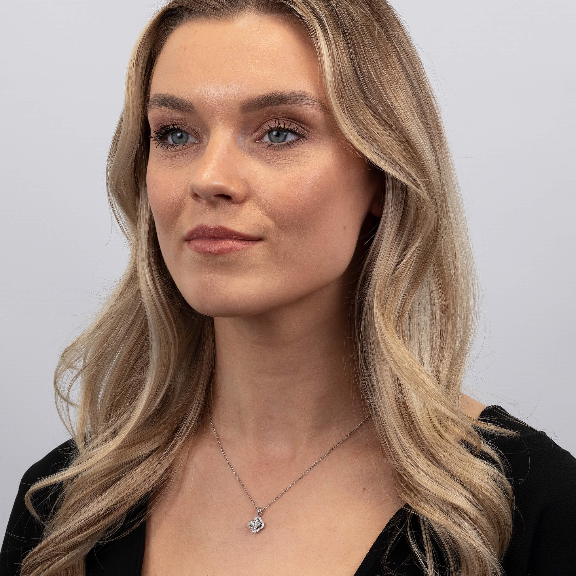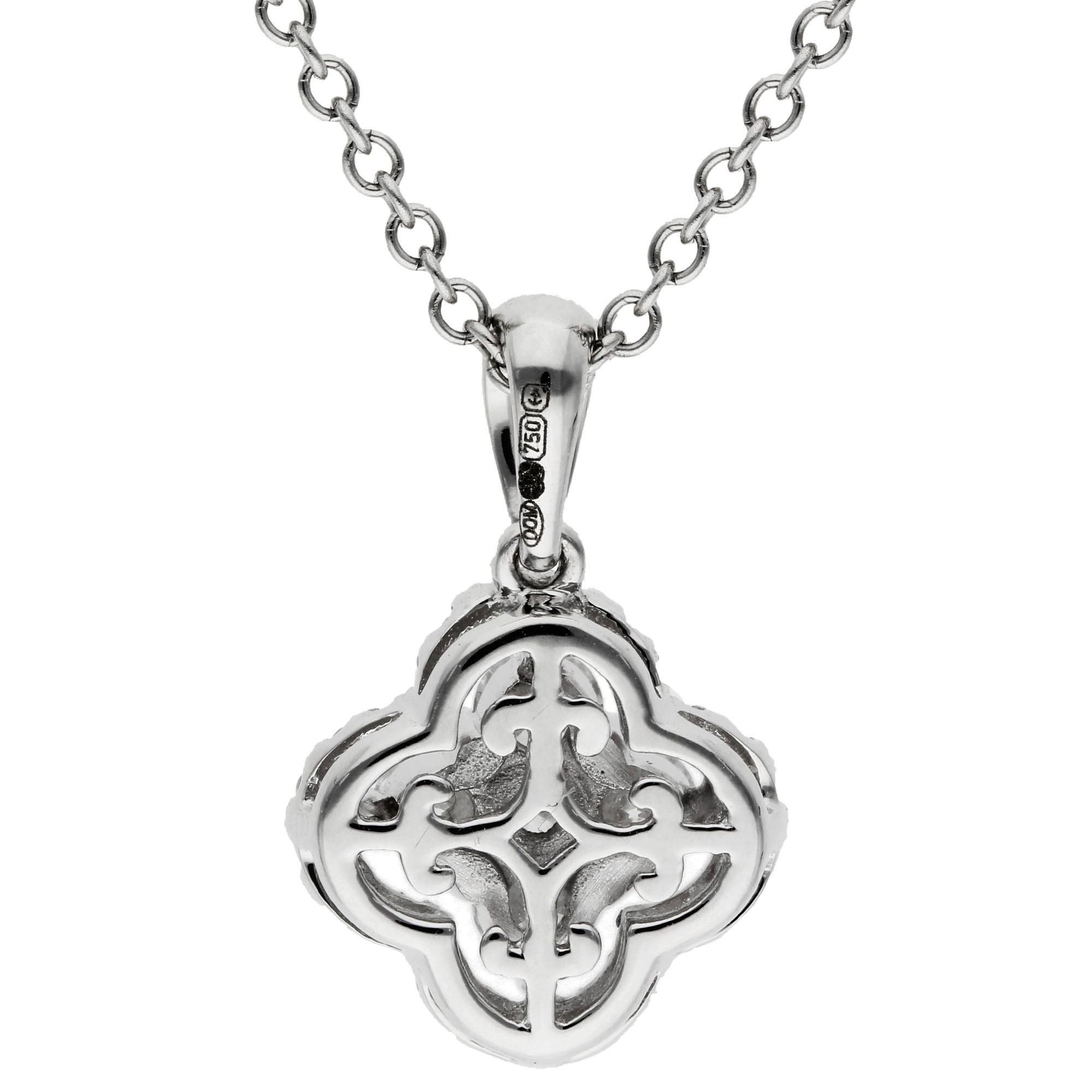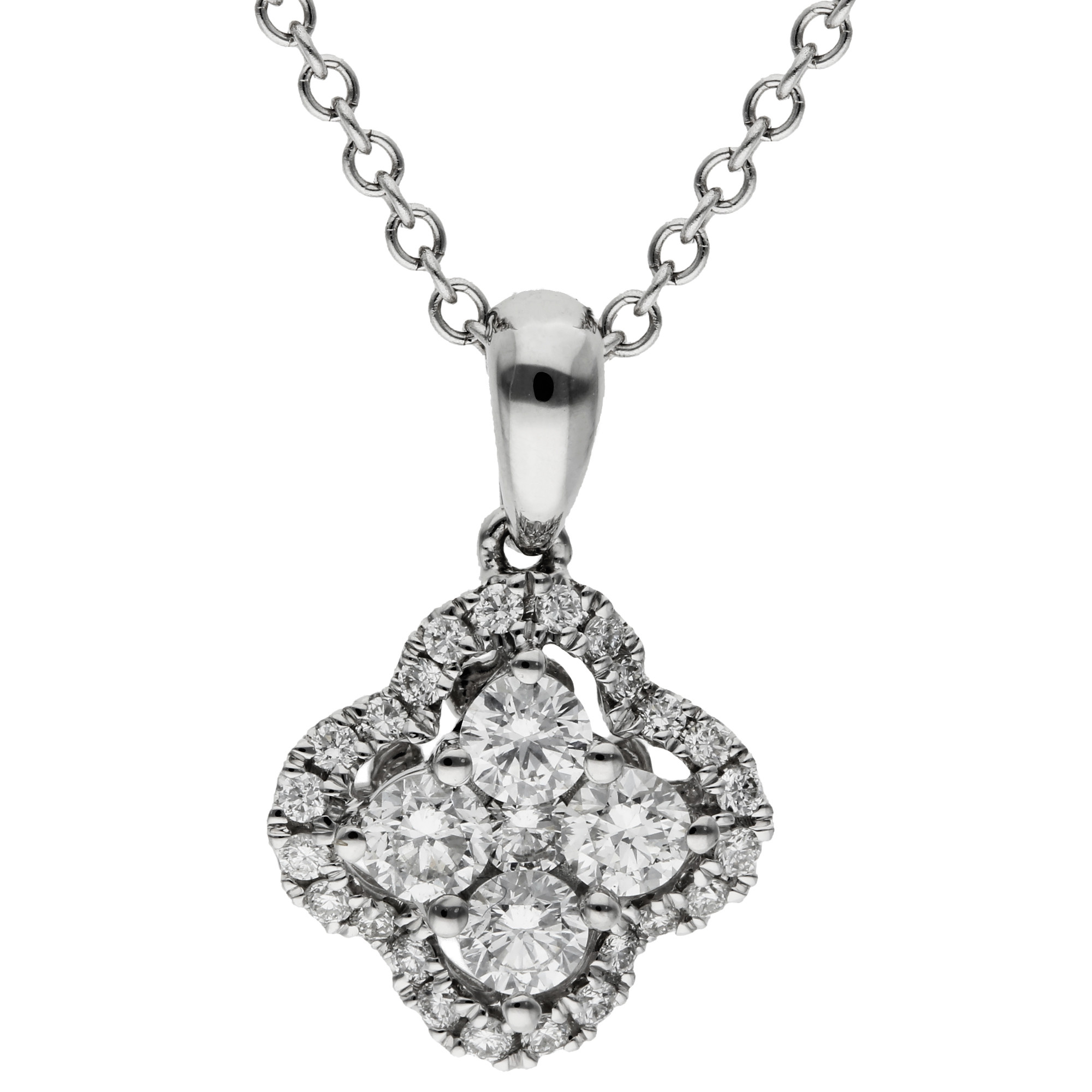 This exquisite 18ct white gold pendant is designed in a striking quatrefoil shape, featuring four central round brilliant diamonds, beautifully framed by a halo of smaller diamonds. The 0.39ct total diamond weight creates a radiant display of light and sparkle. The polished bail ensures the pendant hangs gracefully from the included white gold chain, making it the perfect accessory for both formal and casual occasions. Whether worn as a statement piece or layered with other jewellery, this diamond pendant adds a sophisticated touch to any ensemble. An ideal gift or a luxurious treat for yourself.