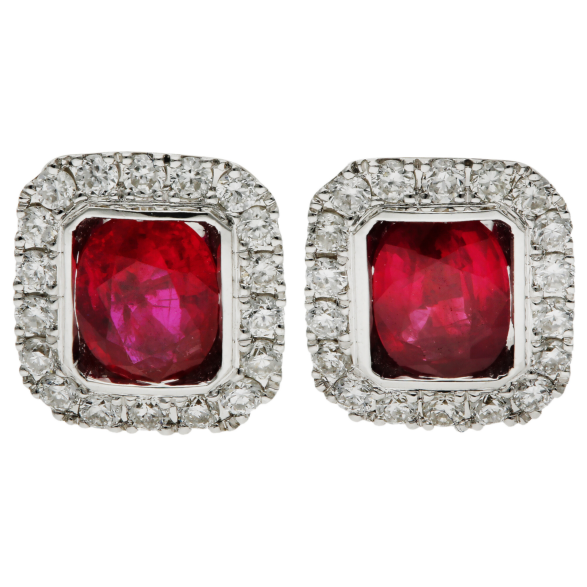Add a touch of luxury to your accessory collection with our exquisite 18ct White Gold Diamond and Ruby Earrings. Designed for sophistication, each earring boasts an oval faceted ruby encased in a rectangle of white gold, surrounded by a halo of dazzling diamonds. These stud earrings are perfect for any occasion, providing a secure fit with their posts and scroll backs. The vibrant red of the rubies, paired with the luminous sparkle of diamonds, makes these earrings a standout piece, suitable for both formal events and everyday luxury. Gift these to a loved one or treat yourself to a timeless piece that exudes classic elegance.