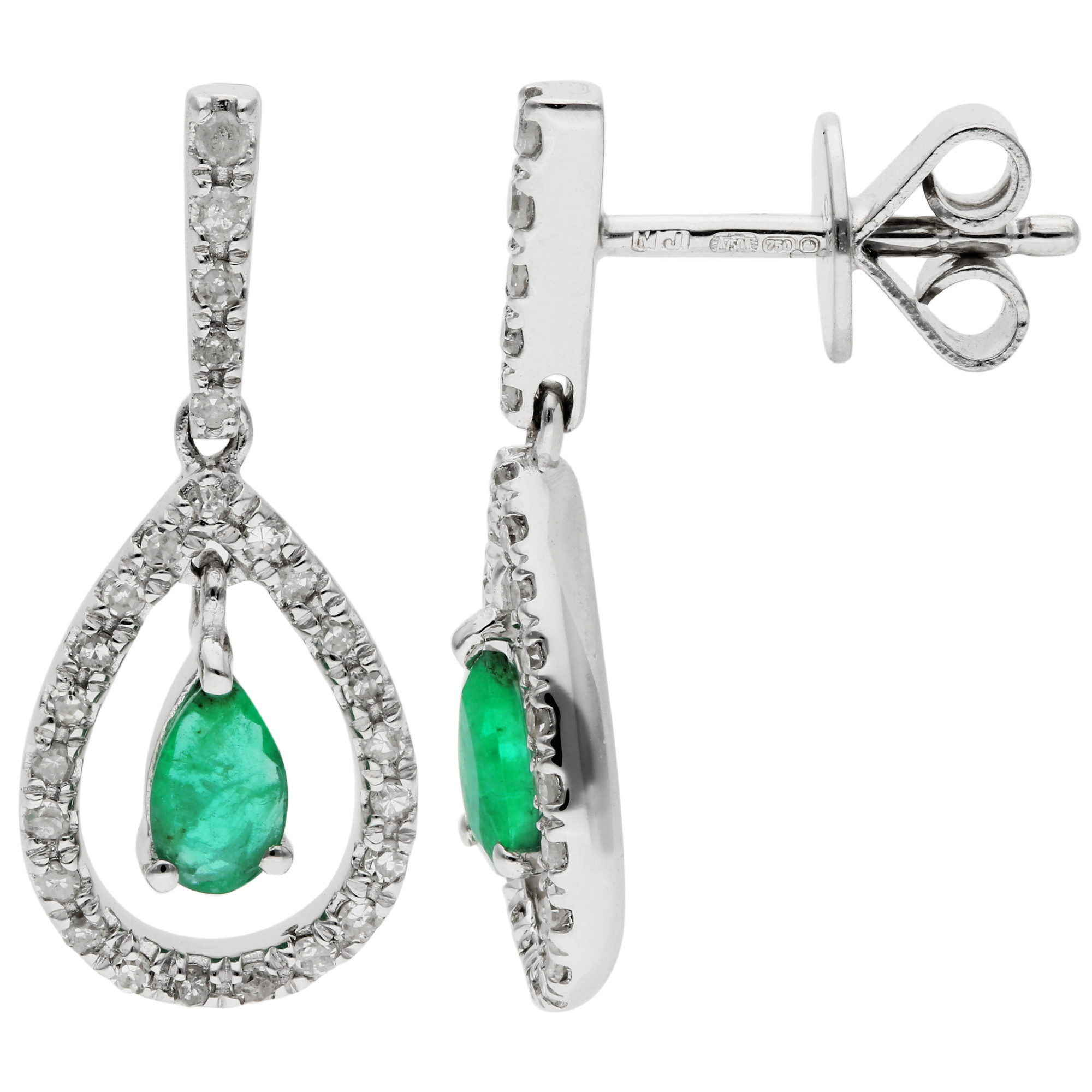 Experience the luxury of 18ct white gold with these exquisite drop earrings. Each earring features a 0.36ct pear shaped emerald, elegantly suspended in an open tear drop shaped halo. The halo is attached to a diamond set bar surmount, adding a touch of brilliance and sophistication. These earrings are designed for women who appreciate fine jewellery and timeless elegance. Perfect for special occasions or to add a touch of glamour to everyday attire, these drop earrings are a versatile addition to any collection. Indulge in the refined beauty of white gold, emeralds, and diamonds with this stunning pair. Shop now to enhance your jewellery collection with these captivating earrings.
