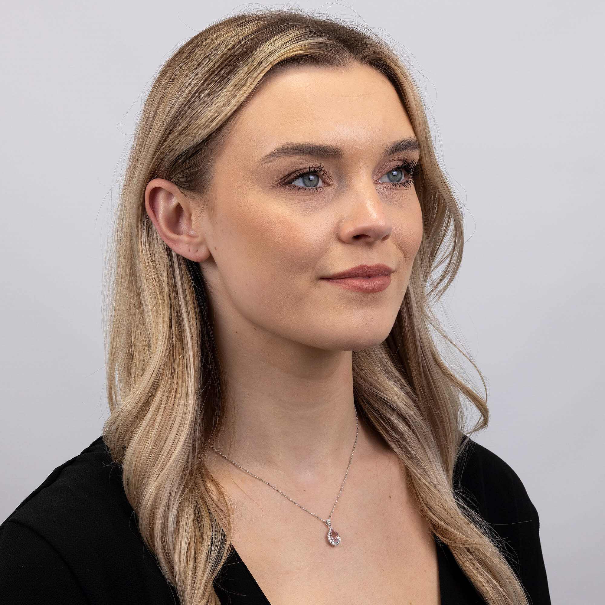 Discover elegance with a hint of romance in our 18ct White Gold Diamond and 1.26ct Morganite Pendant. Featuring a charming pear shaped morganite, this pendant is beautifully surrounded by a halo of fine diamonds, each selected for their clarity and sparkle. The piece is further enhanced by a diamond-set bail, from which it hangs gracefully on a white gold chain. The warm blush of the morganite combined with the brilliance of diamonds creates a stunning accessory that's perfect for elevating your formal and casual ensembles. This pendant is a timeless gift for yourself or a loved one, promising to dazzle and delight for years to come.