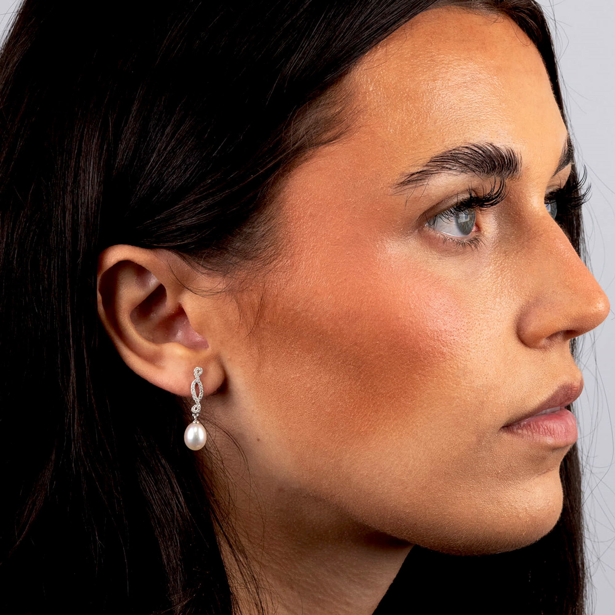 These earrings are made from premium 18ct white gold, offering a durable and pristine setting that complements the brilliant shimmer of the diamonds and the soft lustre of the pearls. They are equipped with posts and scroll backs, ensuring a secure and comfortable fit perfect for any occasion.