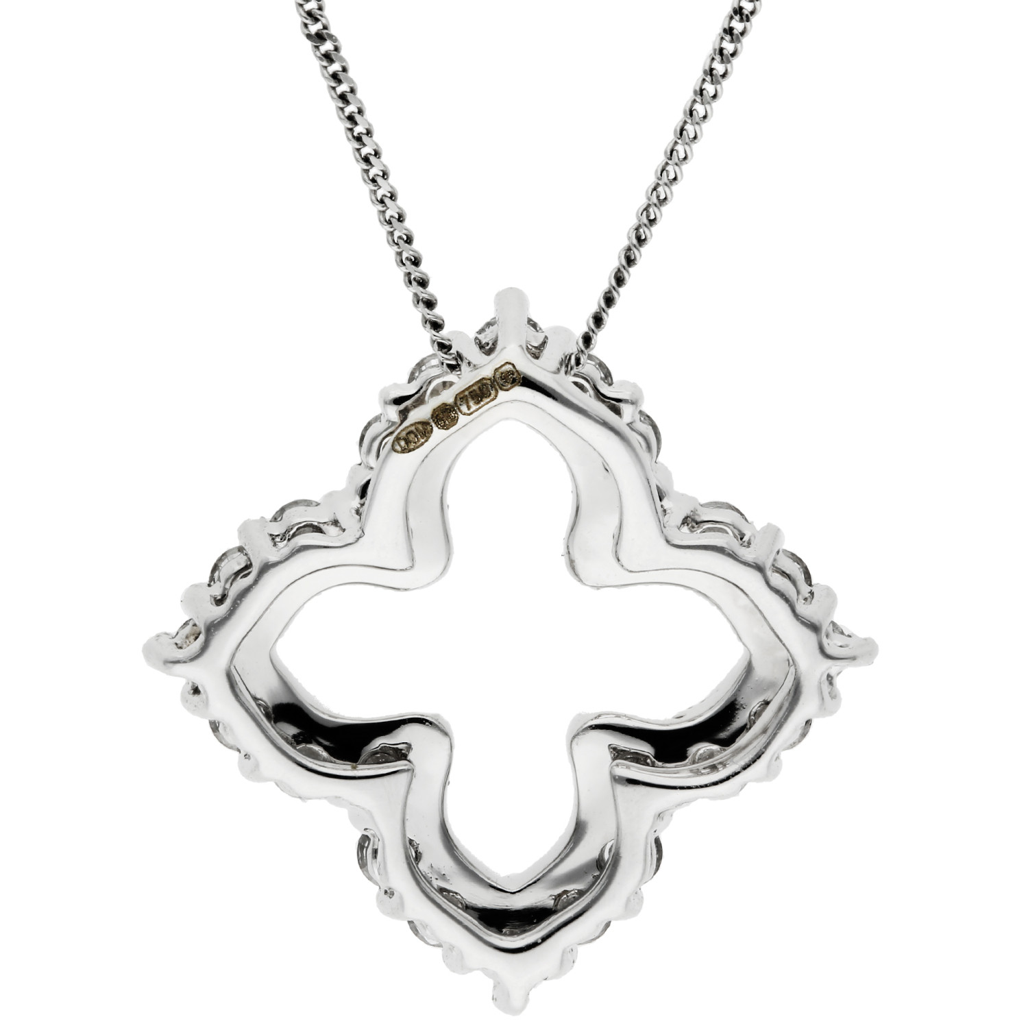 Discover timeless elegance with our 18ct White Gold Quatrefoil Diamond Pendant, a symbol of luxury and sophistication. This exquisite pendant showcases an openwork quatrefoil design, beautifully encrusted with radiant diamonds, each meticulously set to enhance their natural brilliance. The pendant features exquisite millgrain edging along the inside, adding a touch of vintage allure, while the precise claw settings on the outside edge encapsulate each diamond's sparkle.