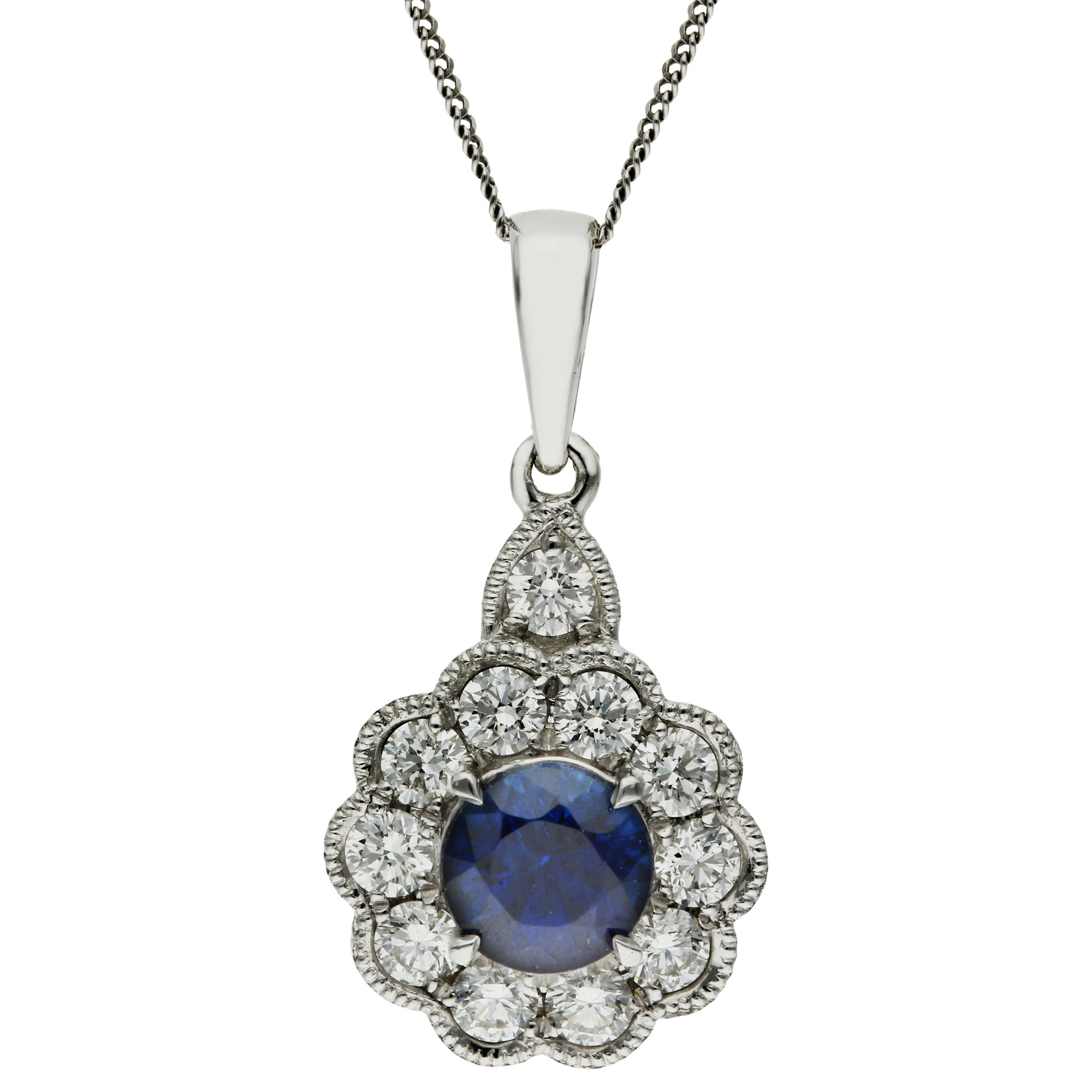 This stunning 18ct white gold pendant showcases a radiant 0.68ct round cut sapphire, surrounded by a floral design of brilliant diamonds. The diamonds are intricately set with milgrain edging, adding an extra layer of detail and texture to the design. The deep blue sapphire contrasts beautifully with the sparkling diamonds, making this pendant a true standout piece. A polished bail enhances the elegance of the pendant, which is finished with a sleek white gold chain. Perfect for adding a touch of luxury to any outfit, this pendant is a wonderful choice for women who appreciate timeless beauty and exceptional craftsmanship.