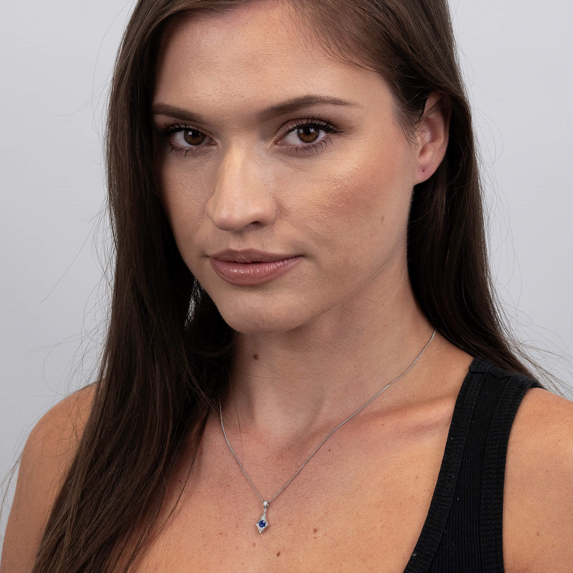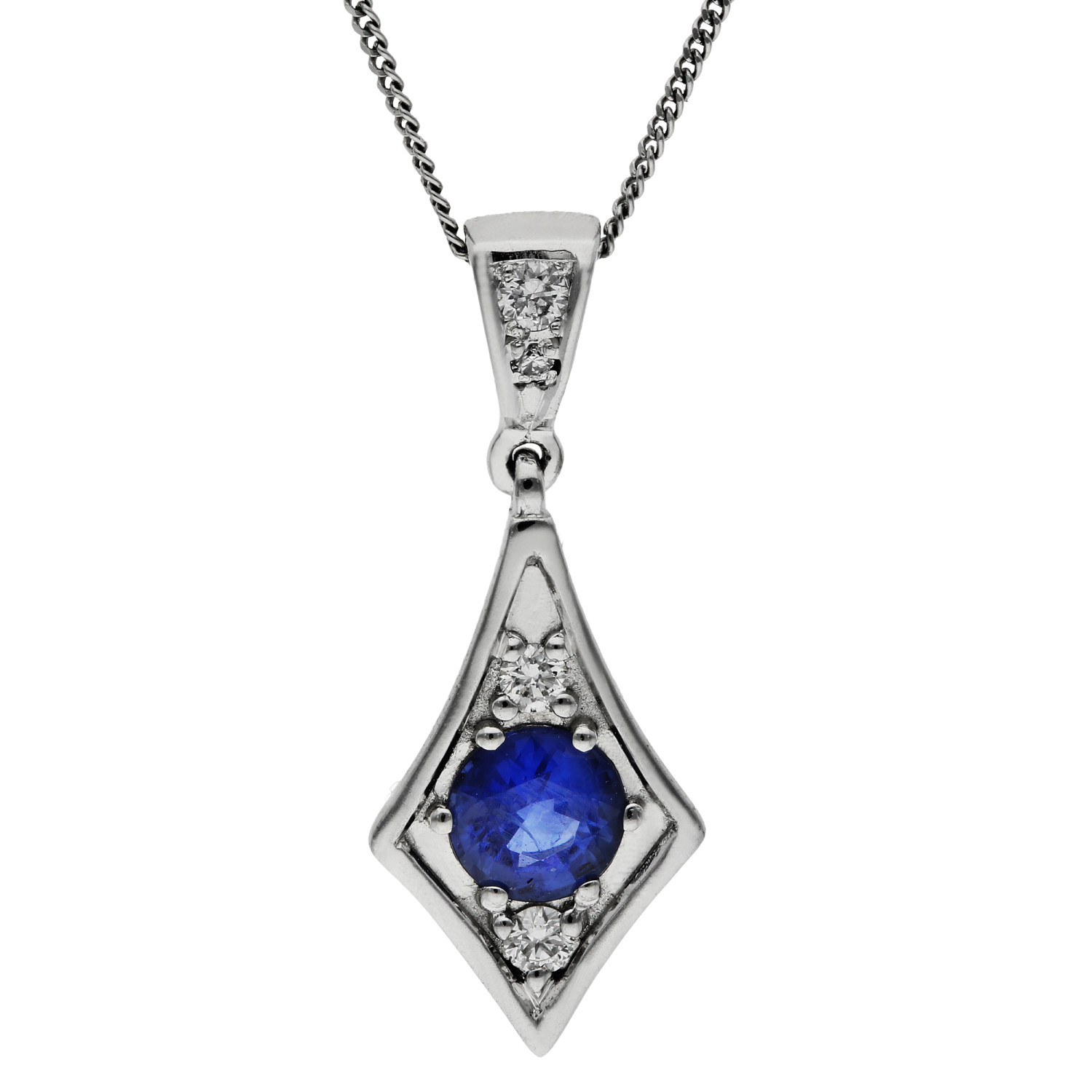 Elevate your jewellery collection with this stunning 18ct white gold pendant, showcasing a beautifully crafted kite shape. Centred with a captivating 0.30ct sapphire, this pendant exudes elegance and refinement. Flanked by meticulously set diamonds above and below the sapphire, it radiates a luxurious charm. The pendant is further enhanced by a diamond-set bail, making it a true statement piece. Dangling gracefully from a sleek white gold chain, this pendant is designed for those who appreciate exquisite craftsmanship and timeless design. Whether it's a gift for a loved one or a treat for yourself, this sapphire and diamond pendant is sure to impress.