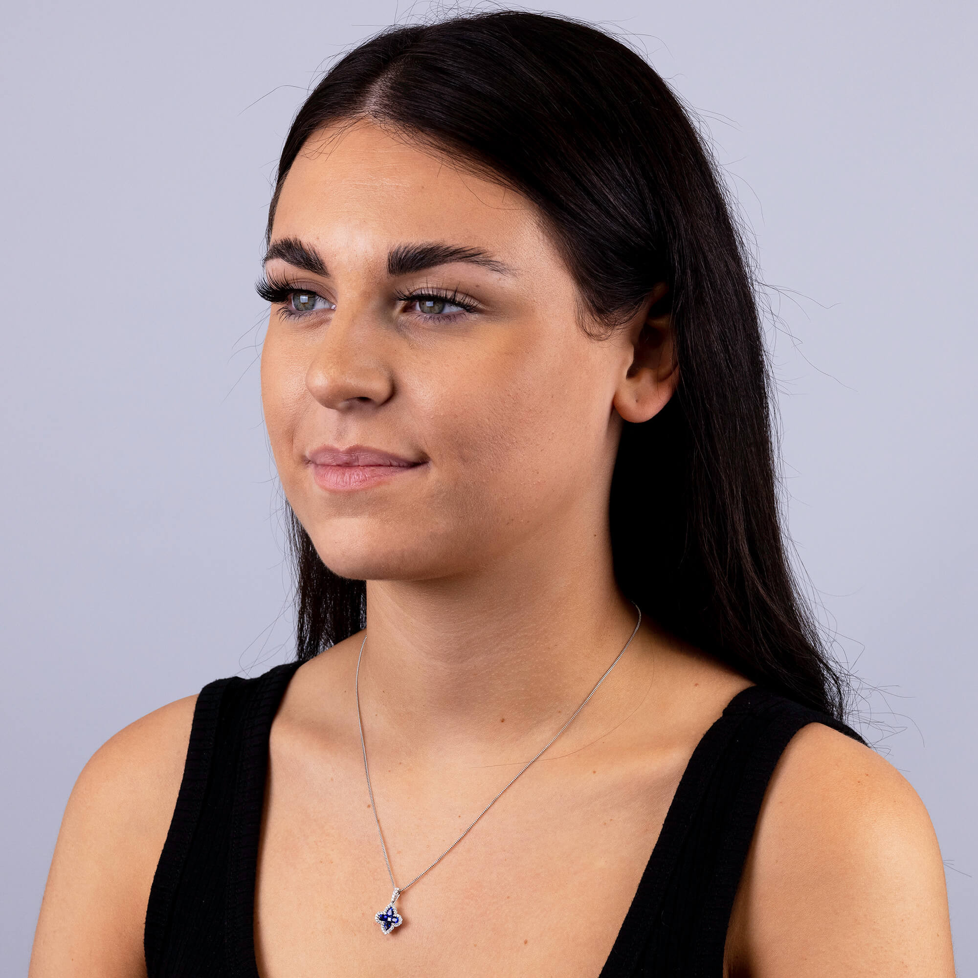 This exquisite 18ct white gold pendant showcases a captivating quatrefoil style design, featuring four sapphires, two teardrop shaped and two oval, framed by a halo of shimmering diamonds. A small princess cut diamond sits at the centre, creating a radiant focal point. The intricate design is suspended from a diamond set bail, with a sleek white gold chain completing the look. Perfect for adding a touch of luxury to any outfit, this pendant is a sophisticated choice for those who appreciate fine craftsmanship and classic beauty. Whether as a gift or a personal indulgence, this sapphire and diamond pendant will be cherished for years to come.