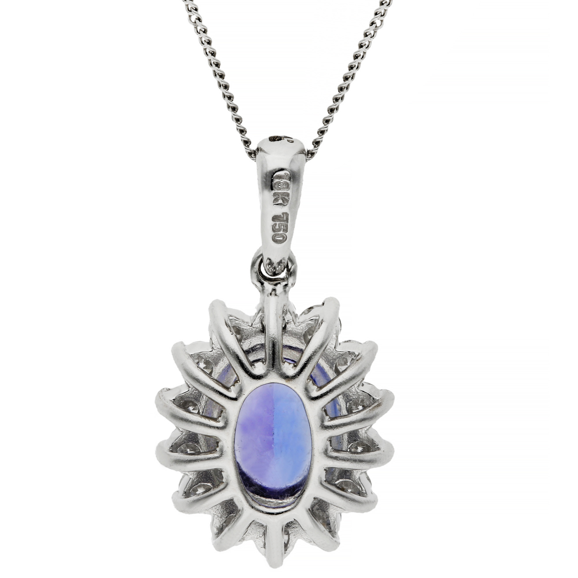 Add a touch of glamour to any look with this exquisite 18ct white gold Tanzanite and diamond cluster pendant. Designed with sophistication in mind, it features a captivating oval cut Tanzanite at the centre, boasting a vivid purplish blue colour that is both unique and enchanting. Framed by a delicate surround of dazzling white diamonds, the setting draws the eye with its radiant sparkle and classic cluster design.