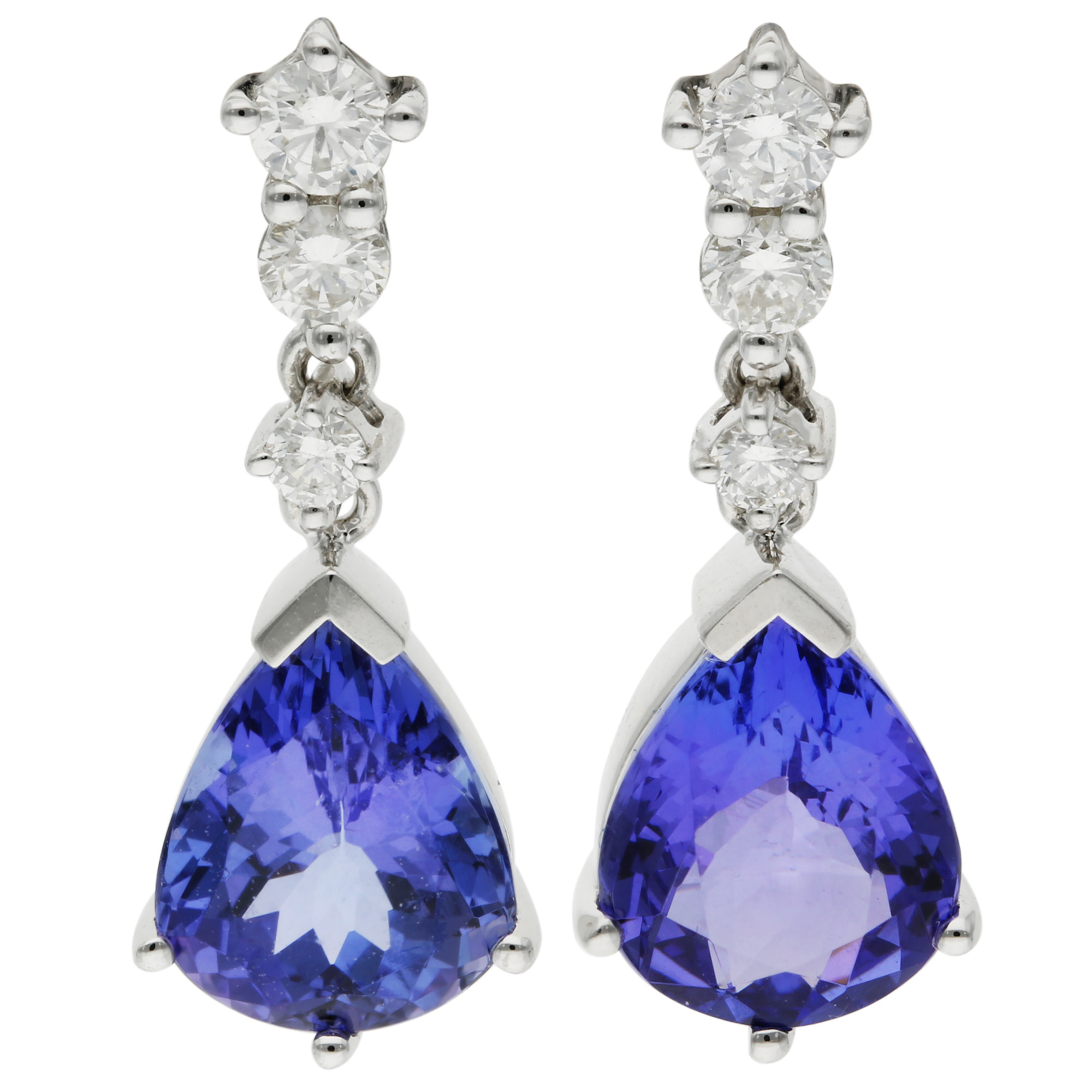 Step into a world of captivating elegance with our 18ct White Gold Diamond & 1.70ct Tanzanite Drop Earrings. Each earring is a masterpiece of design, featuring a stunning claw set pear shaped tanzanite that exudes a mesmerizing violet-blue hue. This exquisite gemstone is known for its unique and vibrant colour, symbolizing luxury and sophistication. Suspended elegantly from these alluring tanzanites is a succession of three diamonds, descending in size, adding a graceful flow and a brilliant sparkle to the design. Crafted in pristine 18-carat white gold, these women's earrings provide a sleek and contemporary setting that perfectly complements the cool tones of the tanzanite and the timeless brilliance of the diamonds. The combination of the teardrop tanzanite and the cascading diamonds creates a striking and luxurious look, perfect for special occasions or adding a touch of glamour to your everyday style. These Tanzanite & Diamond Drop Earrings are a true embodiment of elegance and an exquisite addition to any fine jewellery collection.