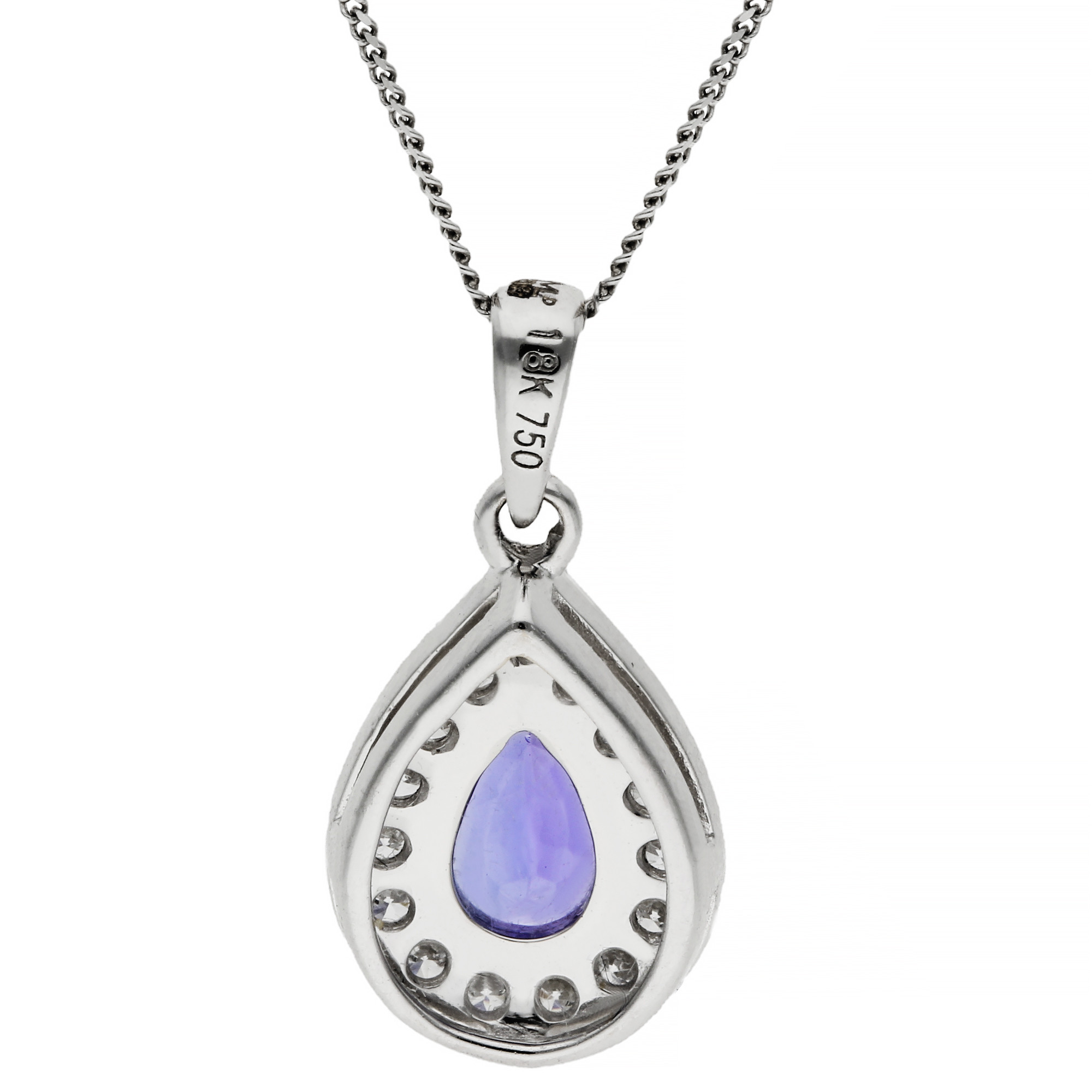 This exquisite 18ct white gold pendant showcases a stunning 0.38ct pear shaped tanzanite, encircled by a halo of shimmering diamonds with milgrain edging for added detail. The soft glow of the tanzanite is beautifully highlighted by the diamonds, creating a luxurious and elegant design. Complete with a polished bail and a matching white gold chain, this pendant is perfect for adding a touch of glamour to any ensemble. Whether worn for a formal event or as a statement piece, this tanzanite and diamond pendant is a timeless addition to any jewellery collection.