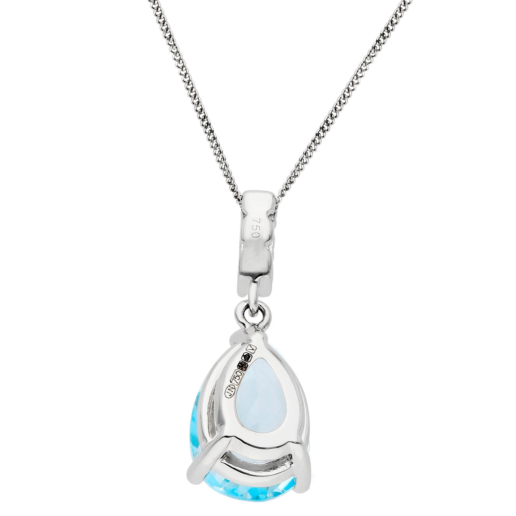 This elegant 18ct white gold pendant showcases a breath taking 2.28ct pear shaped blue topaz, expertly set in claws for maximum brilliance. The pendant features a trio of claw set diamonds above the topaz, adding extra sparkle and sophistication. The vibrant blue hue of the topaz is beautifully complemented by the diamonds, creating a refined and luxurious piece. Suspended from a matching white gold chain, this pendant is perfect for adding a touch of glamour to both casual and formal outfits. A timeless treasure, this topaz and diamond pendant makes an unforgettable gift or a cherished addition to any jewellery collection.