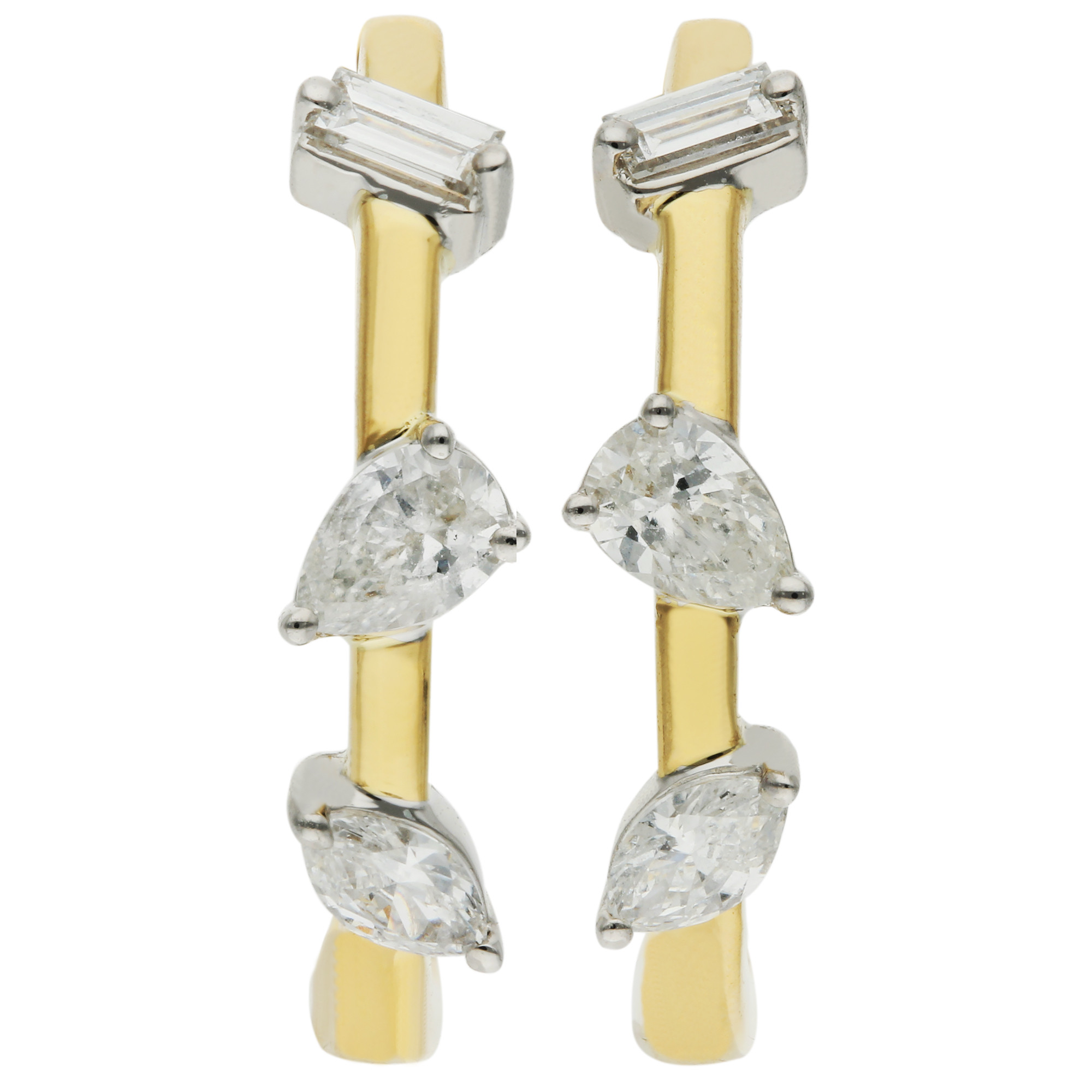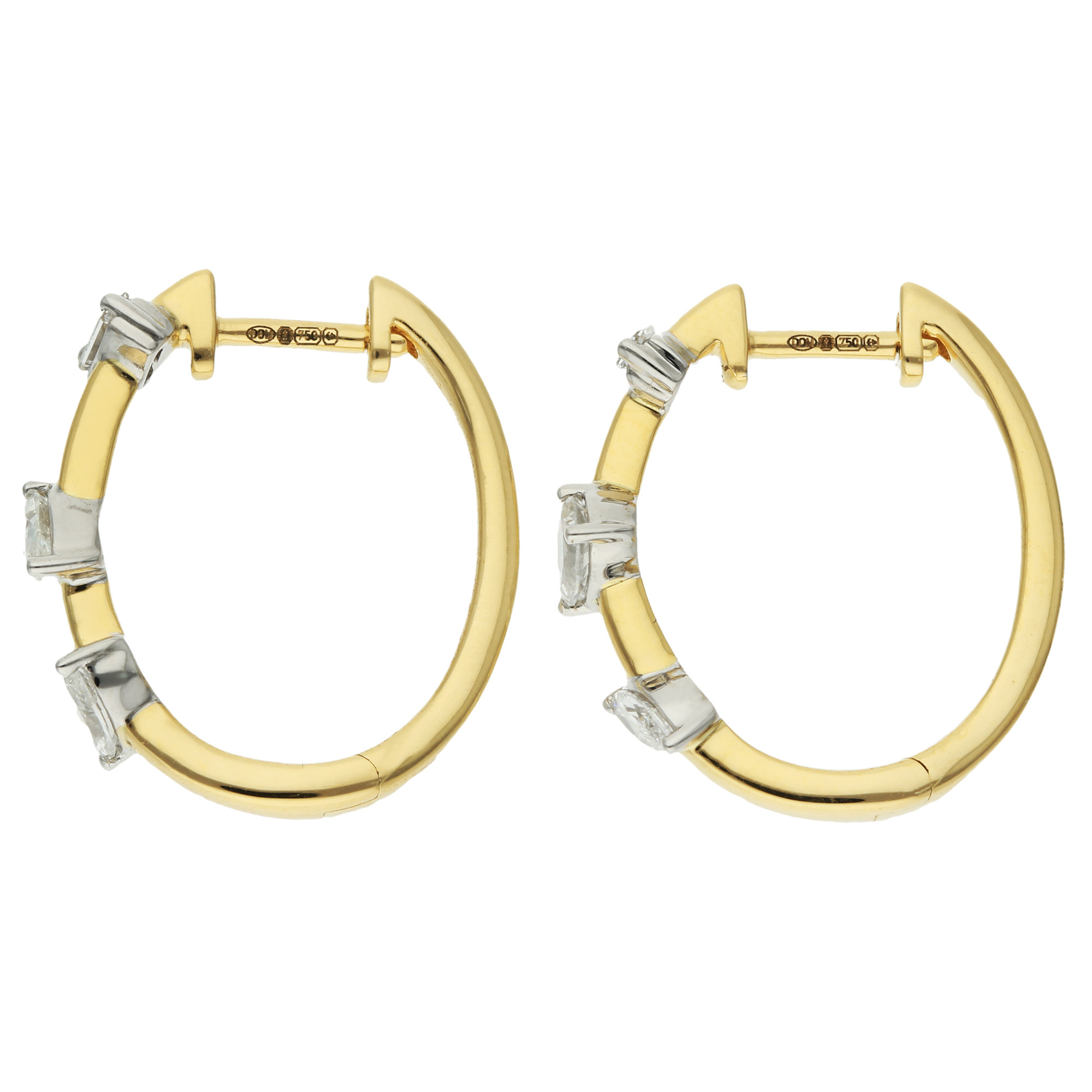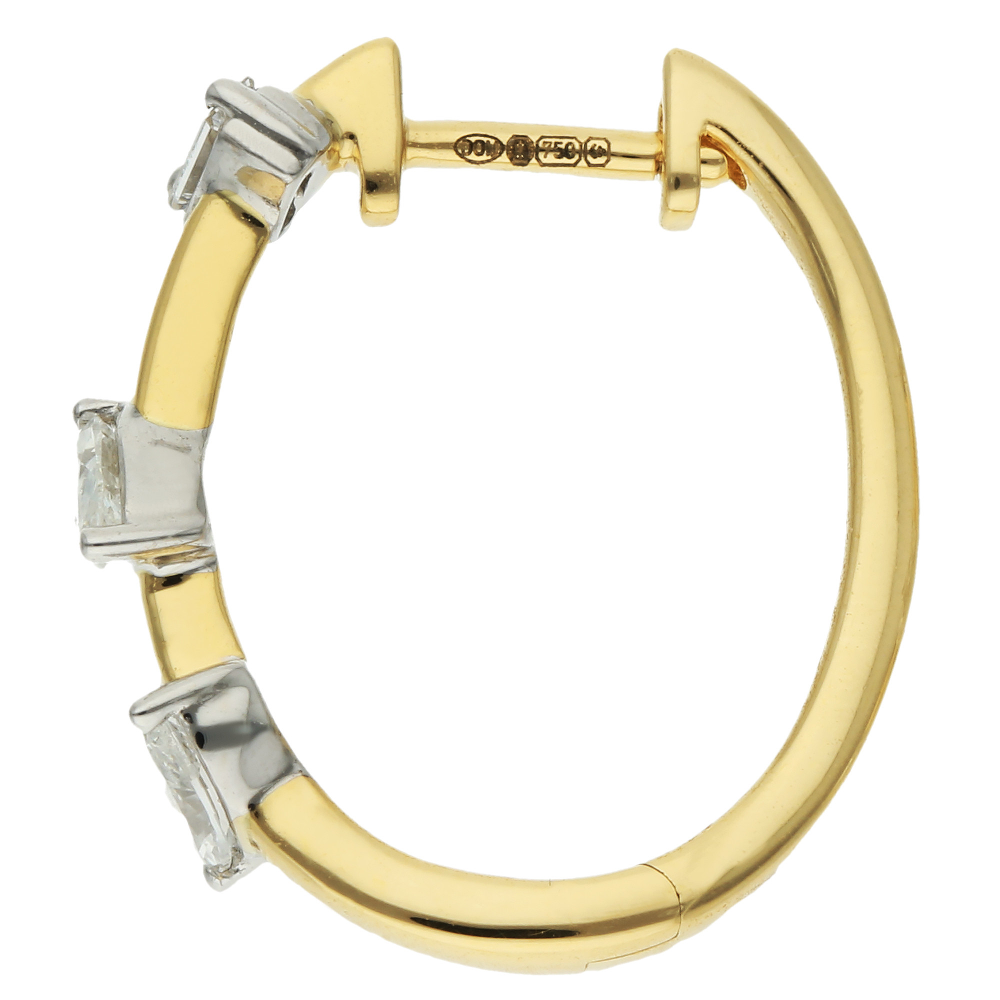 Discover the timeless beauty of our 18ct yellow gold and diamond hoop earrings, designed to captivate and charm. These earrings are adorned with a carefully selected mix of diamonds, including marquise, princess, and pear cuts, totalling 0.49 carats. Set against the warm tones of yellow gold, the diamonds are positioned on the front of each hoop, creating a display of dazzling light with every turn. The hinged design ensures that these earrings are as practical as they are beautiful, providing a comfortable fit and easy closure. Ideal for adding a luxurious touch to any outfit, these diamond hoop earrings are a stunning investment piece that will enhance your jewellery collection with elegance and flair.