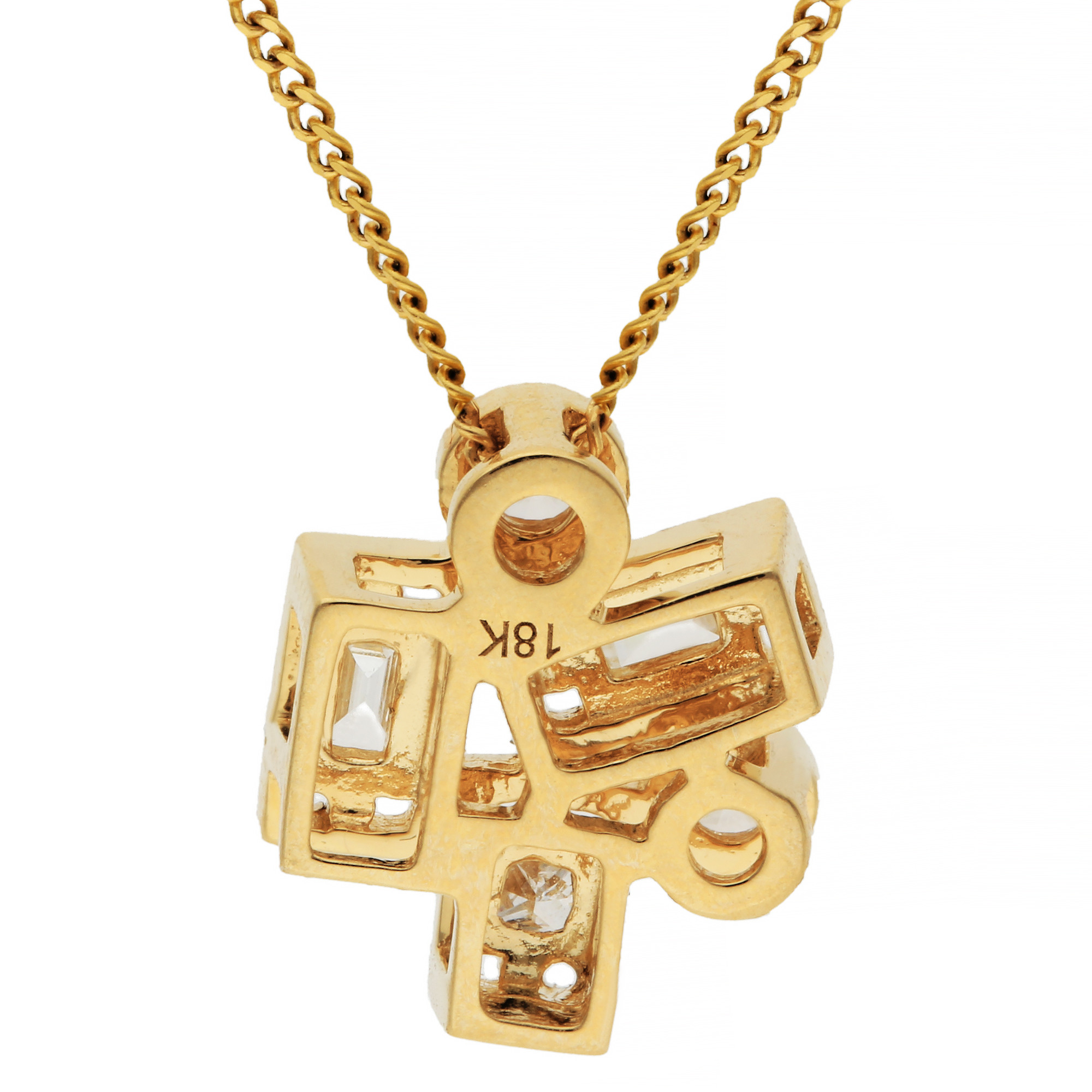 This exquisite 18ct yellow gold pendant features a striking confetti-inspired design, created from an array of round, baguette, and princess cut diamonds. The 0.27ct diamonds are individually claw set, allowing each one to shine brilliantly in its own setting, while the combination of cuts adds depth and dimension to the piece. Suspended from a polished yellow gold chain, this pendant offers a beautiful blend of modern style and classic elegance. Whether as a thoughtful gift or a personal indulgence, this diamond pendant is a timeless accessory that adds a touch of sparkle to any outfit.