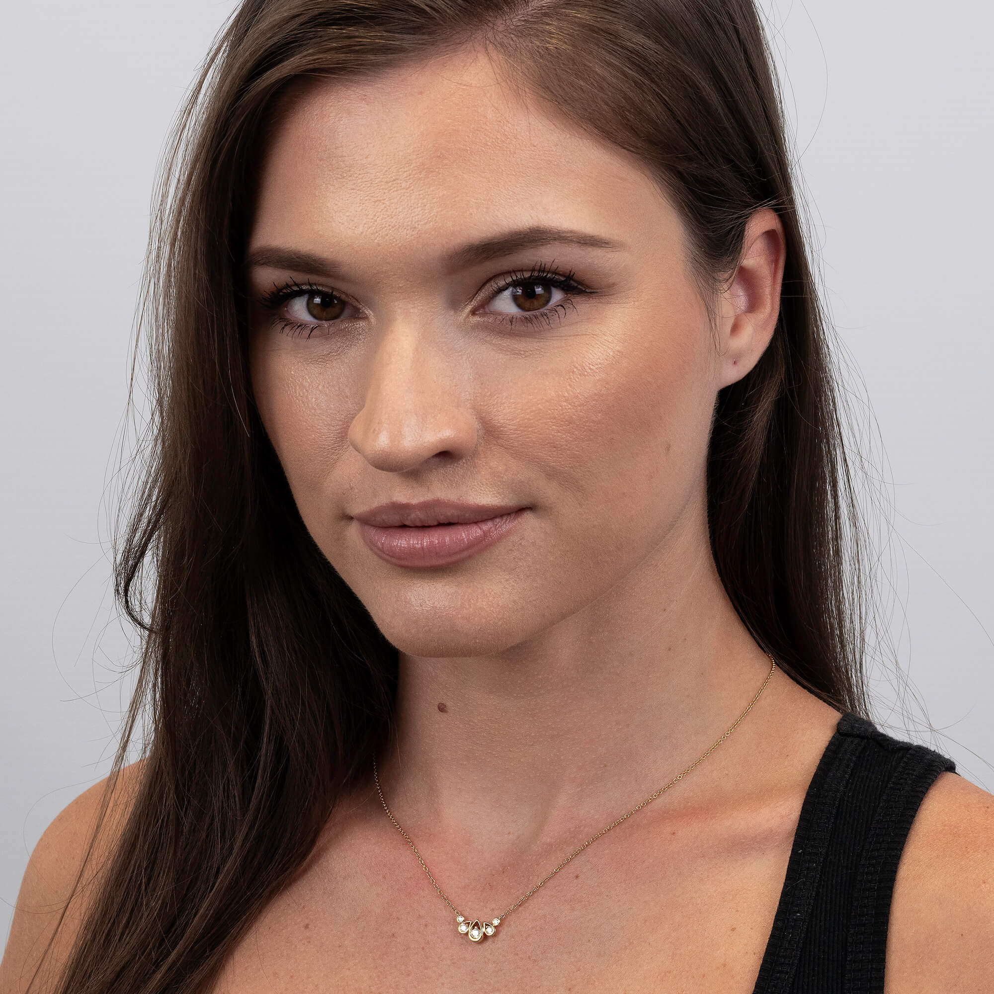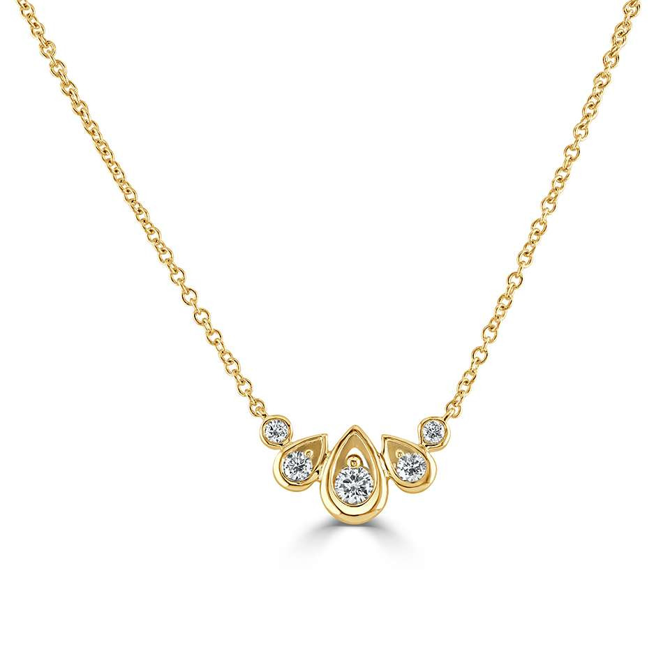 Elevate your look with this stunning 18ct yellow gold diamond necklace, designed to exude elegance and sophistication. The crescent shaped pendant features three teardrop shaped settings, framed by a round setting at each end, all showcasing dazzling round brilliant diamonds. With a total diamond weight of 0.27ct, this necklace radiates timeless beauty.