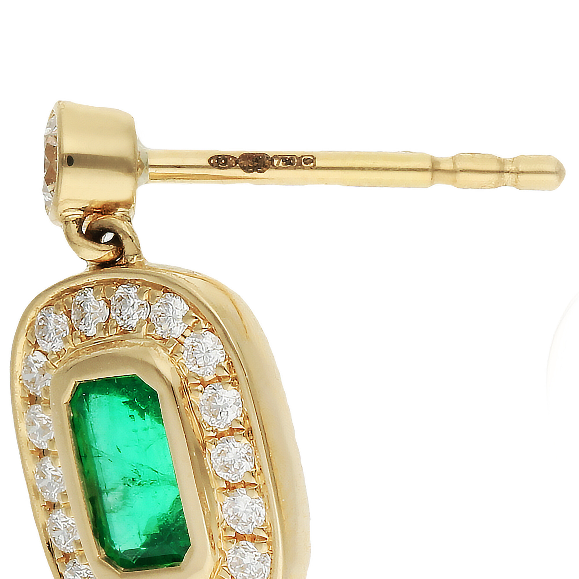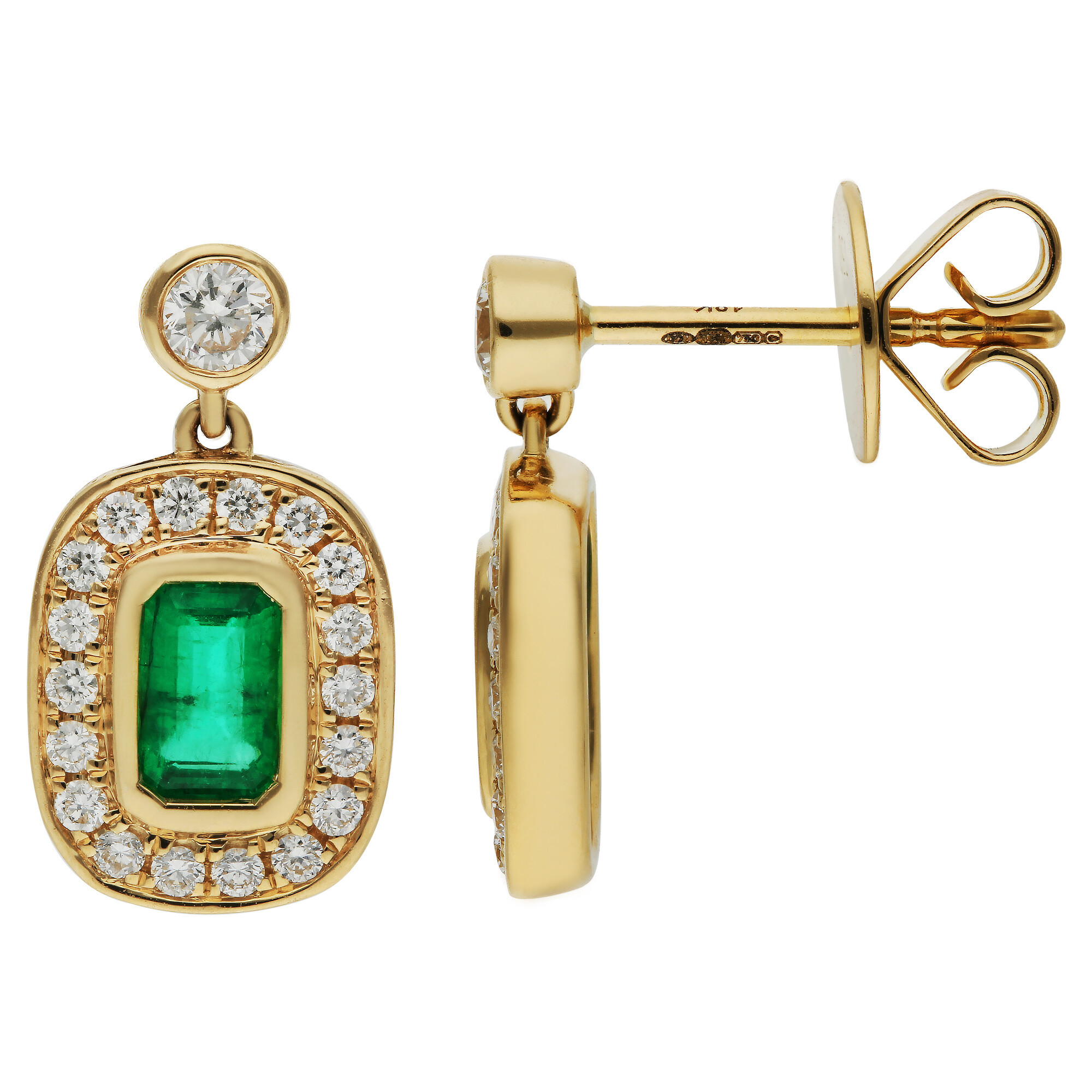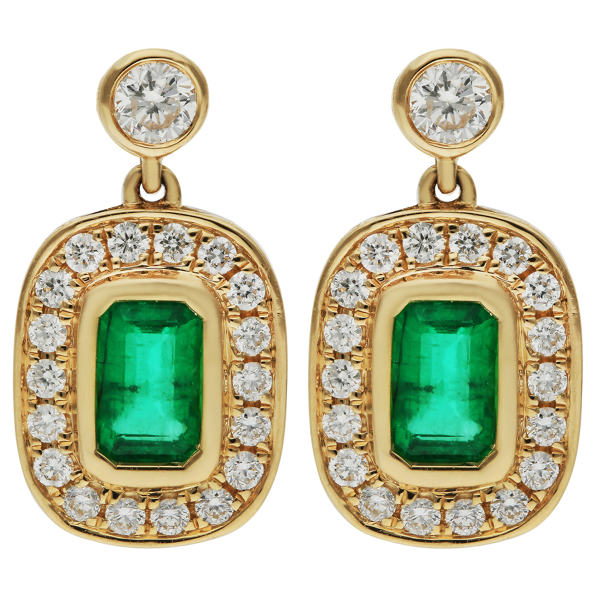 These exquisite 18ct yellow gold womens earrings blend refined craftsmanship with timeless sophistication. At the heart of each design sits an emerald cut emerald, bezel set to highlight its rich green tone and classic shape. Surrounded by a halo of sparkling diamonds, the emerald takes centre stage in a display of light and colour that catches the eye from every angle.