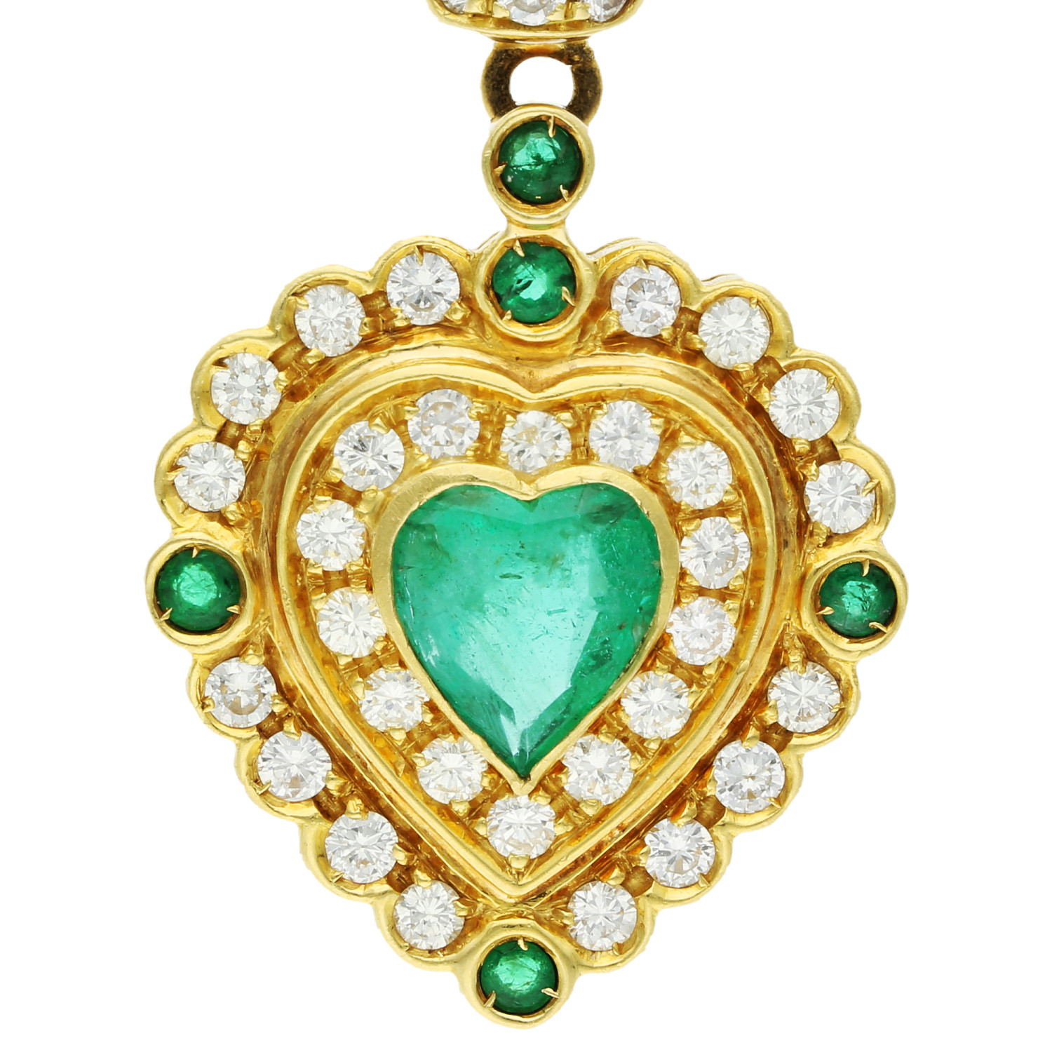 Discover the enchanting beauty of our Pre-owned 18ct Yellow Gold Diamond & Emerald Heart Pendant. This exquisite piece features a heart-shaped emerald at its core, elegantly framed by glittering diamonds that enhance the vivid green shade of the central stone. The design is further enriched with round faceted emeralds at each quarter, set against the luxurious backdrop of scalloped 18ct yellow gold edging.