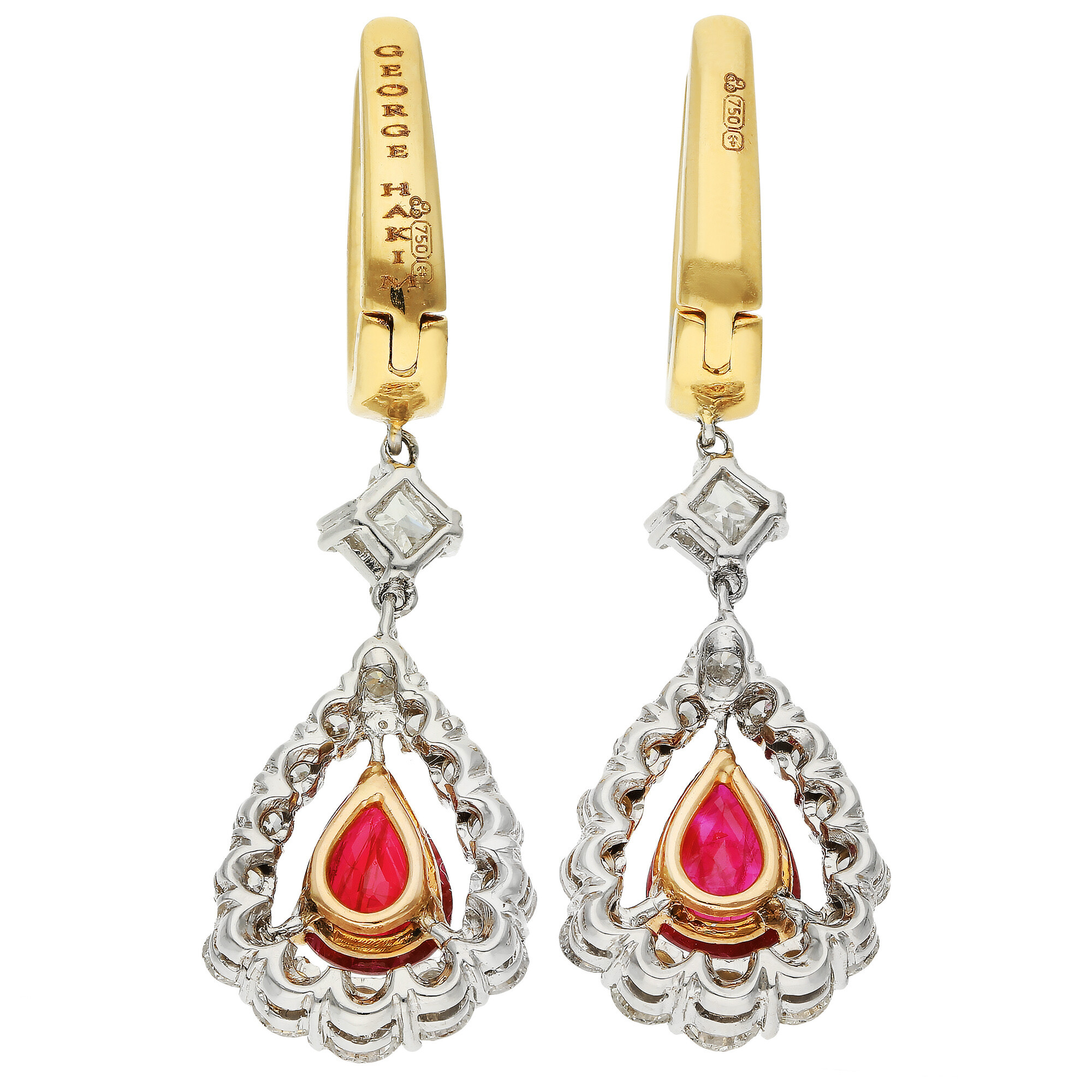 Experience timeless elegance with our 18ct Yellow Gold Diamond & Ruby Earrings, a captivating addition to any luxury jewellery collection. Each earring showcases a luscious pear shaped ruby, beautifully framed by a halo of shimmering diamonds. A single princess cut diamond rests above the ruby, enhancing the sparkle, while the oval diamond-encrusted hinged hoop provides both security and an additional layer of luxury. These exquisite pre-owned earrings are perfect for those seeking a piece that combines classic glamour with striking modern design, ideal for special occasions and celebrations.