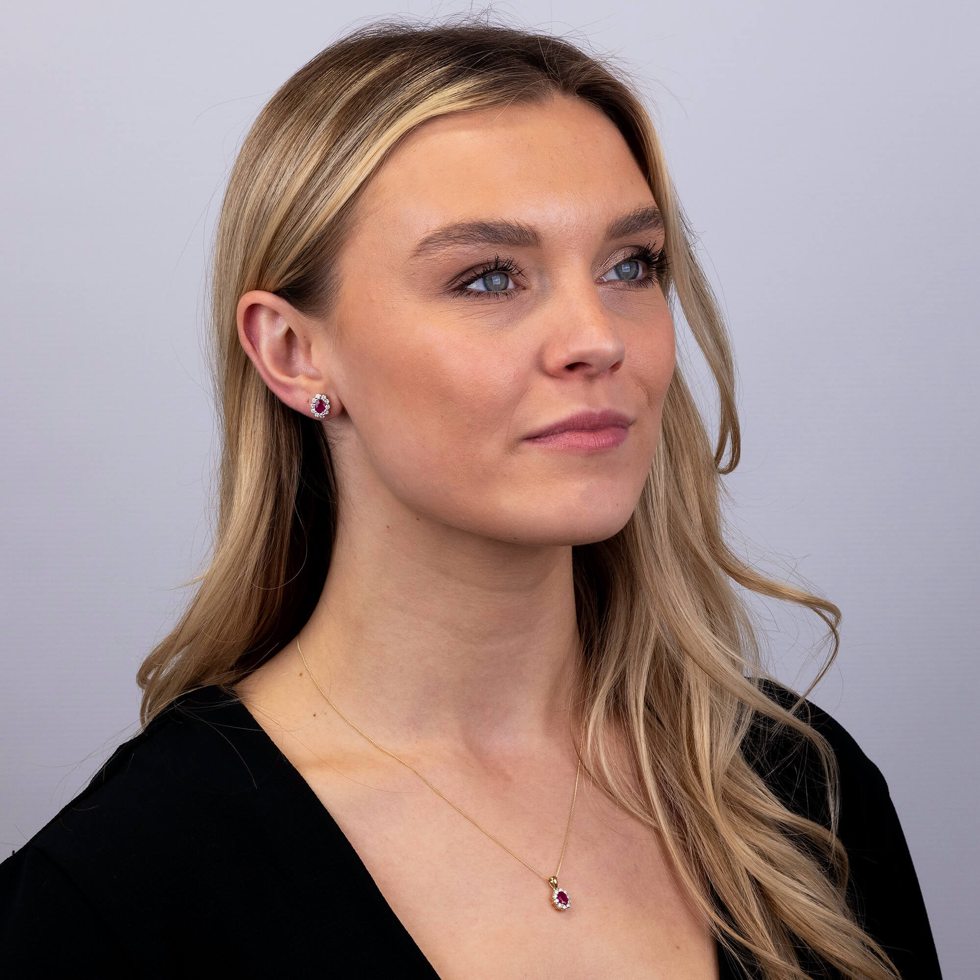 This stunning pendant necklace showcases a striking oval cut ruby, surrounded by a halo of dazzling diamonds that enhance its radiant beauty. The polished bail adds a refined finish, allowing the pendant to hang effortlessly from the included chain. The combination of the vivid red ruby and the sparkling diamonds makes this necklace a captivating piece, perfect for both formal events and daily wear. Ideal for those who appreciate timeless elegance, this ruby and diamond necklace is a sophisticated addition to any jewellery collection. A perfect gift or a luxurious addition to your own collection.