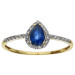 This refined 18ct yellow gold sapphire and diamond ring captures the essence of timeless elegance with a modern twist. At the heart of the piece is a pear shaped faceted sapphire, rich in deep blue colour and full of character. Surrounding the central stone is a delicate halo of sparkling diamonds, which enhances the brilliance of the sapphire and draws the eye with its radiant shimmer. Additional diamonds set along the shoulders bring even more sparkle to this graceful design.